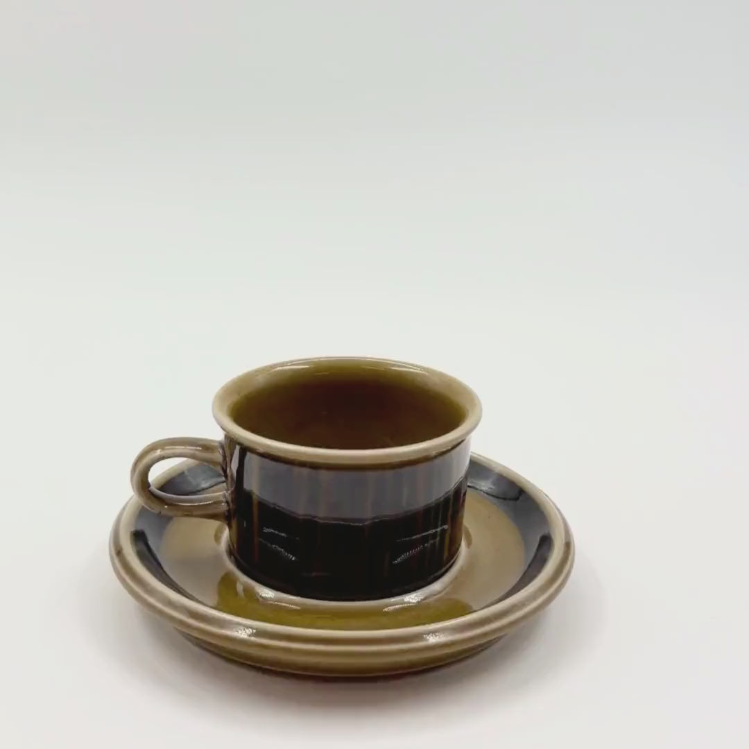 Embrace timeless Finnish design with the Arabia Kosmos Mocha Cup and Saucer, designed by Gunvor Olin-Grönqvist and produced by Arabia Finland between 1963 and 1976. This vintage piece features the iconic hand-painted vertical stripe motif in deep earthy tones, a hallmark of the Kosmos series. Crafted in durable stoneware, it reflects the elegance and functionality of mid-century Nordic ceramics. Whether for display or daily use, this collectible set brings authentic vintage charm and Finnish craftsmanship to your home.