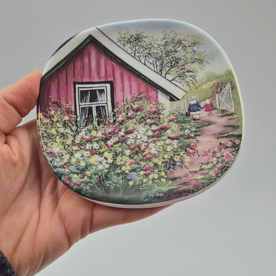 Celebrate the charm of home and familiar landscapes with this Arabia “Kotiseutu” wall plate. Designed by Anita Rantanen-Siewers (1995), its delicate illustration evokes comfort, serenity, and the gentle beauty of Finnish homeland, making it a collectible treasure.