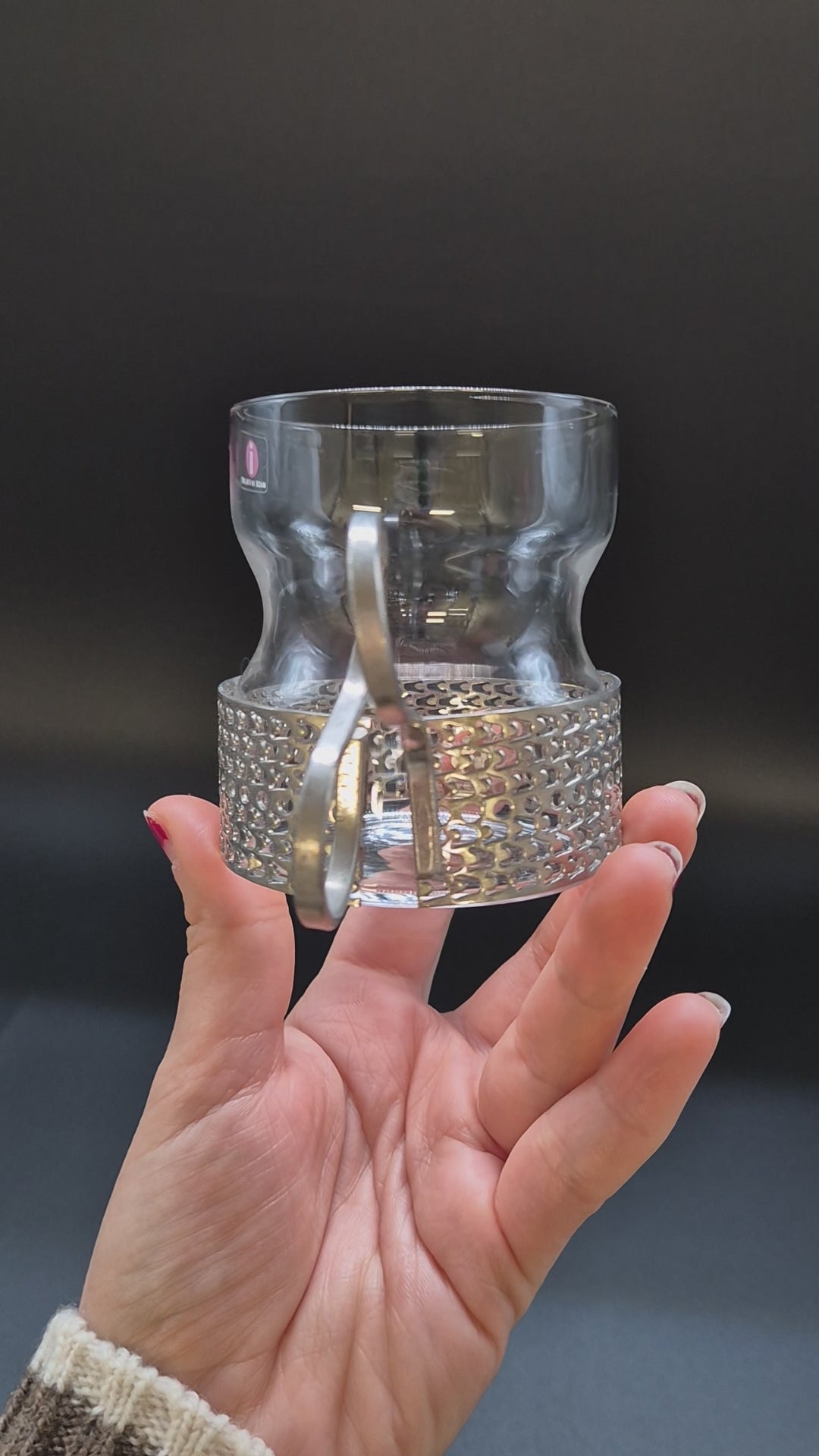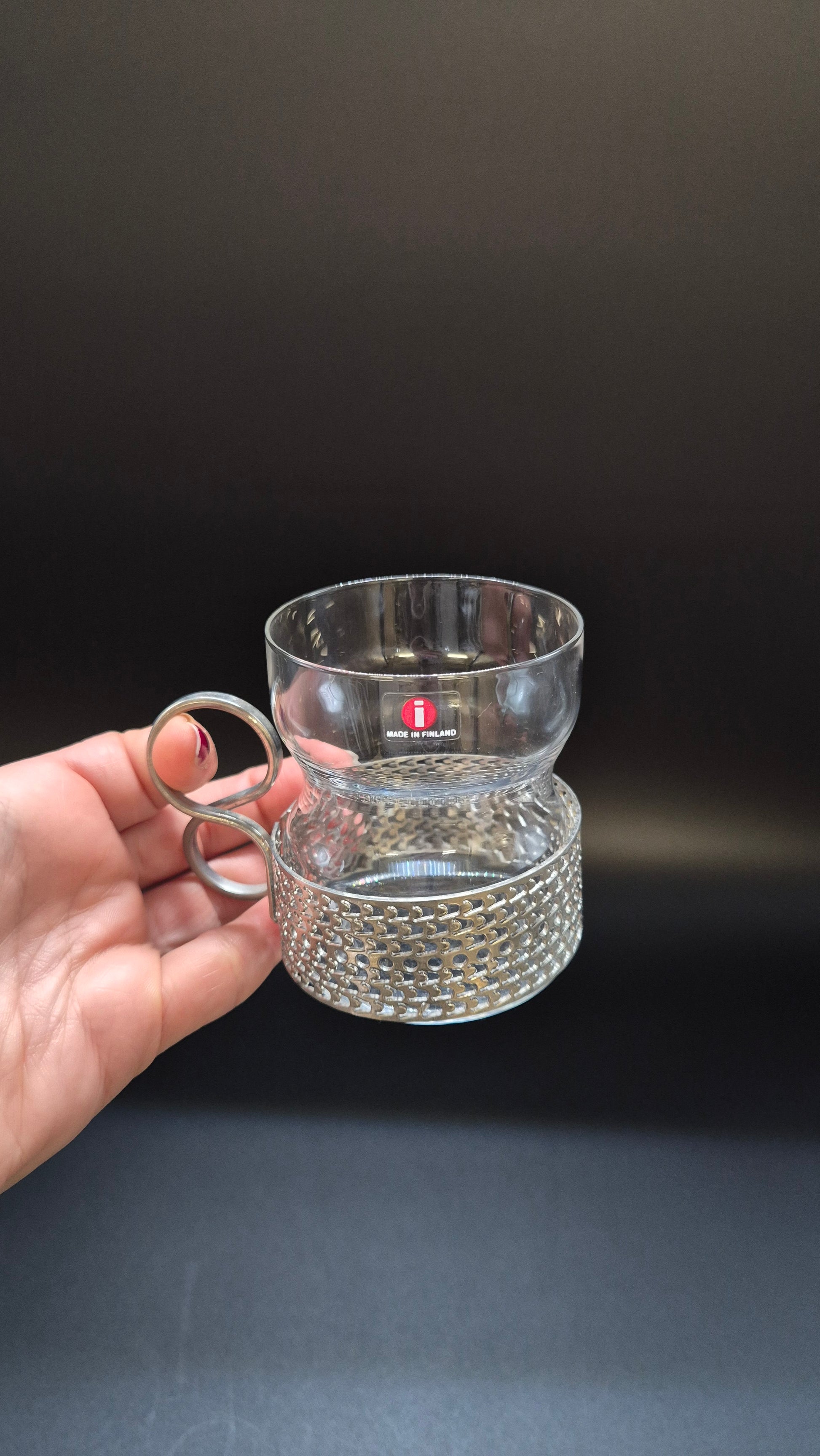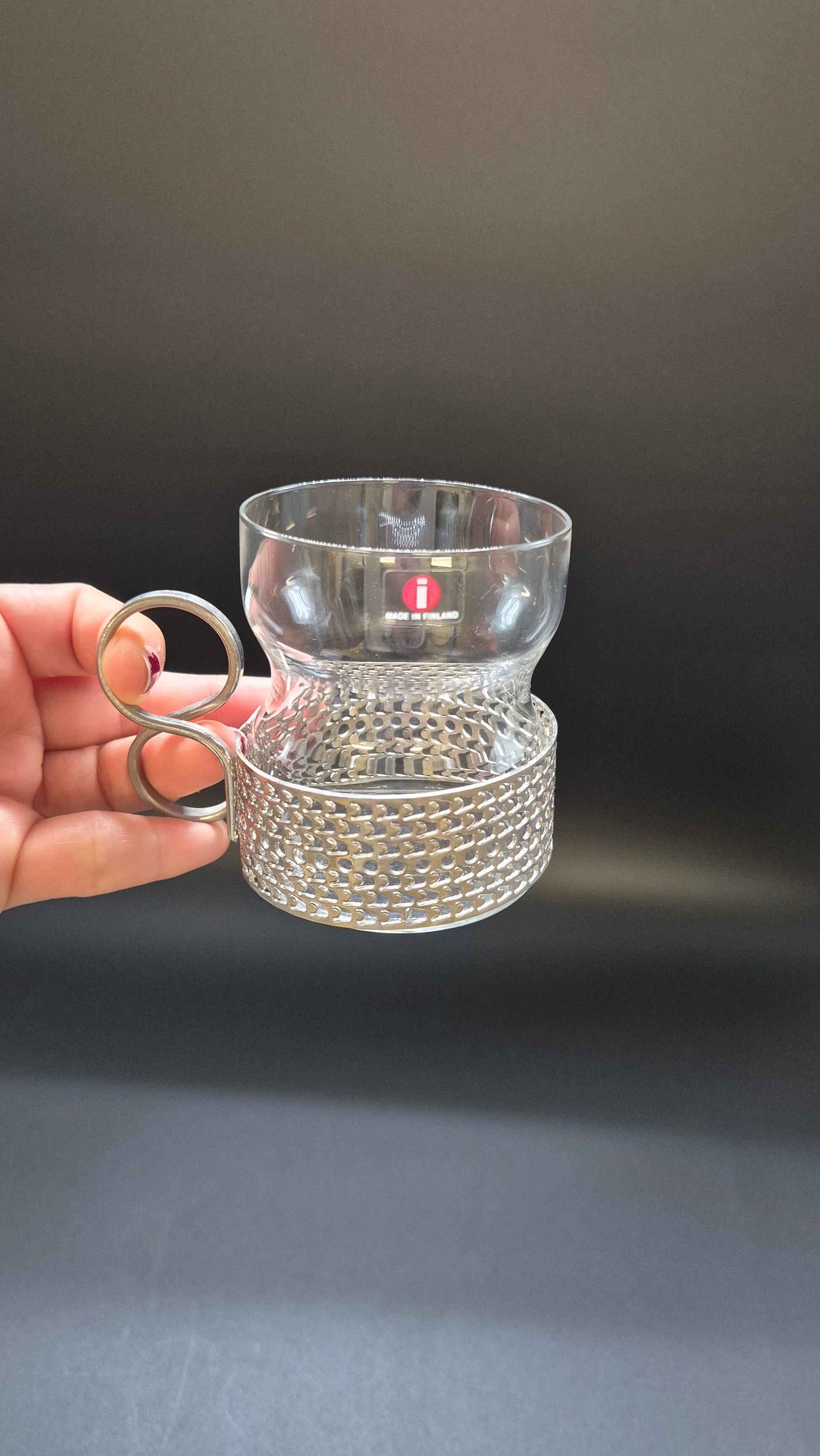 Designed in 1957 by renowned Finnish designer Timo Sarpaneva, the Tsaikka mug is a Scandinavian icon. Crafted by Iittala, it features a removable heat-resistant glass insert held by a decorative metal holder with elegant loop handles combining practicality with mid-century elegance.