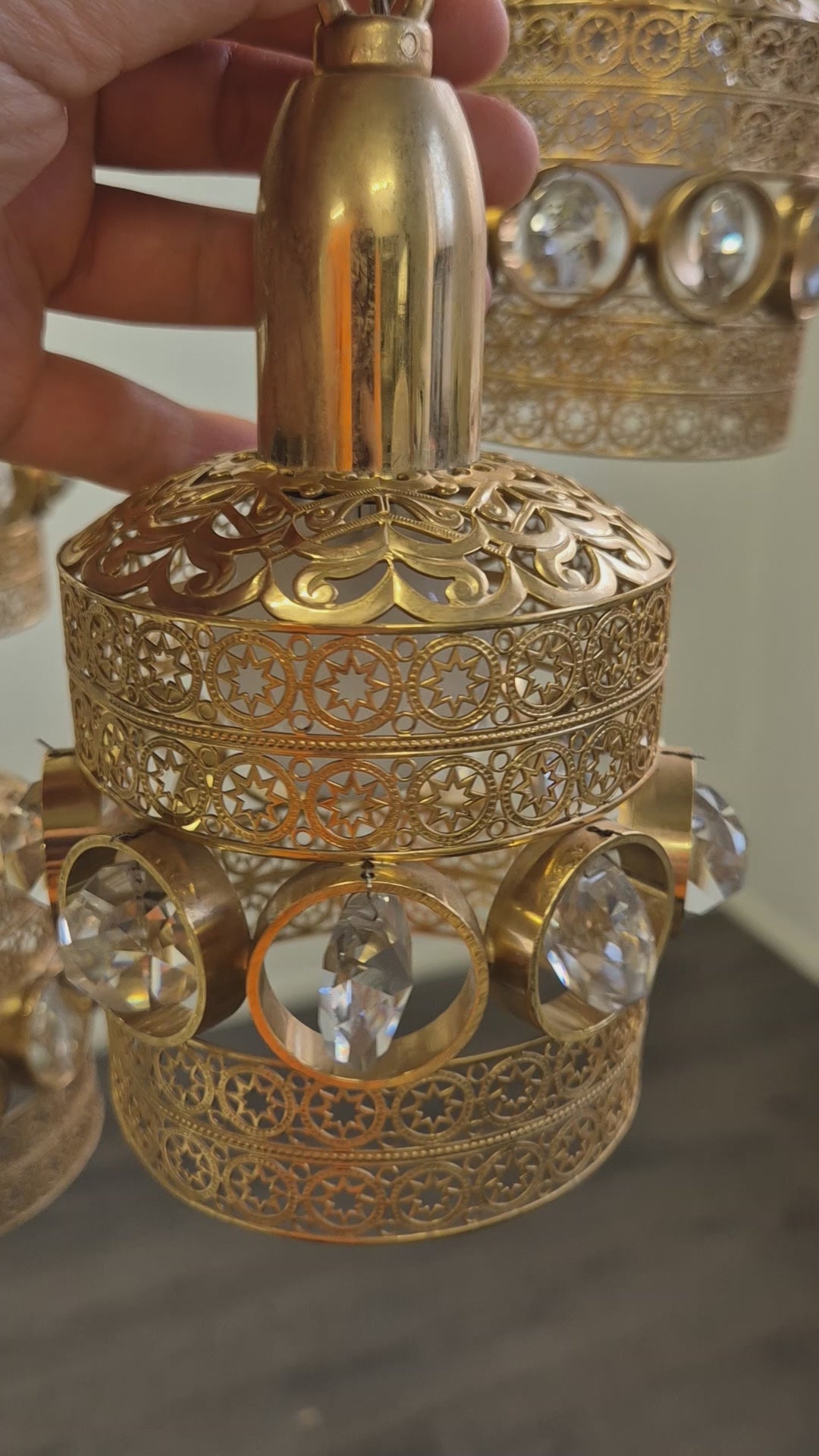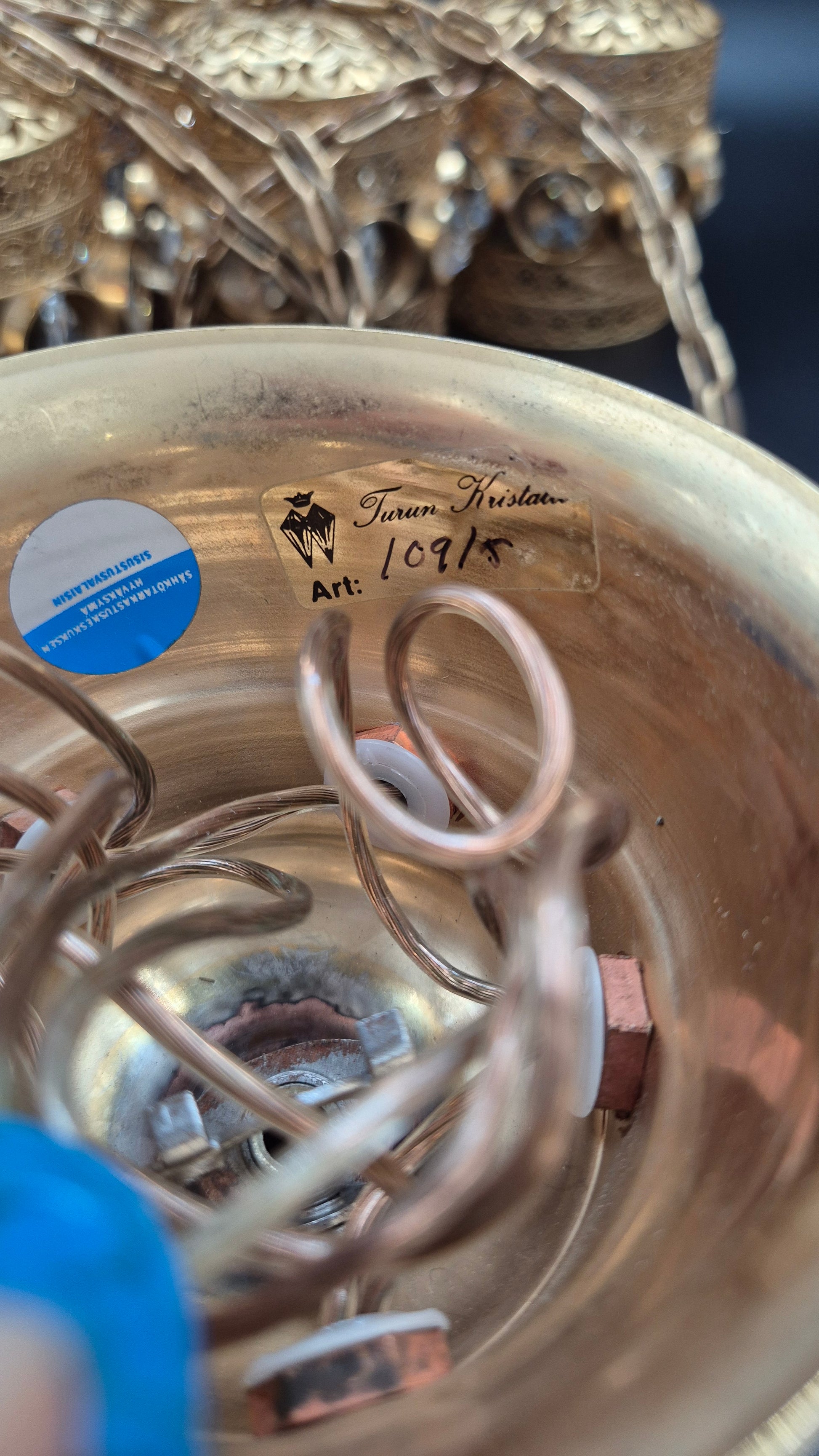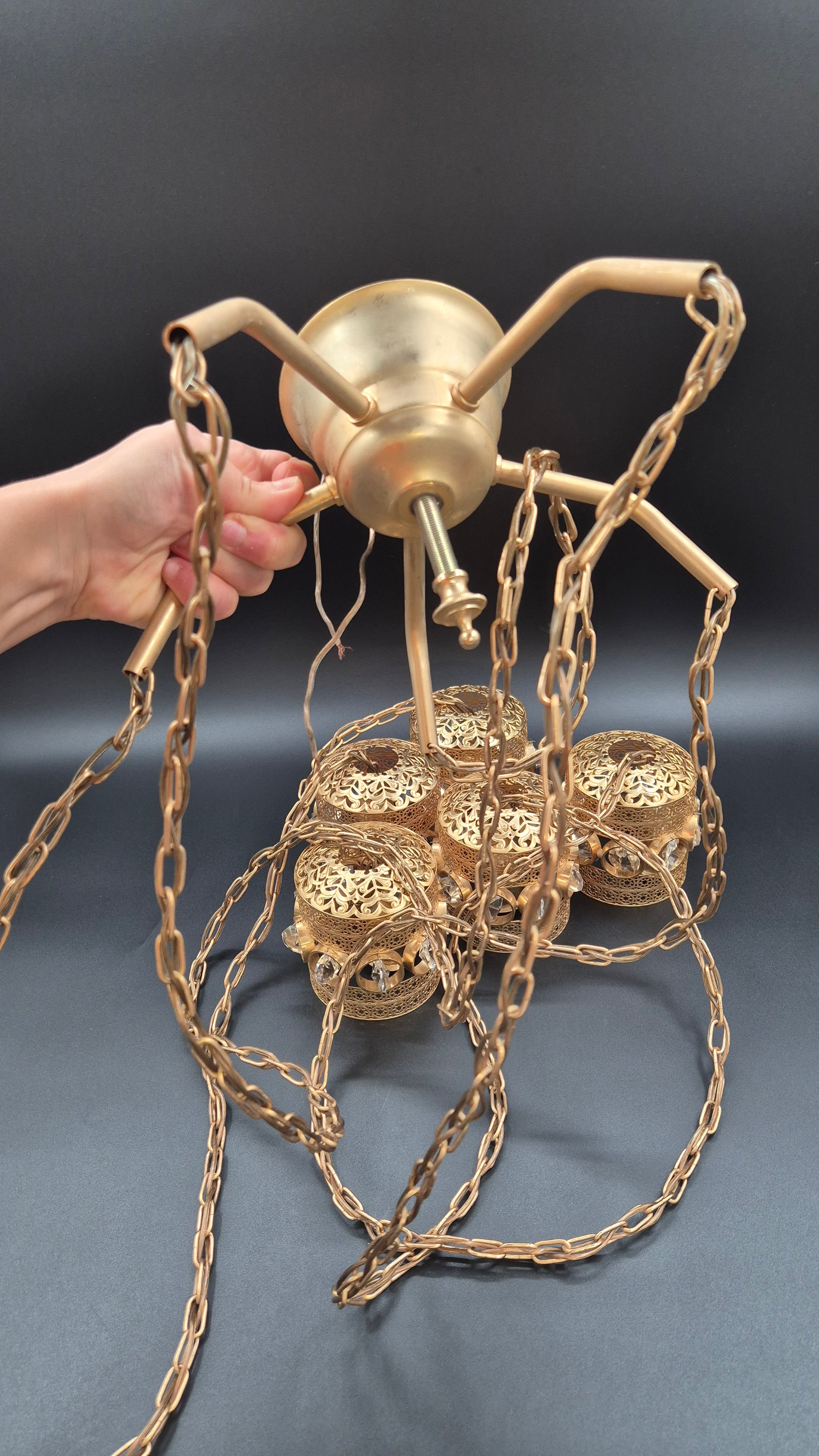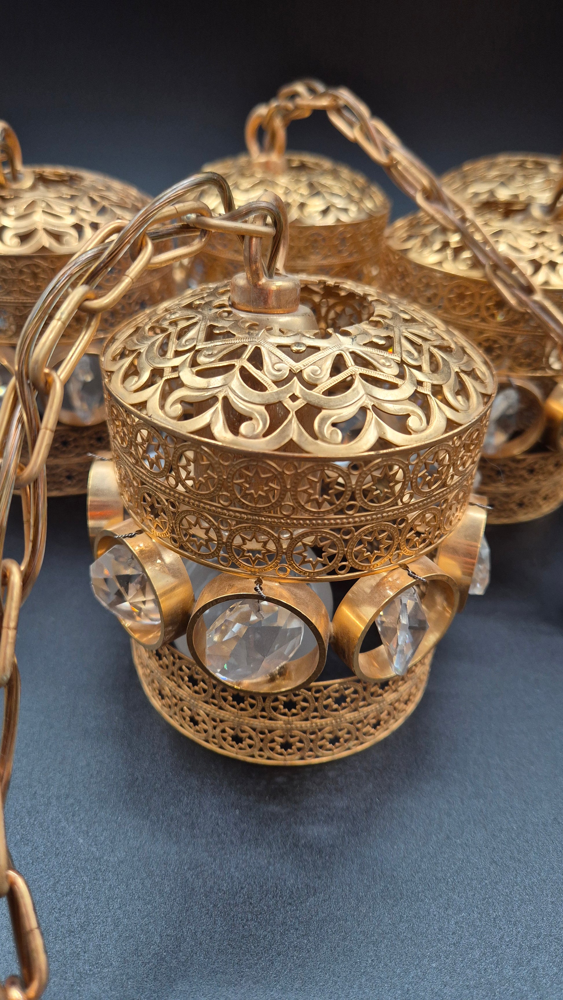 This Turun Kristalli chandelier brings warm, old-world charm into any space. Each pendant is crafted from intricately patterned brass with delicate filigree cutwork and crystal-style accents that catch and scatter the light beautifully. The hanging lamps are suspended from antique-finish chains, creating a dramatic cascading effect perfect for entryways, dining rooms, boutiques, or cozy reading corners.