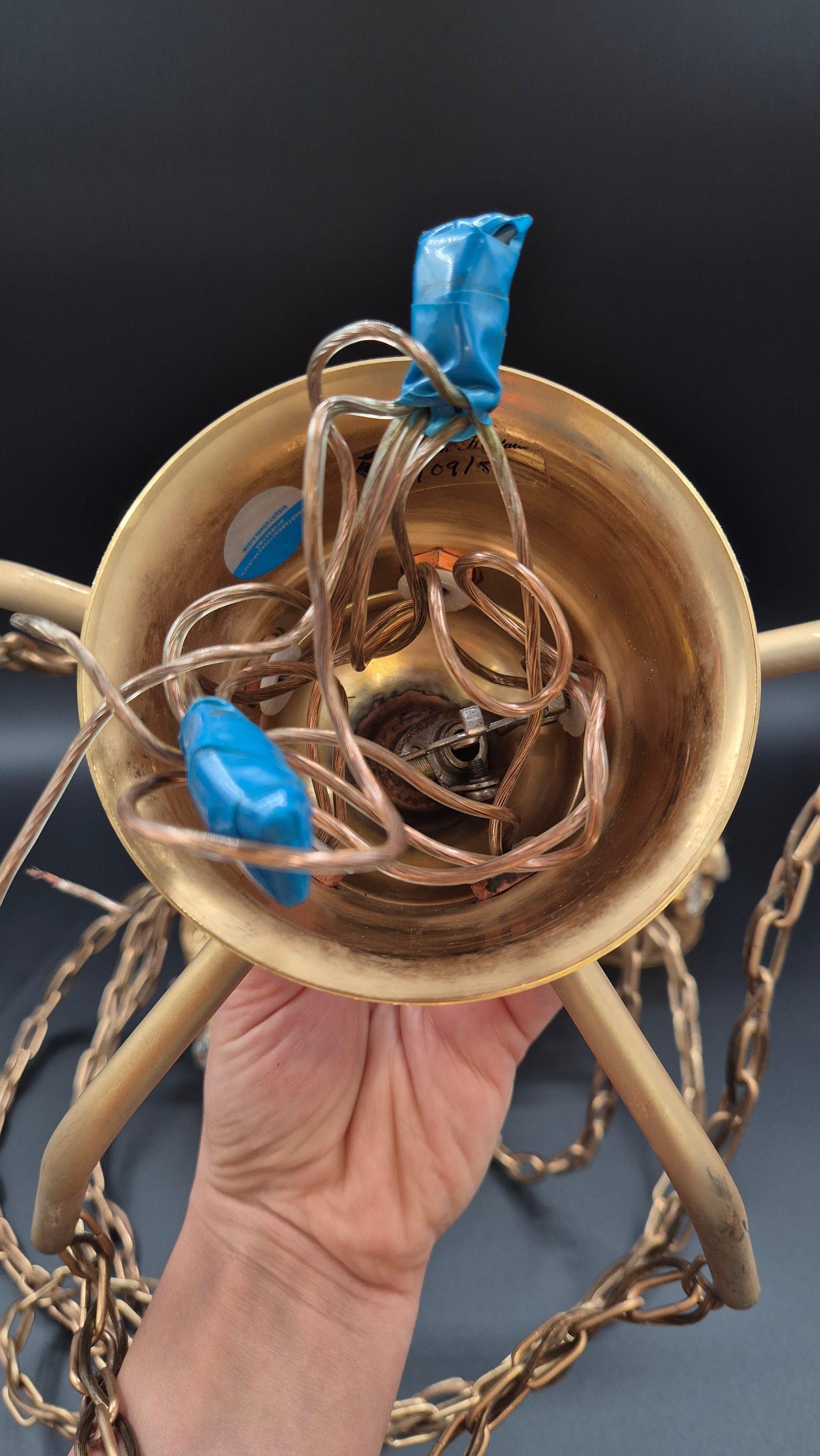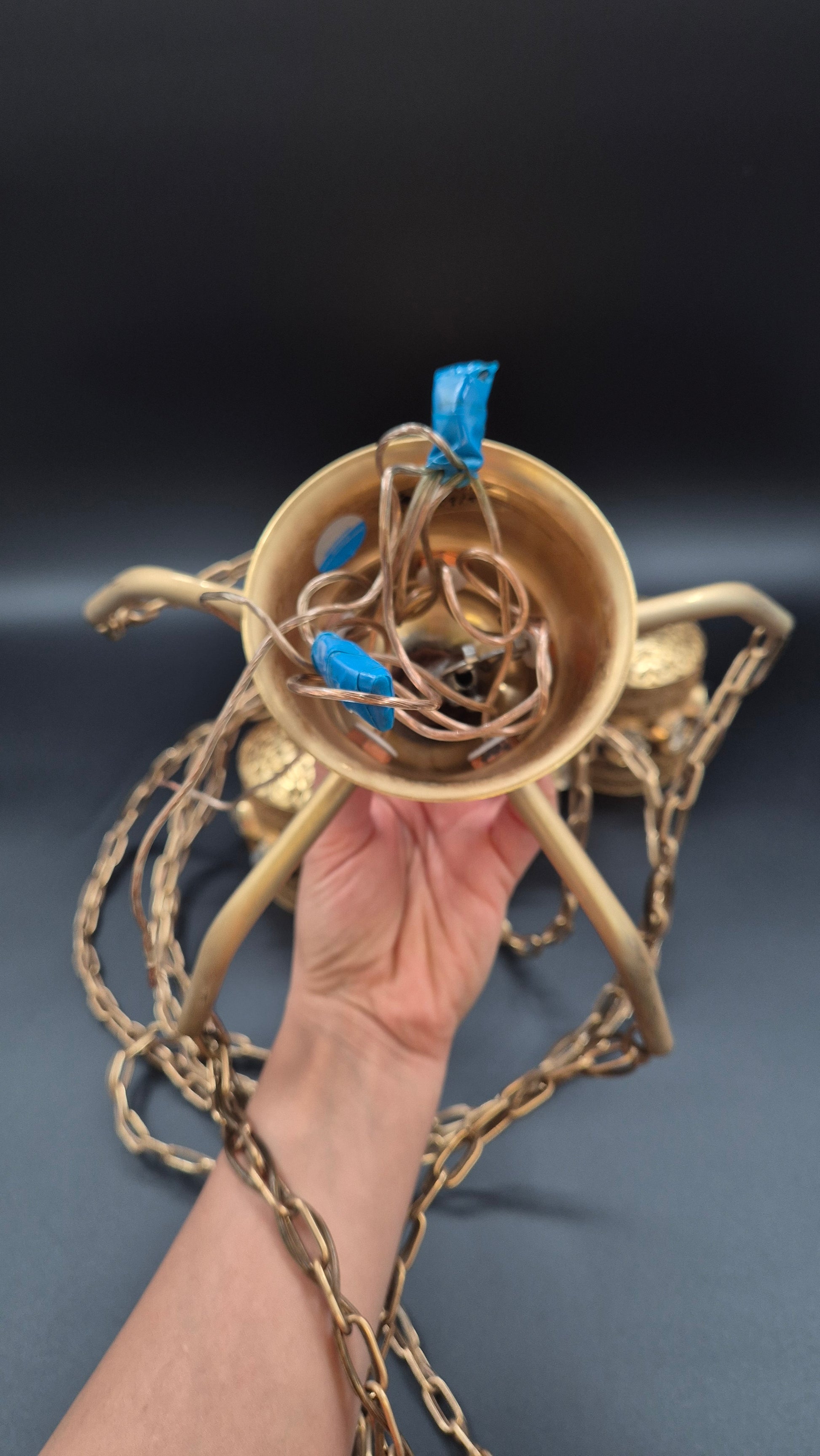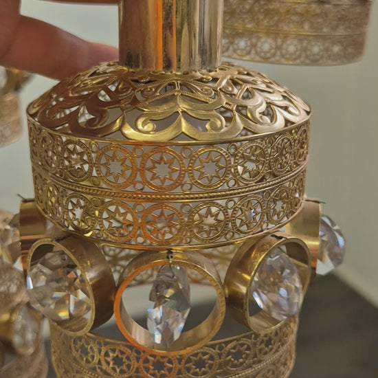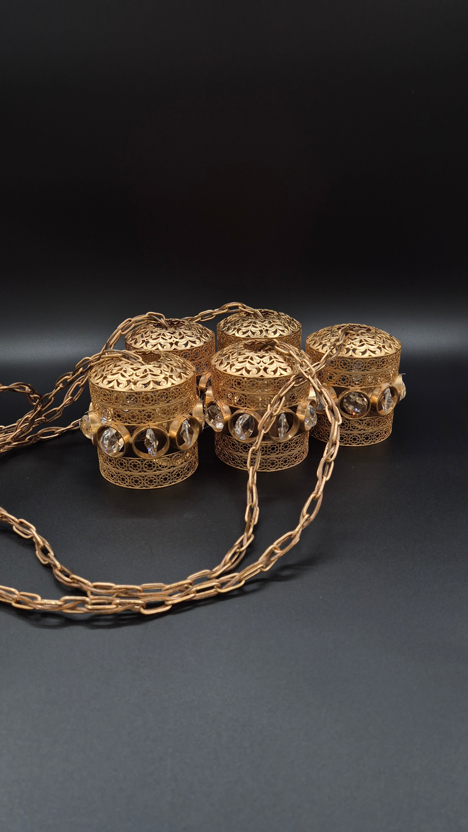 This Turun Kristalli chandelier brings warm, old-world charm into any space. Each pendant is crafted from intricately patterned brass with delicate filigree cutwork and crystal-style accents that catch and scatter the light beautifully. The hanging lamps are suspended from antique-finish chains, creating a dramatic cascading effect perfect for entryways, dining rooms, boutiques, or cozy reading corners.
