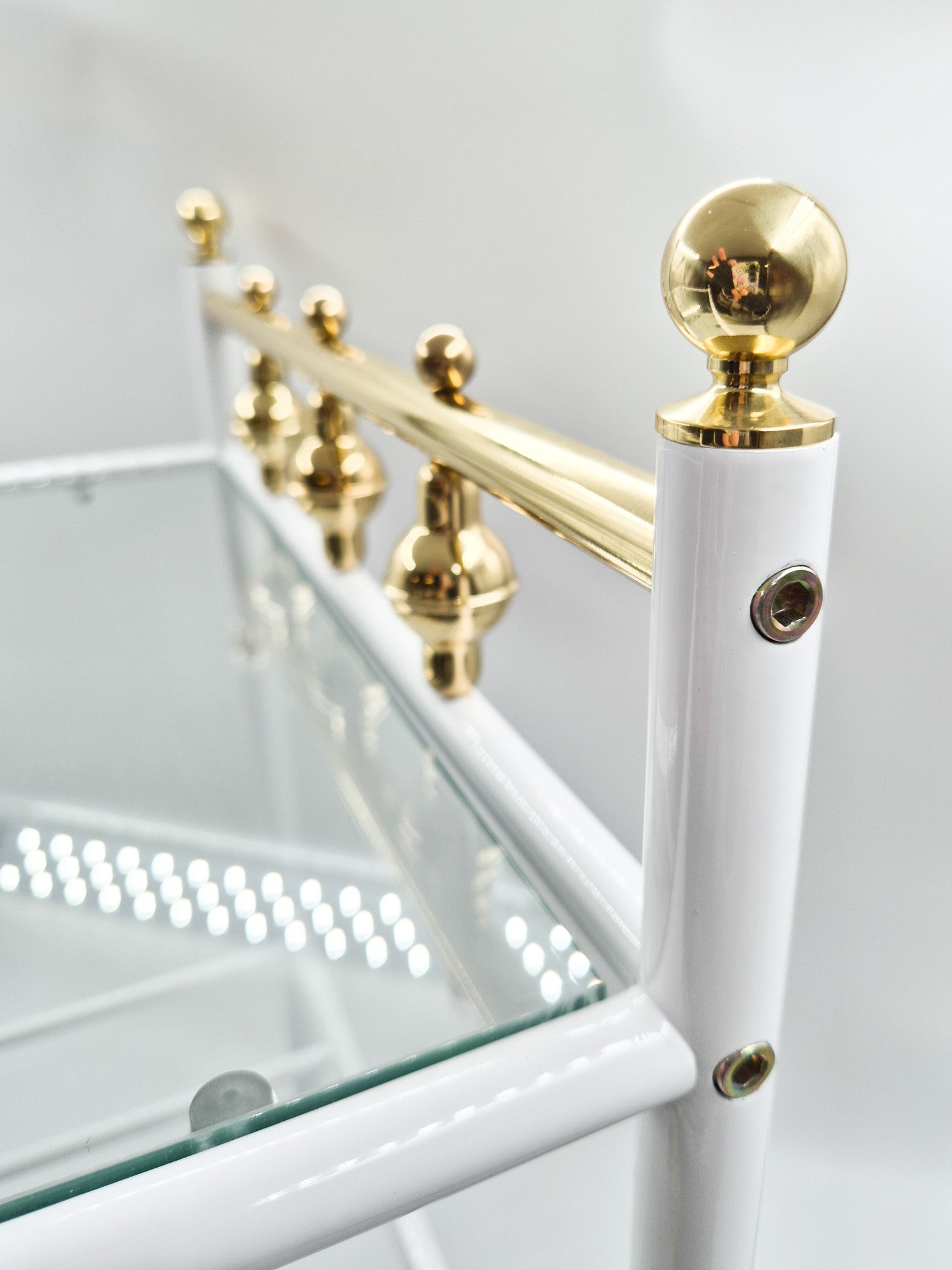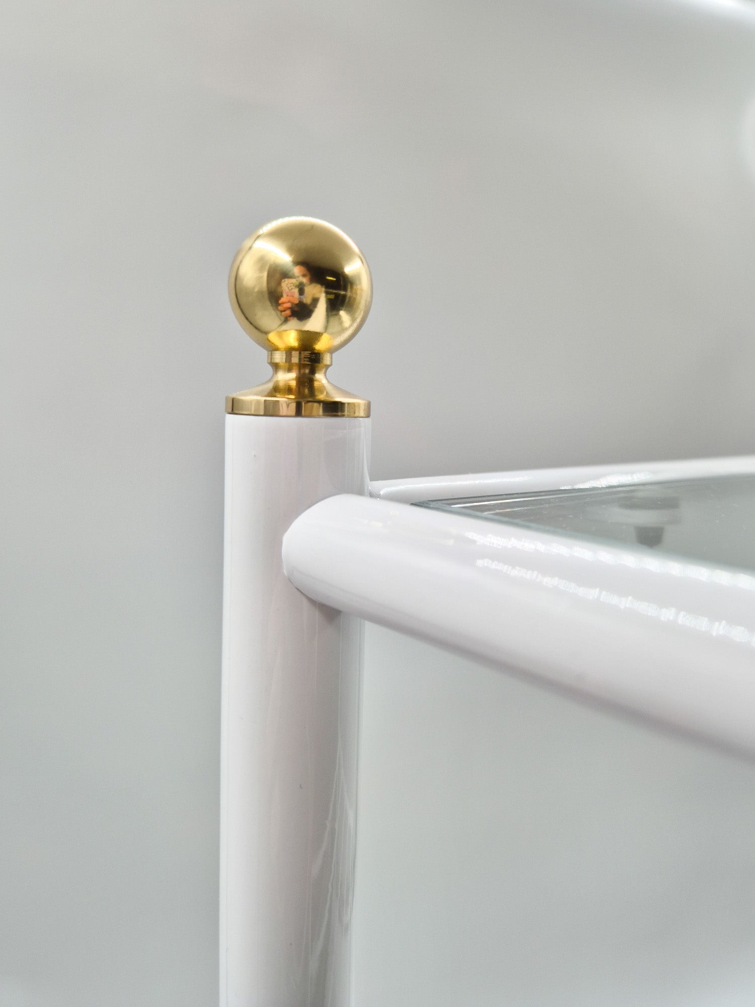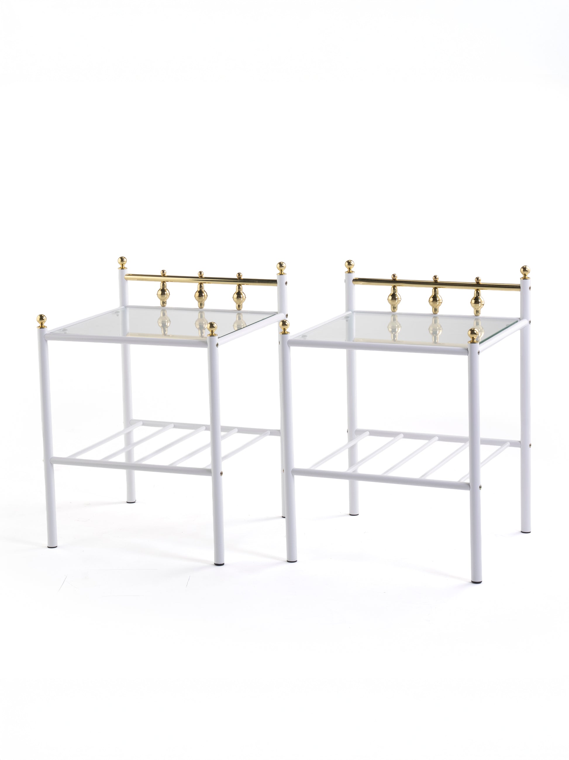 The tables are unused and preserved in excellent vintage condition, having been stored for decades in their original factory packaging. The table features a sturdy metal frame combined with a glass tabletop, accented with brass details that add warmth and subtle elegance. The structure is balanced and durable, while the design remains light and visually refined practical without being heavy.