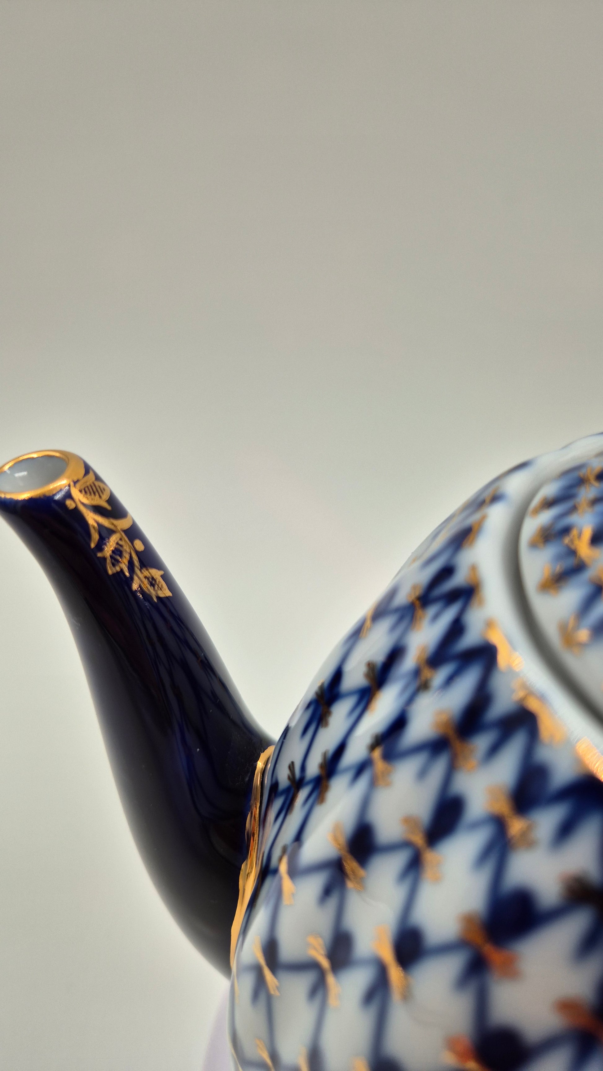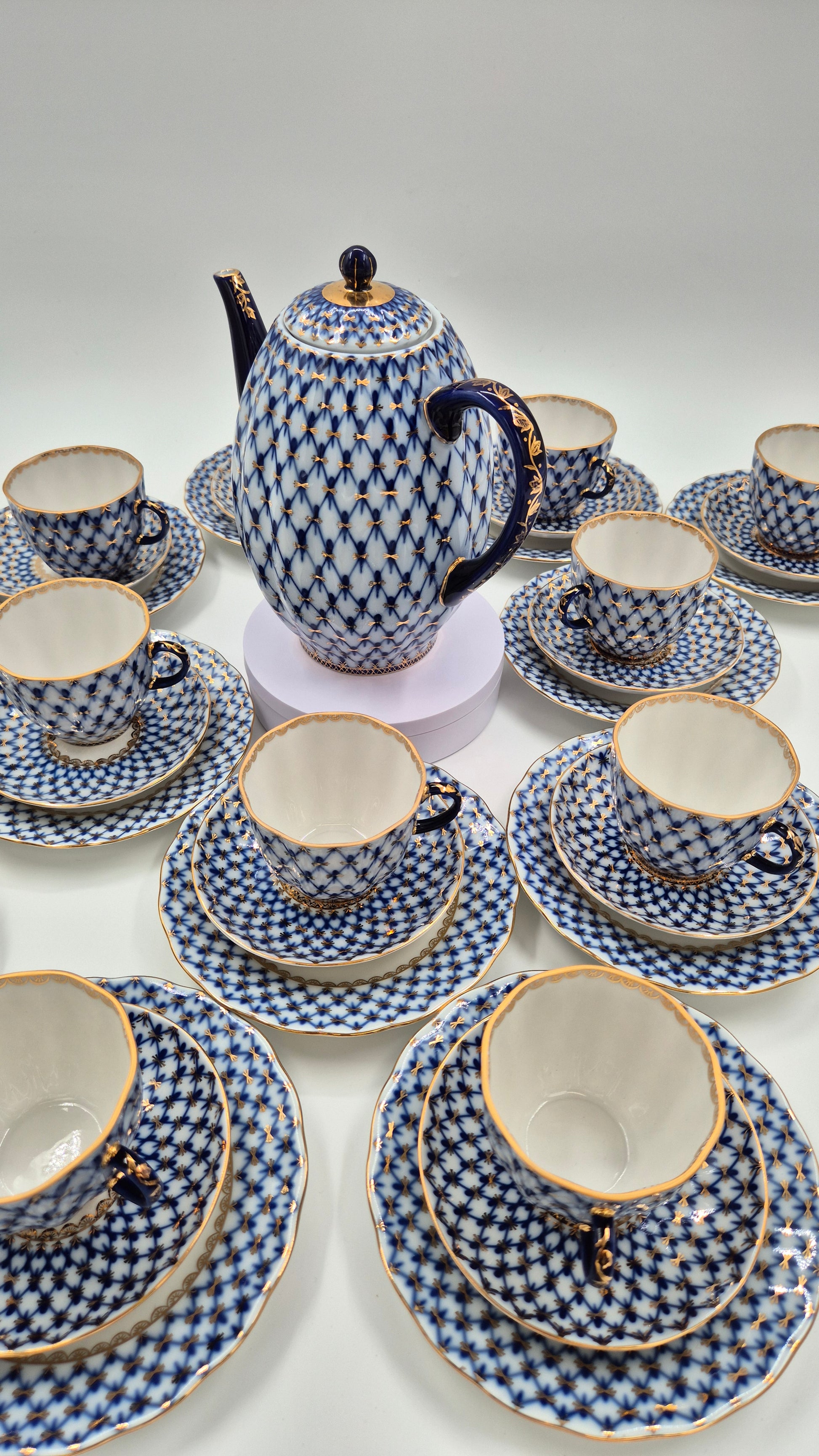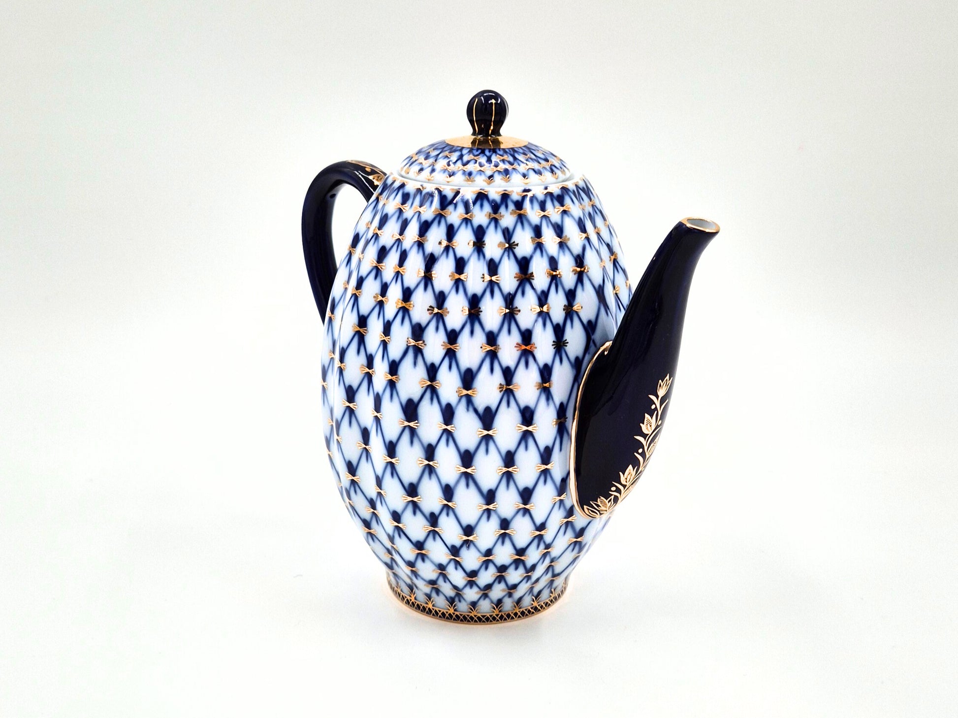 This authentic Lomonosov (Imperial Porcelain Factory) cobalt net coffee pot is a charming vintage piece standing 19.5 cm tall. It features the classic hand-painted cobalt blue net pattern with fine gold accents, including detailed gold decoration on the spout. The porcelain has a smooth, glossy finish, and the colors are vivid and beautifully preserved.