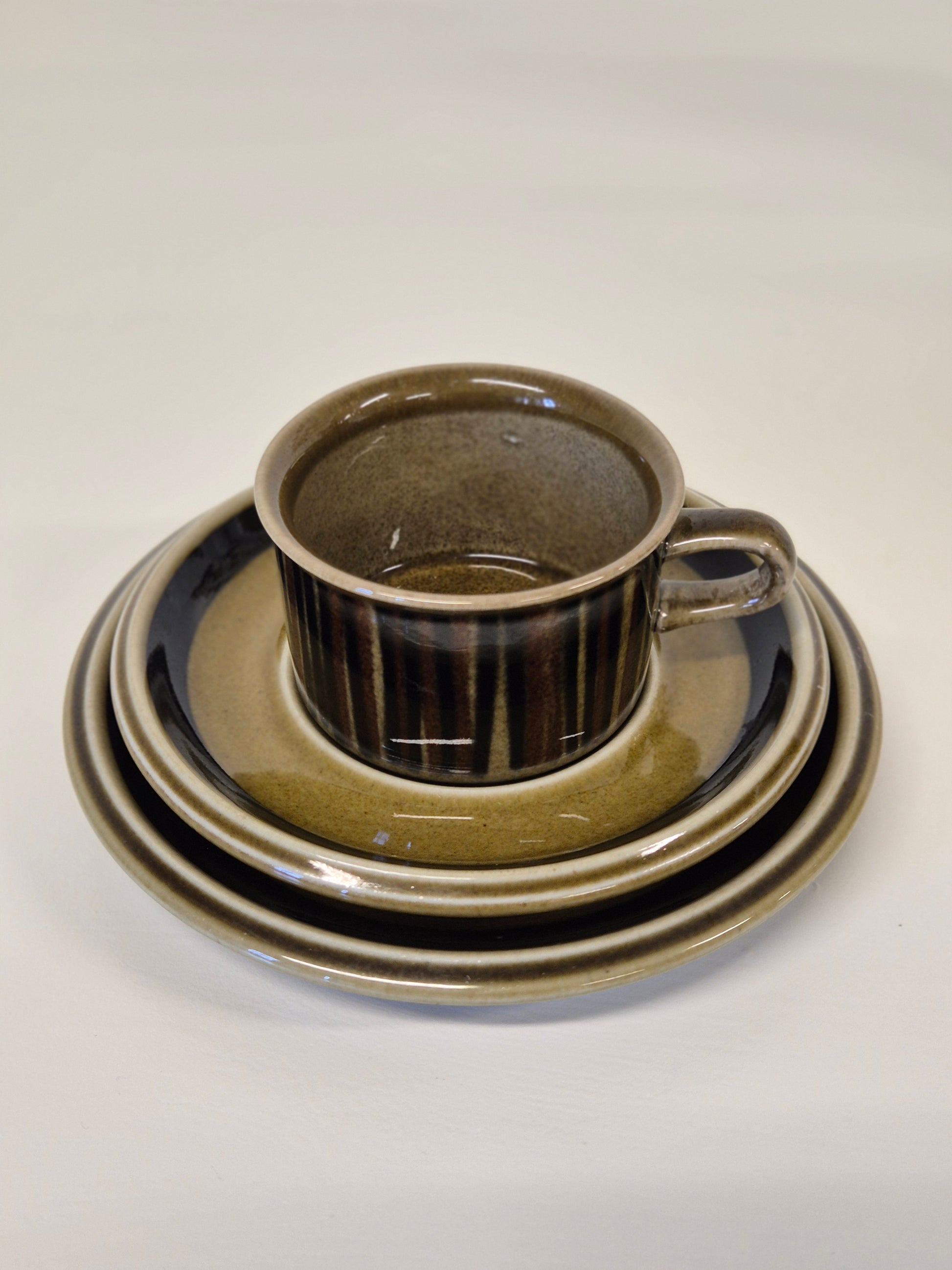 Cet ensemble de deux trios à café Arabia Kosmos comprend des tasses, des soucoupes et des assiettes à dessert assorties, conçues par Gunvor Olin-Grönqvist en 1962. Fabriquée en Finlande par Arabia , cette série présente un riche émail brun terreux avec des rayures peintes à la main — chaque pièce subtilement unique.