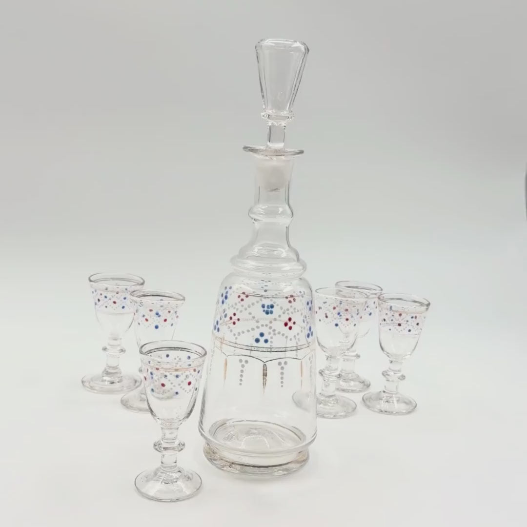 Ce magnifique service de verrerie antique peint à la main comprend une carafe au design délicat et six verres assortis , chacun orné de détails floraux ou ornementaux complexes. Le savoir-faire et le charme de ce service reflètent l'art d'antan, ce qui le rend parfait pour servir des liqueurs, des apéritifs ou tout simplement comme objet décoratif.