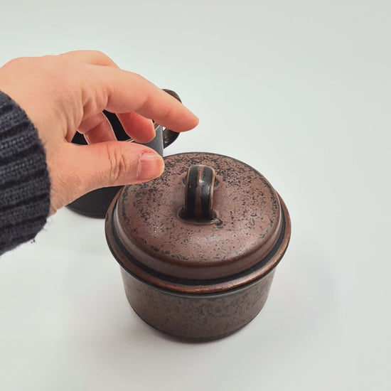 Ajoutez une touche de design finlandais classique à votre table avec ce sucrier et crémier Vintage Arabia Ruska , magnifiquement conçus et conçus par Ulla Procopé entre 1960 et 1999. Faisant partie de la collection emblématique Ruska, ces pièces présentent la glaçure brune chaude et terreuse et les formes simples mais élégantes qui définissent le style scandinave du milieu du siècle.