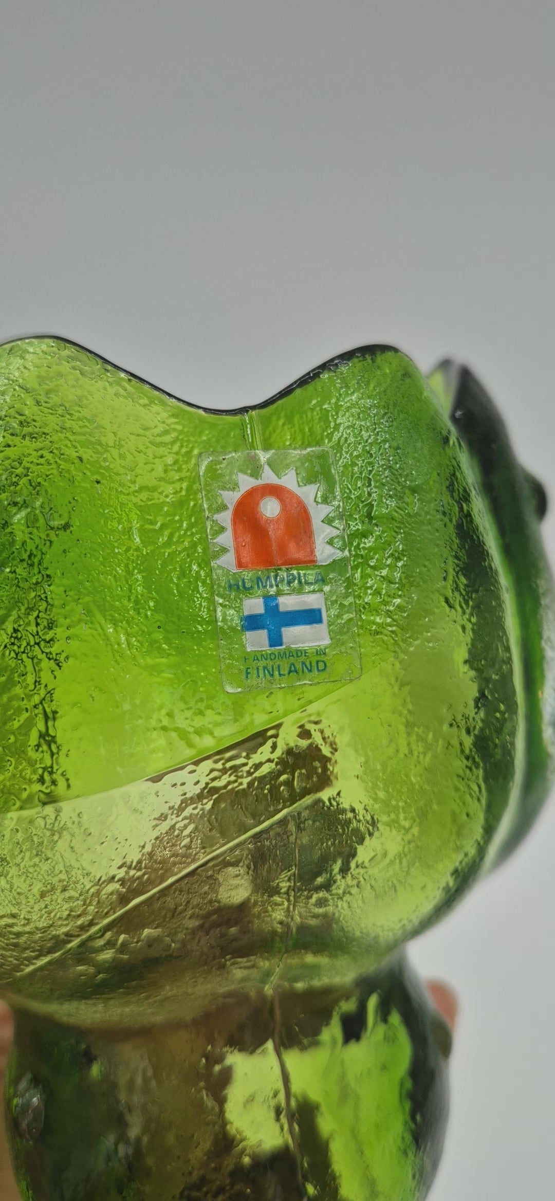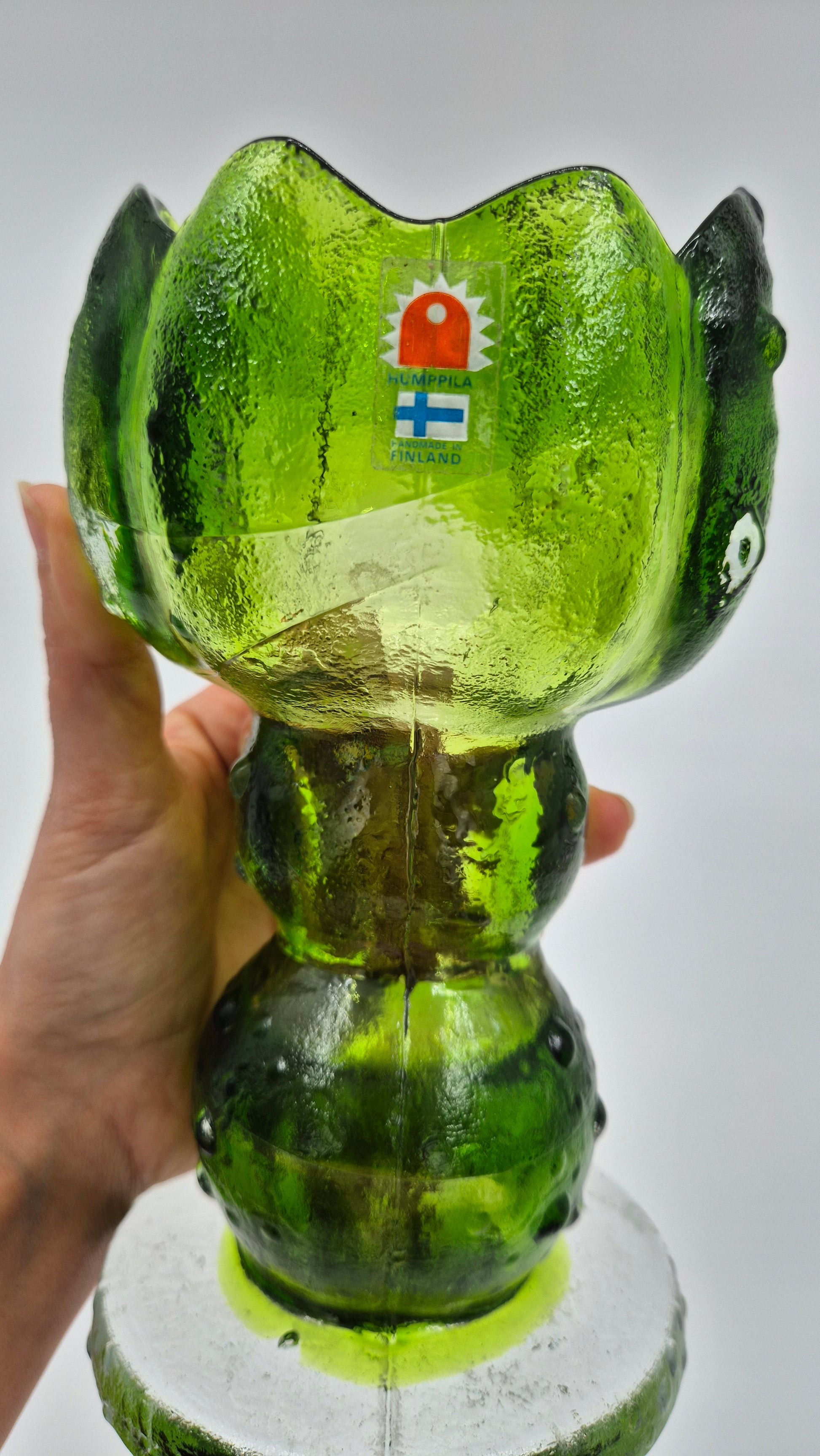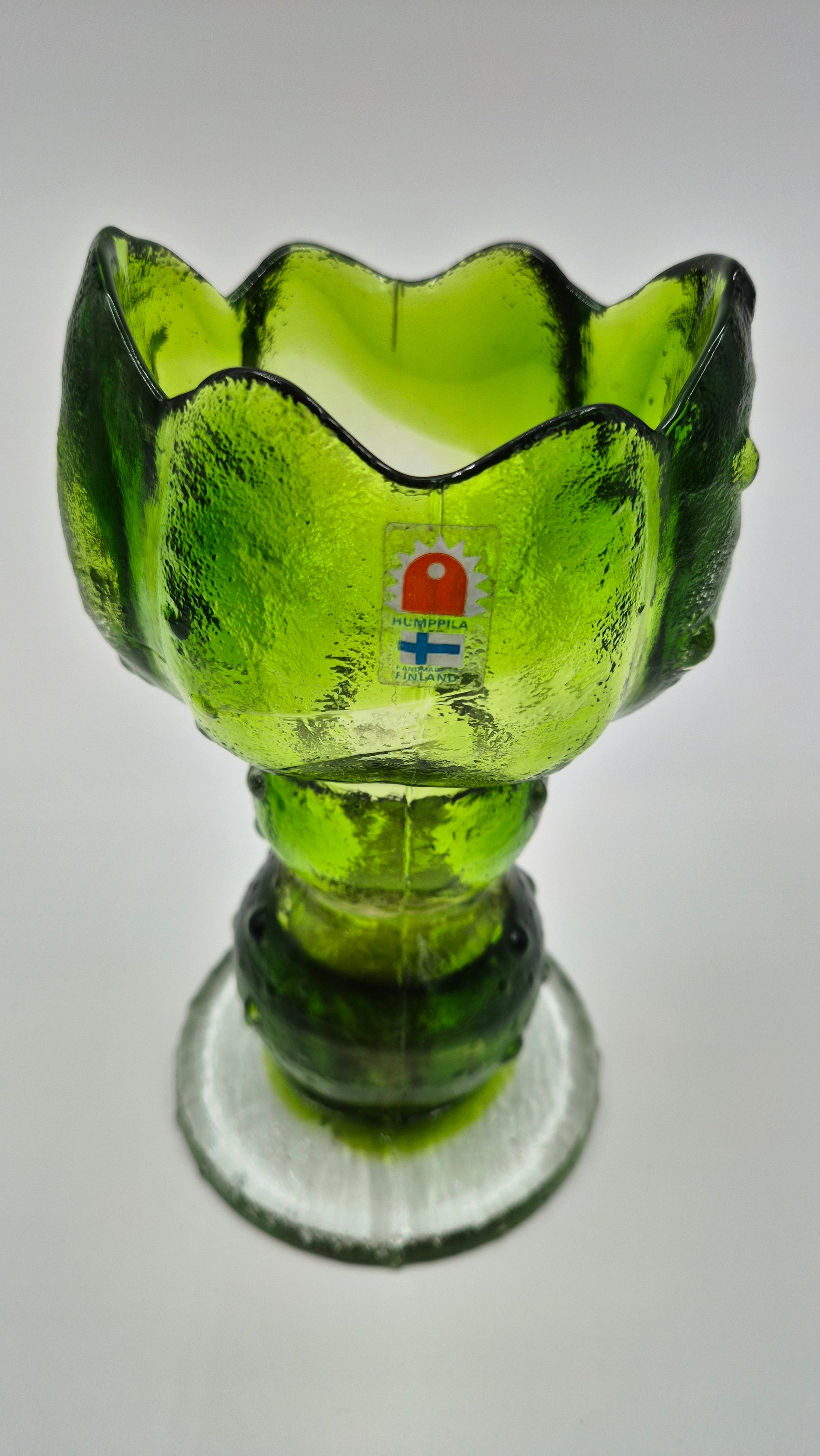Ce vase vintage Humppila , signé par le designer finlandais Pertti Santalahti , est une pièce remarquable de l'art verrier scandinave du milieu du siècle. Fabriqué à la main en Finlande, ce vase présente des formes organiques fluides et des surfaces texturées, reflétant l'inspiration naturelle souvent présente dans l'œuvre de Santalahti.