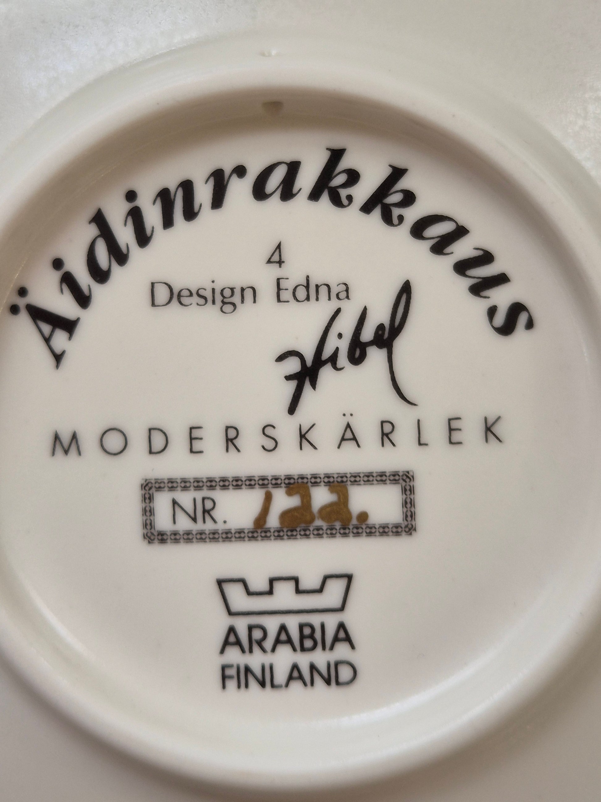 Voeg een vleugje liefde en warmte toe aan je muren met dit Arabia "Äidin rakkaus" wandbord van Edna Hibel (1980) . Het zachte ontwerp straalt moederlijke toewijding en tedere zorg uit, een verzamelobject dat resoneert met het hart .