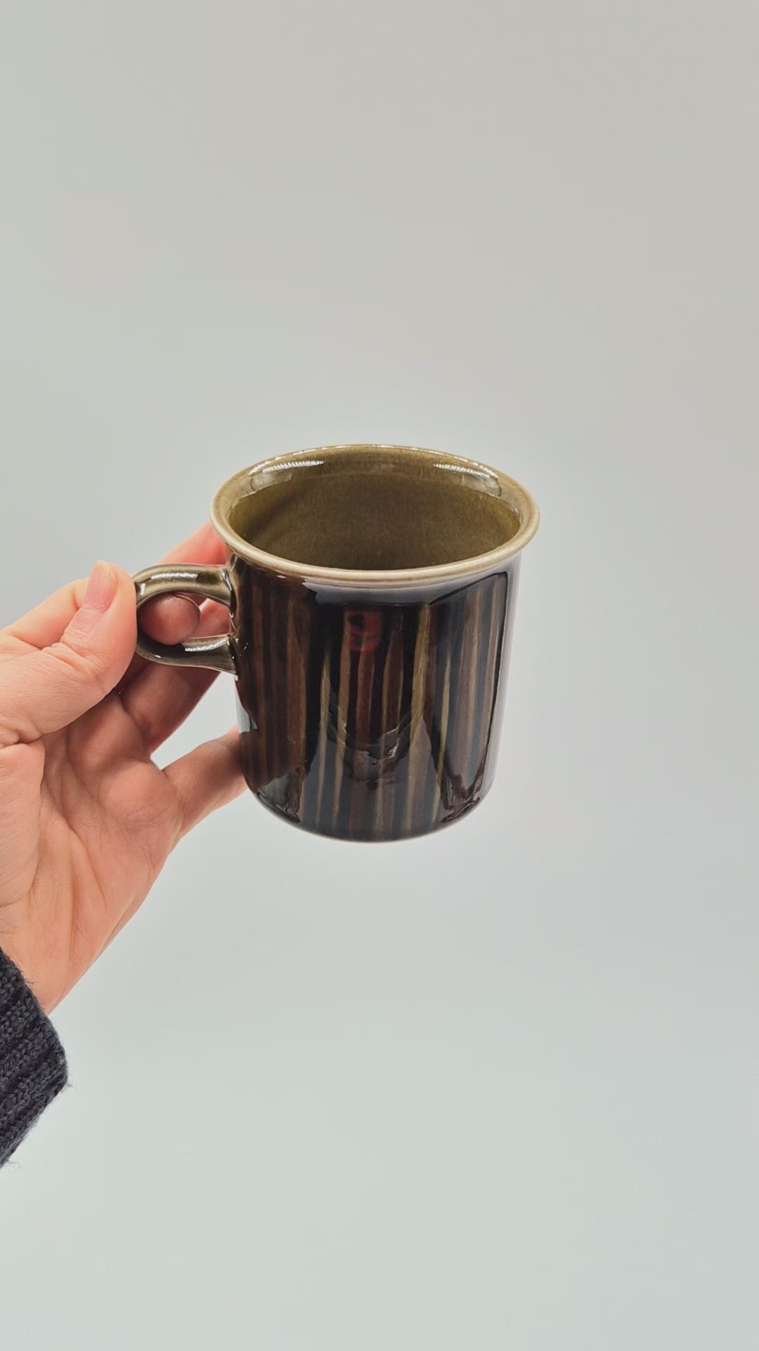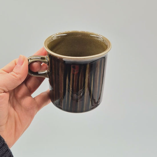 Warm op met vintage Scandinavische charme met deze Arabia Kosmos Cocoa Mug , ontworpen door Gunvor Olin-Grönqvist en geproduceerd door Arabia Finland tussen 1963 en 1976. Deze duurzame mok van steengoed , onderdeel van de iconische Kosmos-serie , is voorzien van aardse, handgeschilderde strepen in diepbruine en olijfkleurige tinten – elk exemplaar is uniek en expressief . Deze mok, bekend om zijn erfgoedkwaliteit en tijdloze vorm , is perfect voor cacao, koffie of verzamelobjecten. Een waar stukje Finse designgeschiedenis , hij brengt warmte en stijl in elke setting. H 8,5 cm Ø 8,5 cm