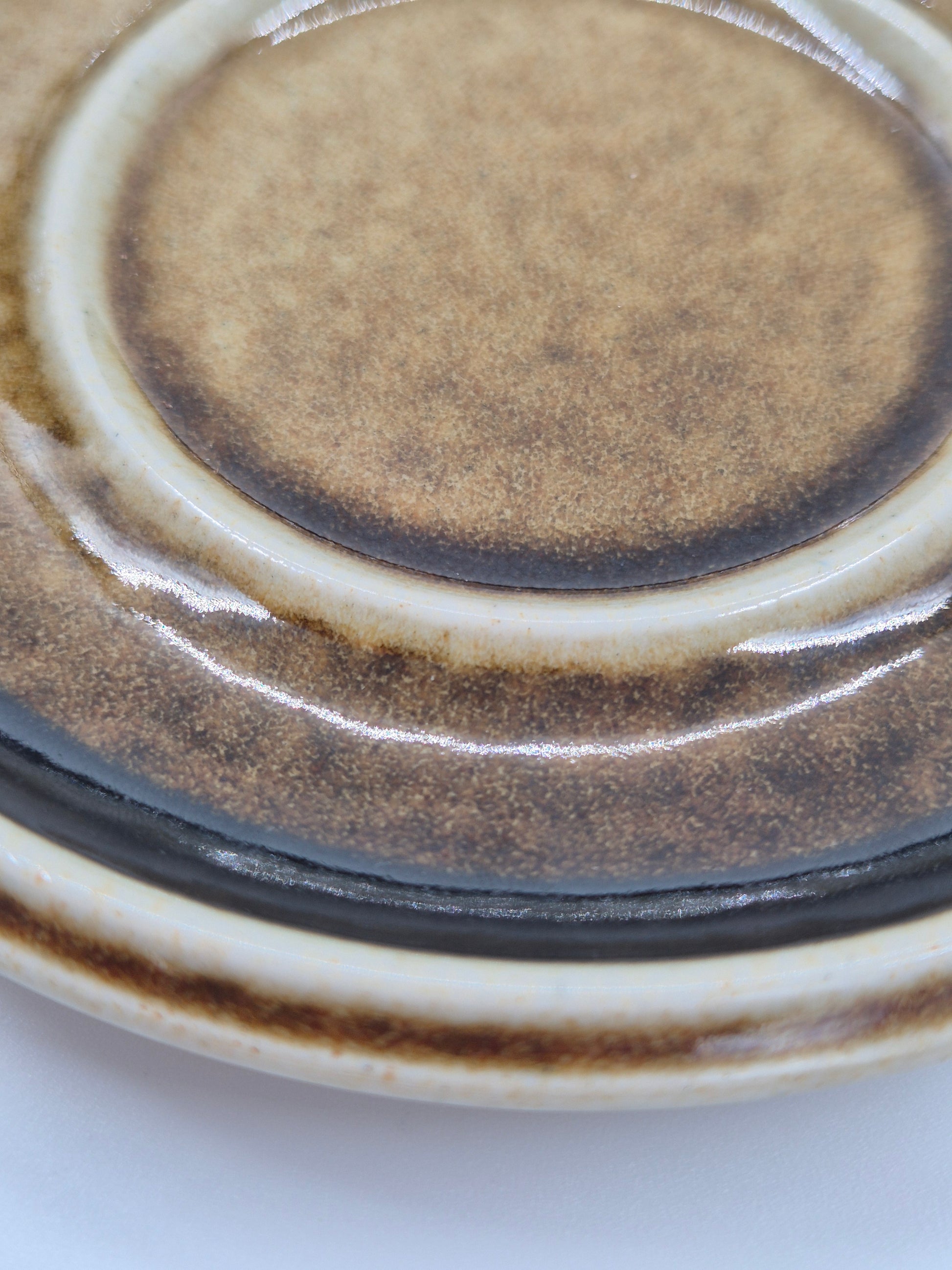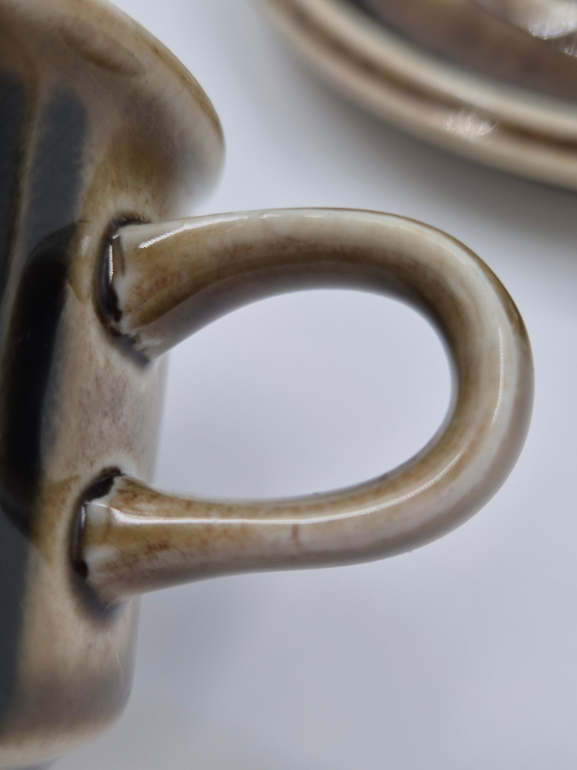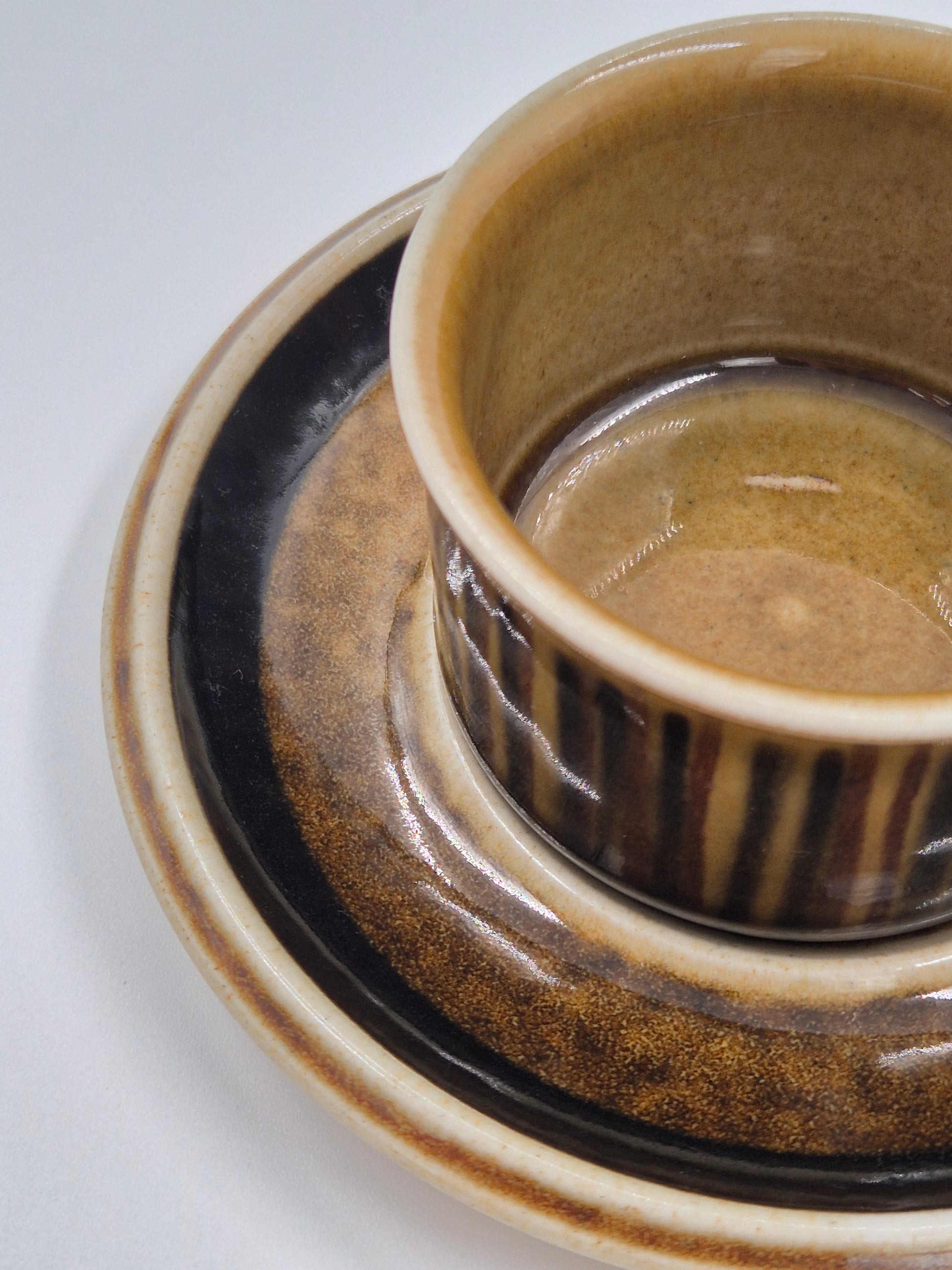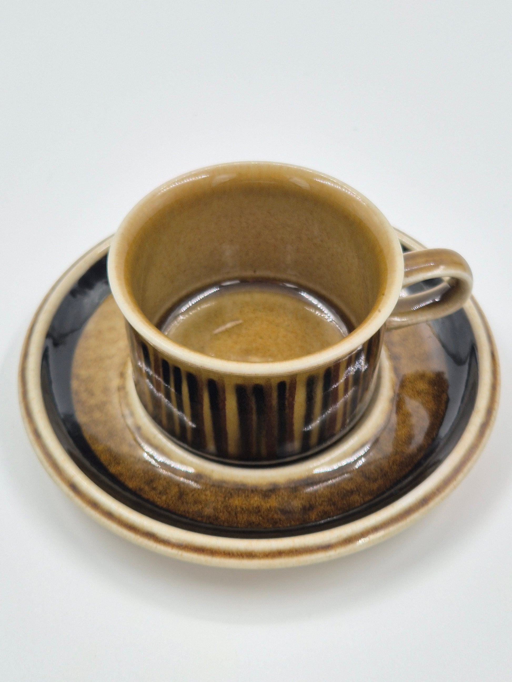 Omarm tijdloos Scandinavisch design met de Arabia Kosmos Mocha Kop en Schotel , ontworpen door Gunvor Olin-Grönqvist en geproduceerd door Arabia Finland tussen 1963 en 1976. Dit vintage exemplaar is voorzien van het iconische, handgeschilderde verticale streepmotief in diepe aardse tinten, een kenmerk van de Kosmos-serie. Vervaardigd in duurzaam steengoed, weerspiegelt het de elegantie en functionaliteit van Noords keramiek uit het midden van de vorige eeuw. Of u het nu wilt tentoonstellen of dagelijks wilt gebruiken, deze verzamelset brengt authentieke vintage charme en Fins vakmanschap in huis.