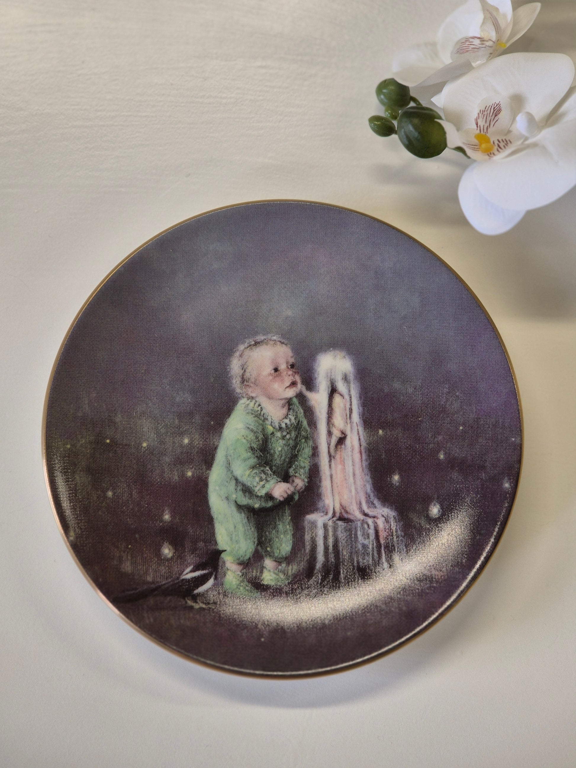 Haal de magie van Fins design in huis met dit Arabia "Sadun totuus" wandbord van Sussi Anna Åberg (1990) . Met een speelse sprookjesillustratie vangt dit verzamelbare porseleinen bord de charme van Scandinavische verhalen. Perfect als decoratief kunstwerk of als uniek cadeau , het is een tijdloze schat die Scandinavische elegantie en sprookjesachtige pracht aan je huis toevoegt.