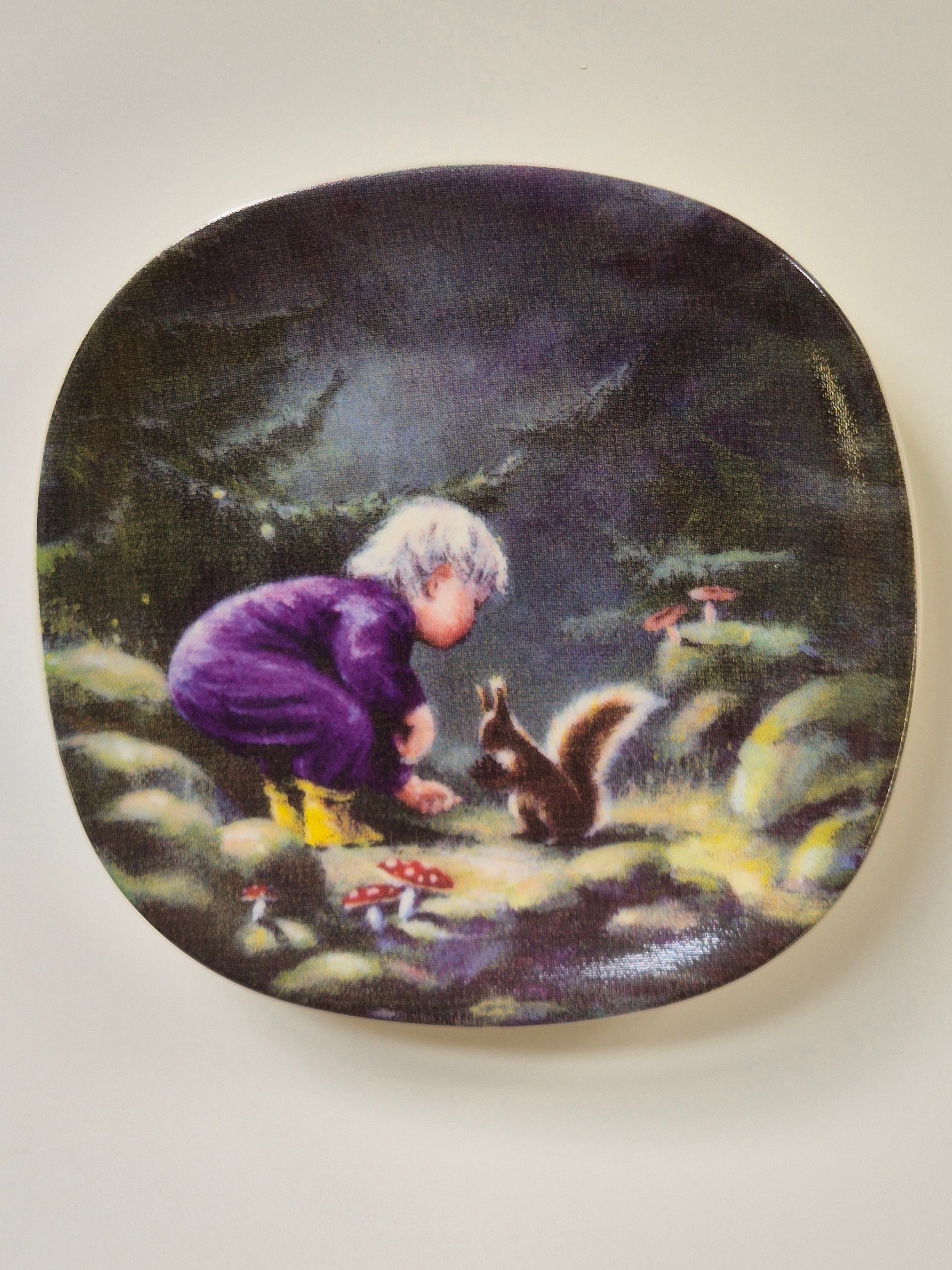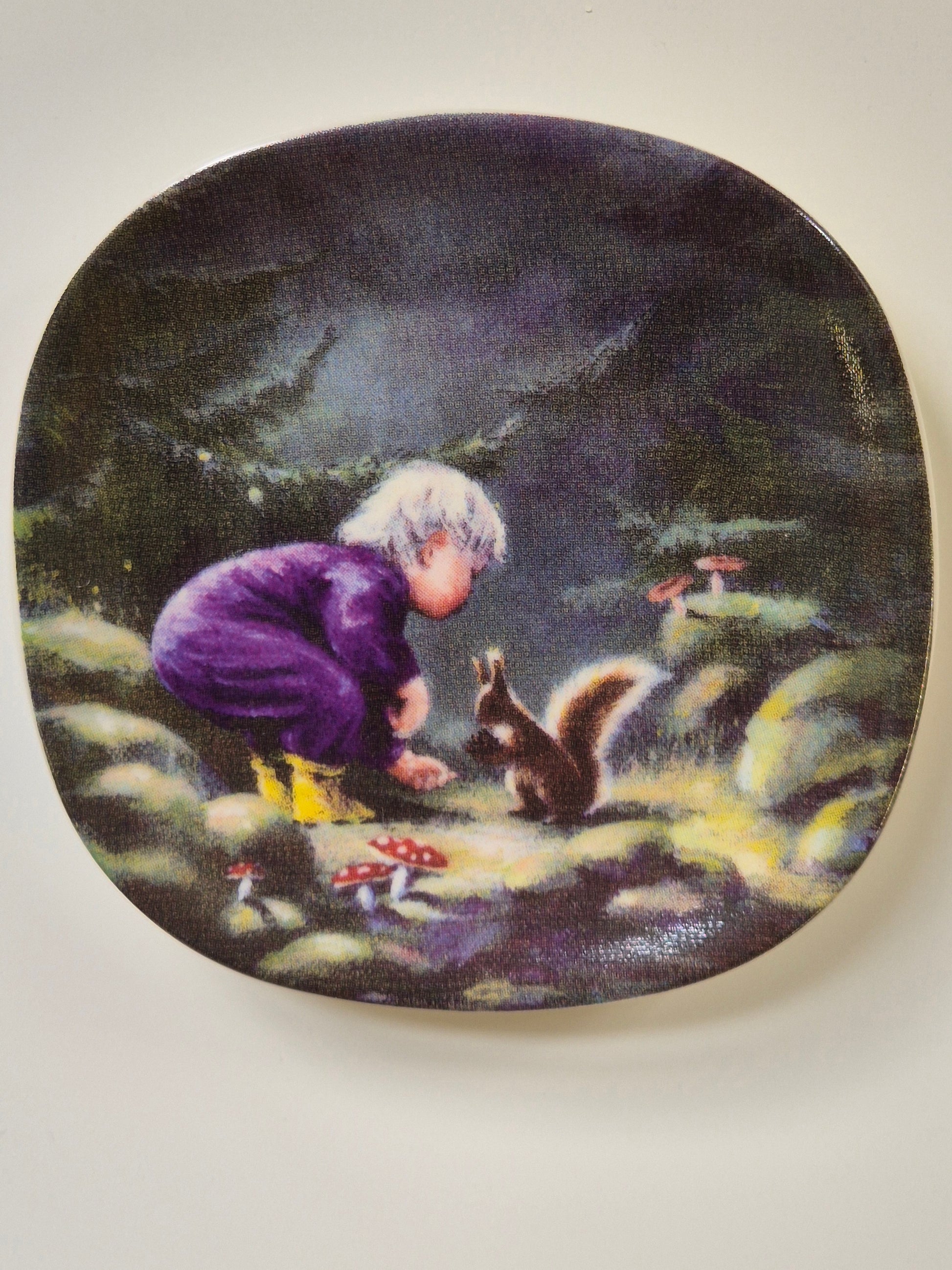 Voeg een vleugje sprookjesachtige magie en oprechte elegantie toe aan uw muren met dit Arabia "Sydänystävät" wandbord van Sussi Anna Åberg (1994) . De zachte, grillige illustratie legt de geest van vriendschap en vreugde vast, waardoor het een charmant verzamelobject is voor liefhebbers van Scandinavisch design .