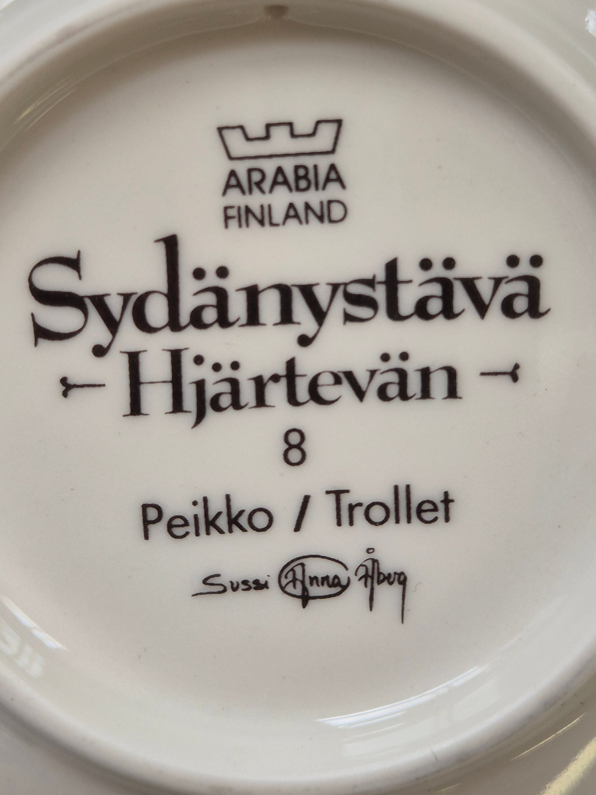Voeg een vleugje sprookjesachtige magie en oprechte elegantie toe aan uw muren met dit Arabia "Sydänystävät" wandbord van Sussi Anna Åberg (1994) . De zachte, grillige illustratie legt de geest van vriendschap en vreugde vast, waardoor het een charmant verzamelobject is voor liefhebbers van Scandinavisch design .