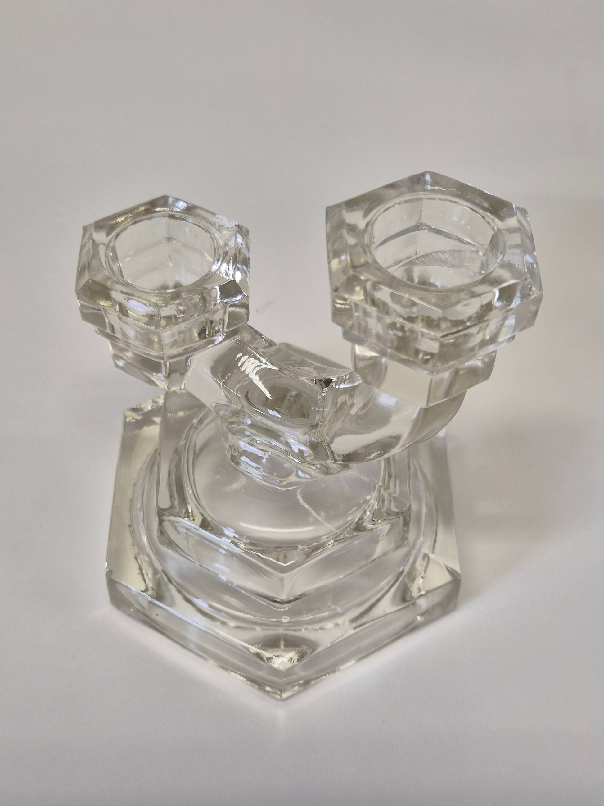 Met de strakke lijnen, geometrische vormen en verfijnde eenvoud die kenmerkend zijn voor het Art Deco-tijdperk, vat deze glazen kandelaar de geest van het design uit de jaren 20 prachtig samen met Scandinavisch vakmanschap. Het heldere glas breekt kaarslicht in een warme, sprankelende gloed – perfect voor een gezellige sfeer of als een prachtig vintage verzamelobject.