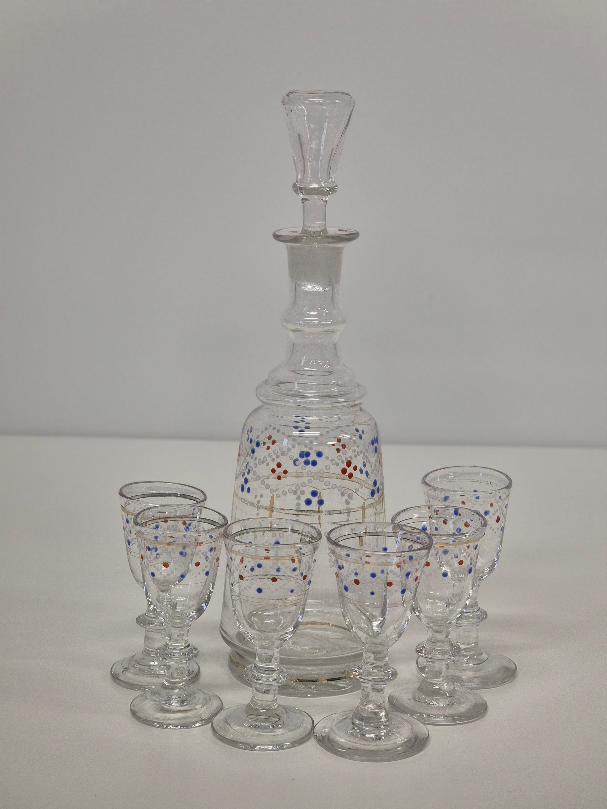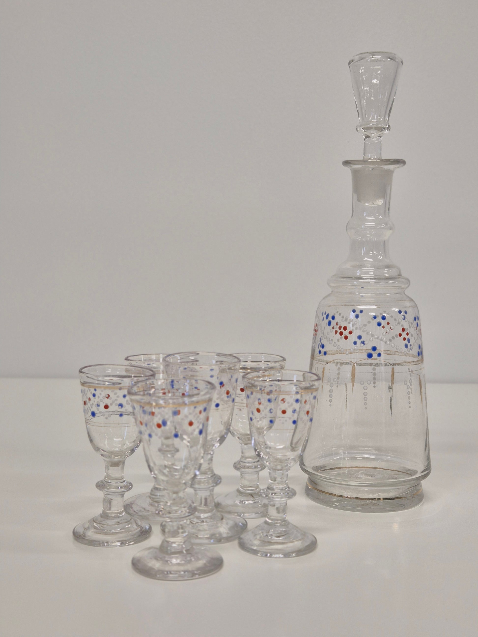Handbeschilderde antieke karaf en 6 glazen - decoratieve glaswerkset