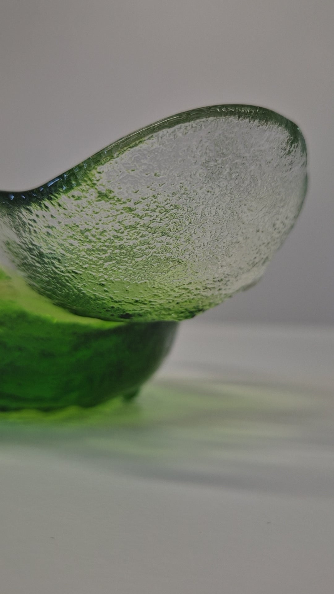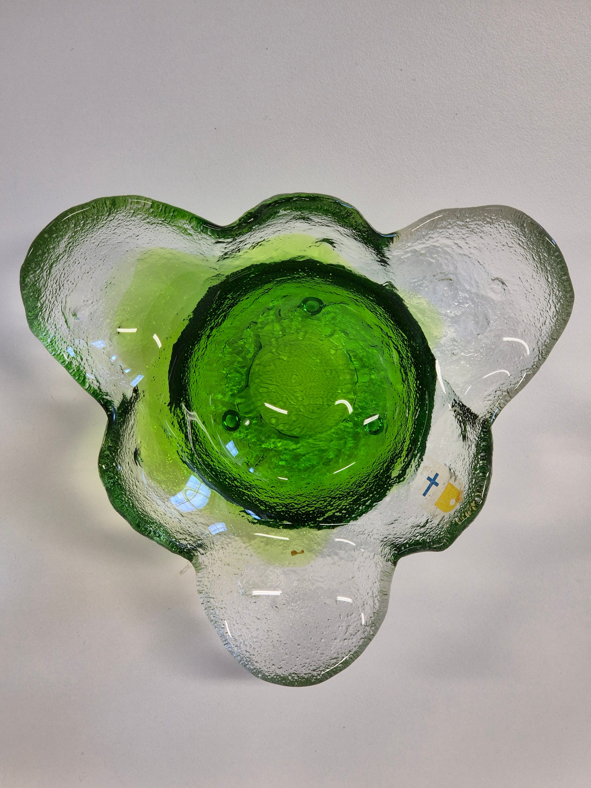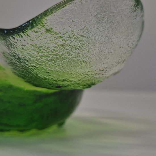 Deze vintage 'Kivi'-schaal van Humppila is een prachtig stuk Fins kunstglas. Het heeft een organisch, getextureerd ontwerp dat de essentie van Scandinavisch minimalisme weerspiegelt.
