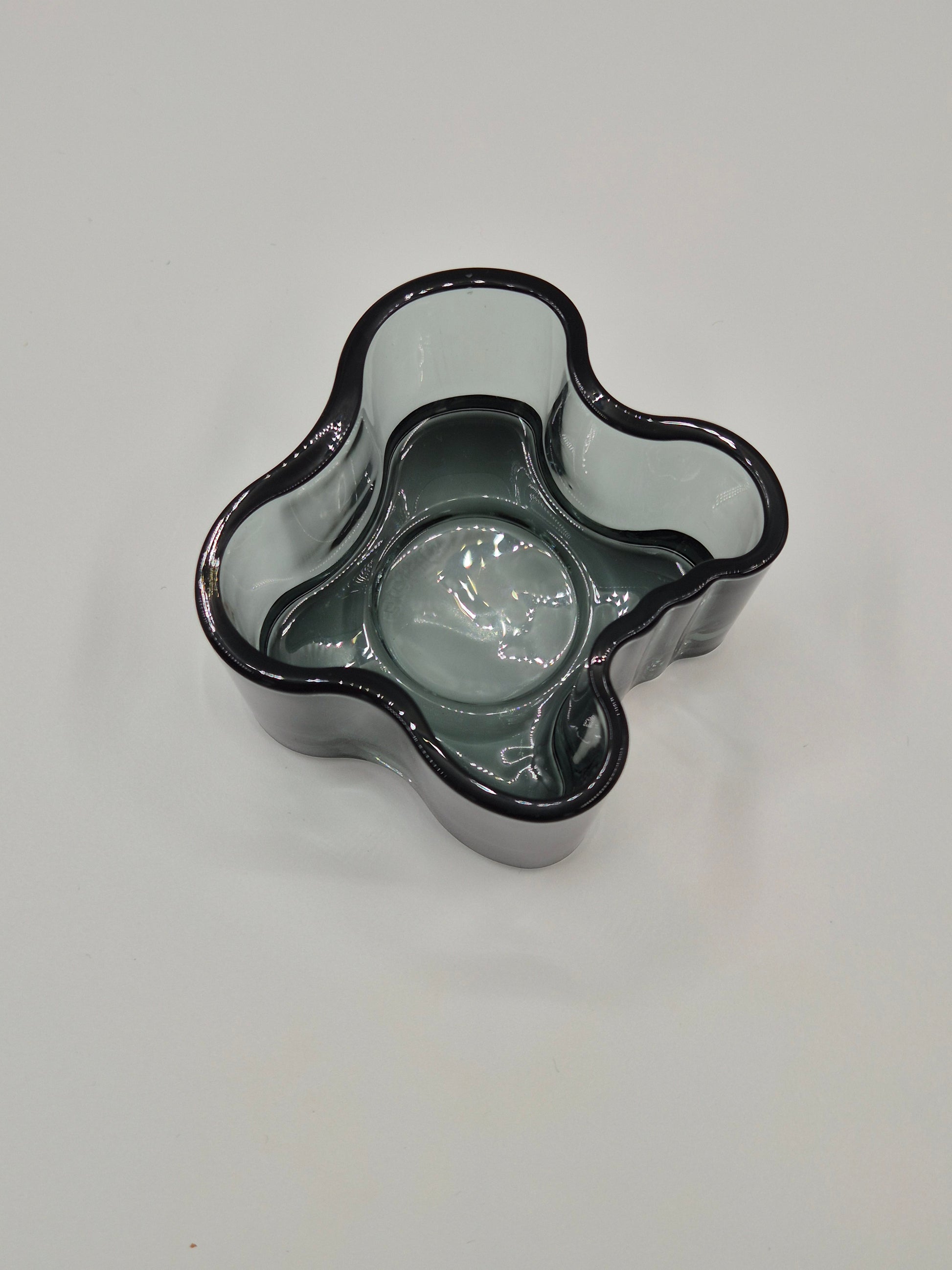 Deze kaarsenhouder, gemaakt van hoogwaardig Fins glas, combineert functionaliteit met artistieke elegantie. Perfect voor theelichtjes, kleine kaarsen of gewoon als decoratief accent, brengt hij warmte en verfijning op elk tafelblad, elke plank of vensterbank.