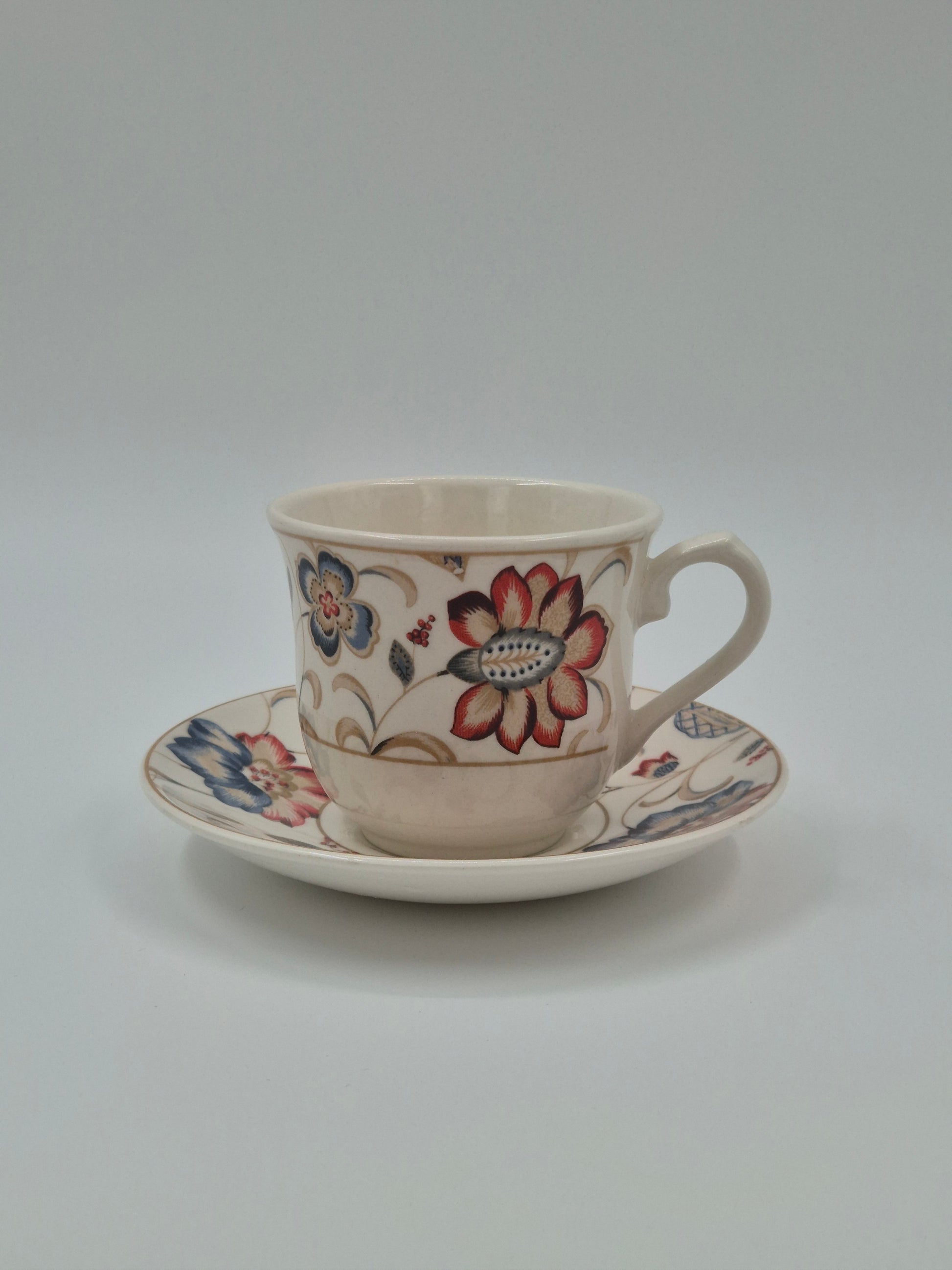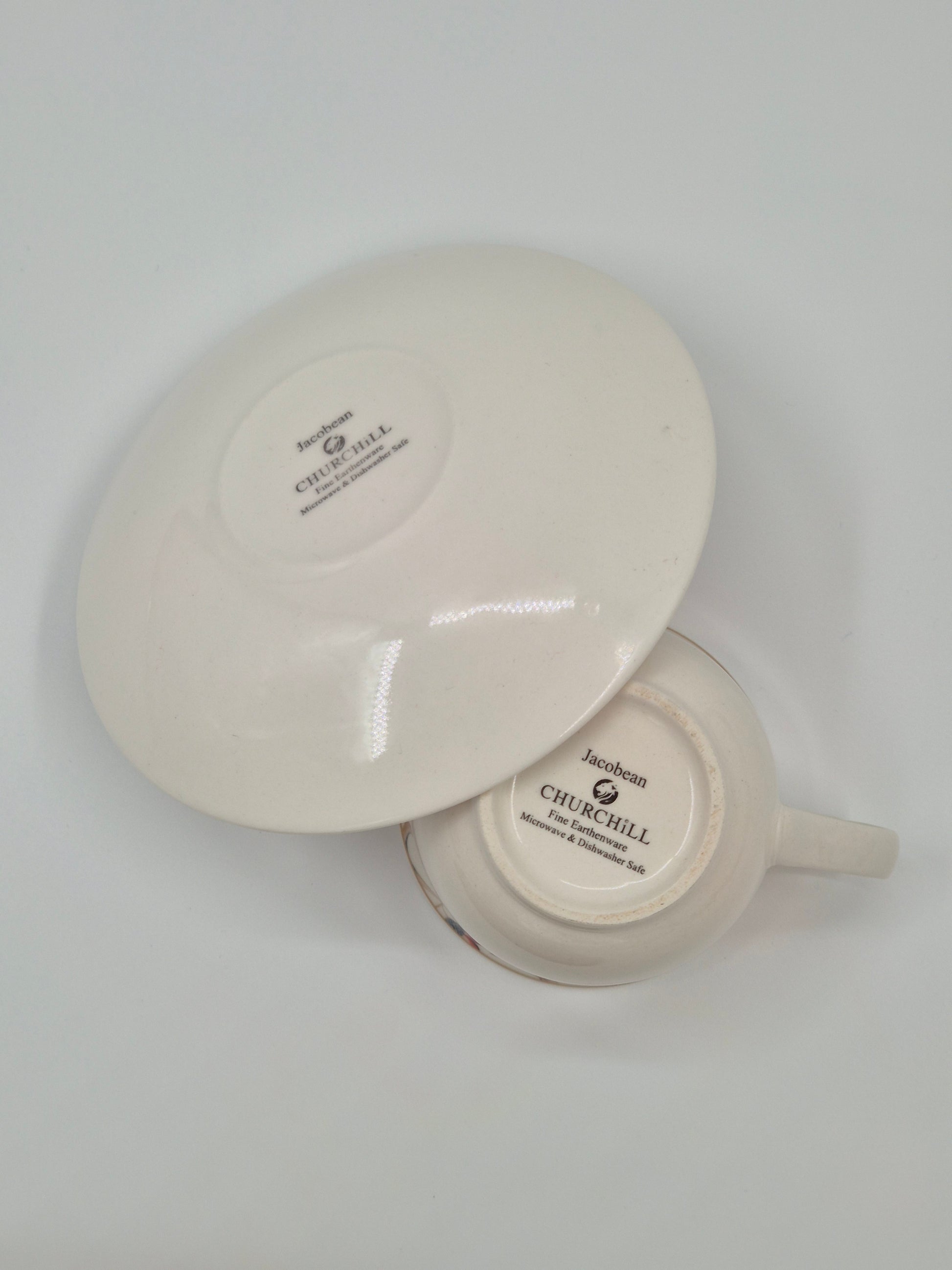 Breng tijdloze elegantie naar uw tafel met deze vintage Churchill Jacobean kop en schotel . Met het iconische Jacobean bloemenpatroon in diepe, rijke tinten combineert deze klassieke set Engels vakmanschap met vintage charme. Perfect voor uw ochtendkoffie of afternoon tea, voegt dit stuk een vleugje verfijning toe aan elke wooncollectie.
