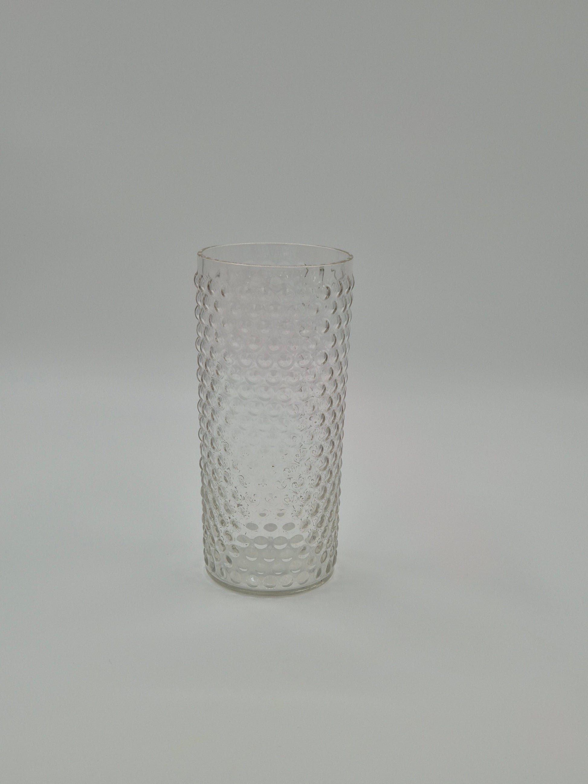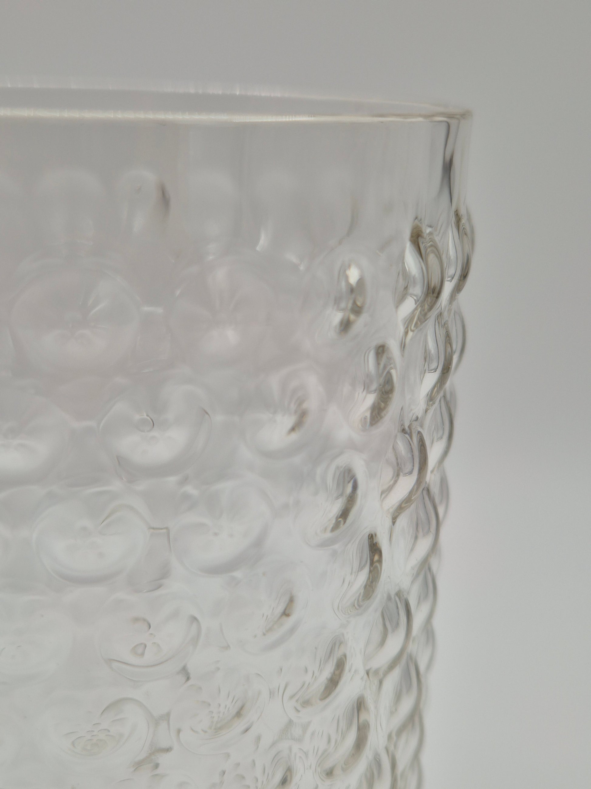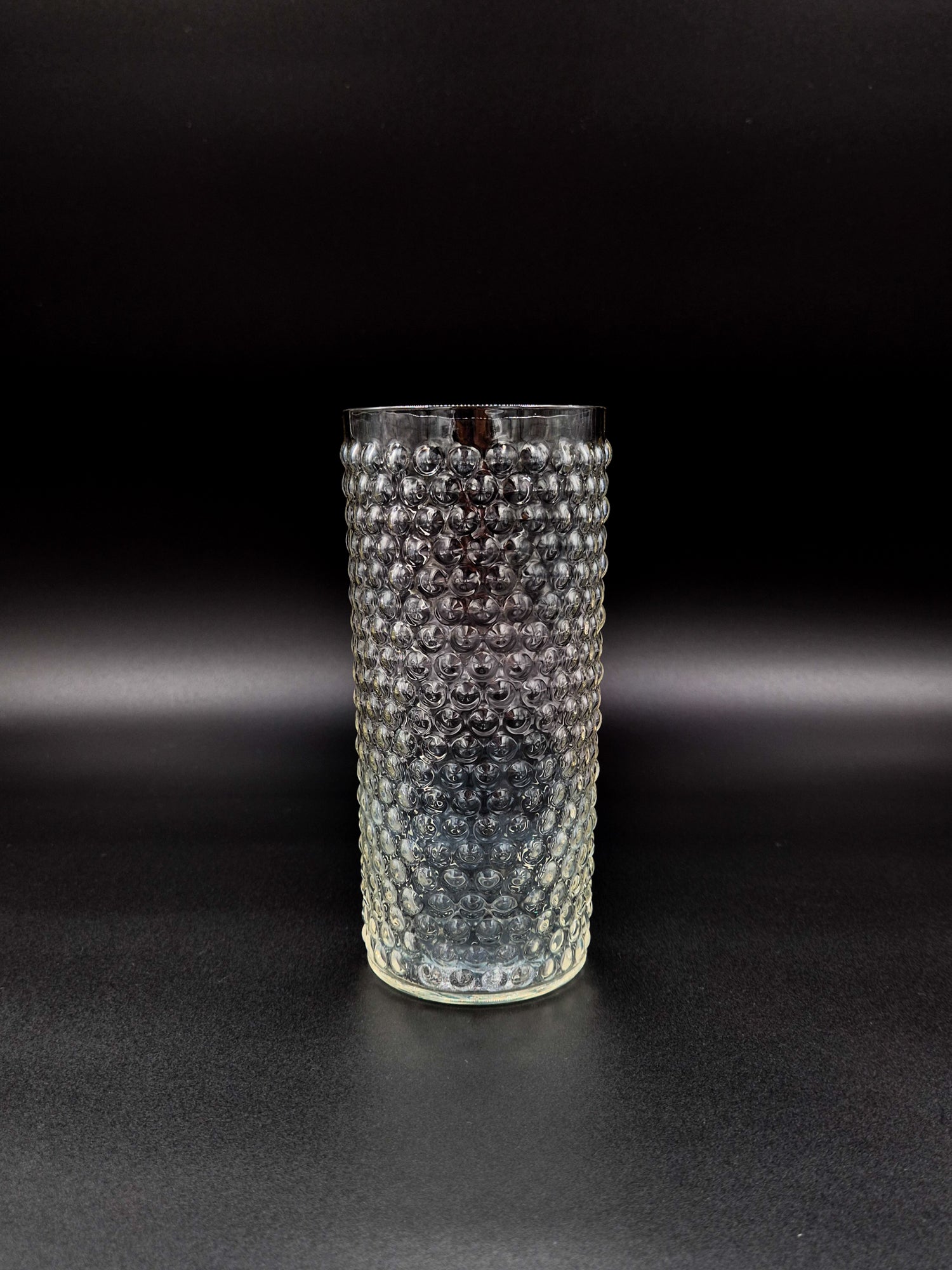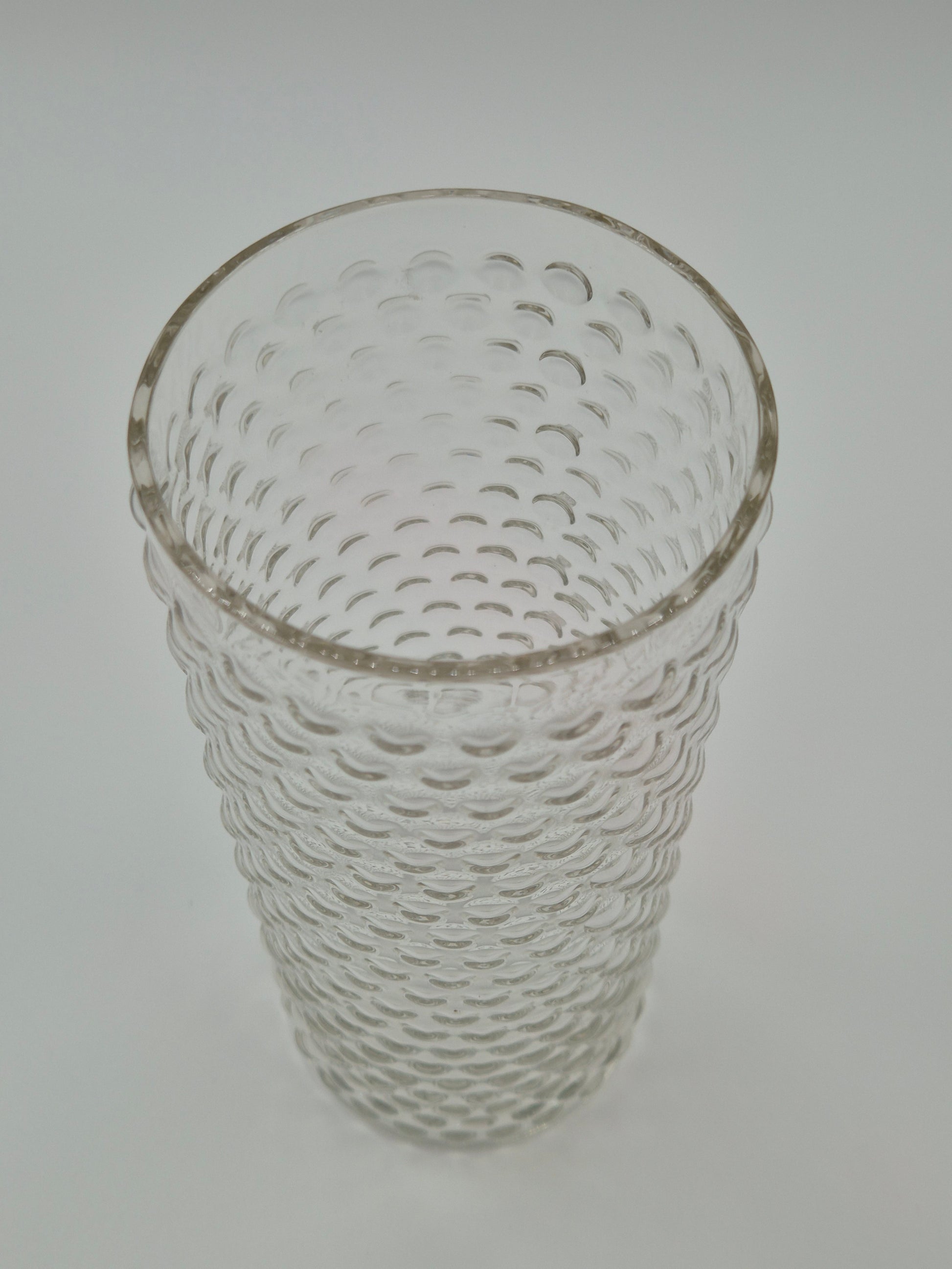 Vier het iconische Finse design met deze prachtige Saara Hopea vaas (Näppylä) , gemaakt voor Nuutajärvi in de jaren 50. De (Näppylä) serie – wat 'bult' betekent – staat bekend om de geperste glastextuur met reliëfstippen, waardoor een tastbaar oppervlak ontstaat dat prachtig met licht speelt.
