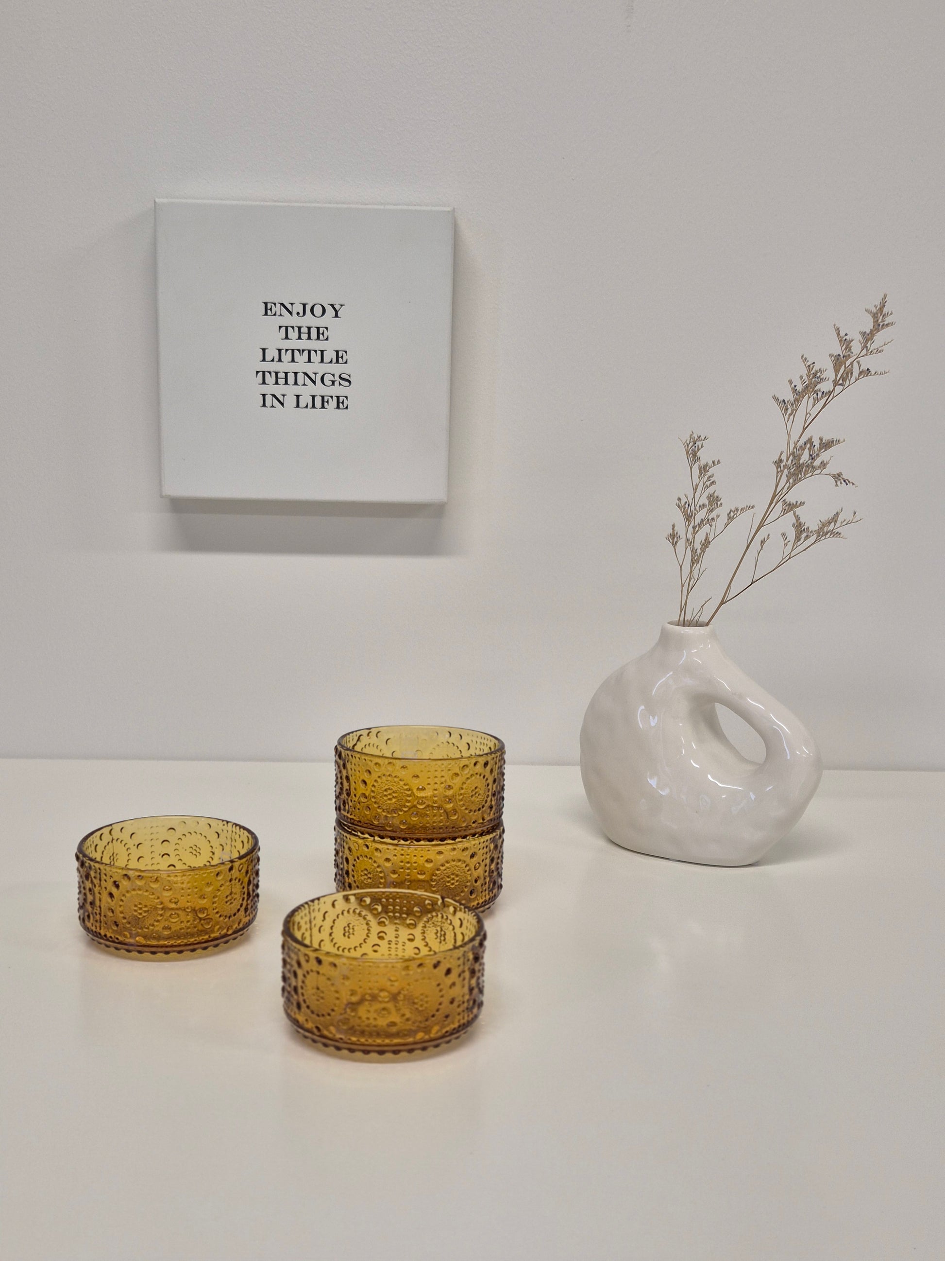 Perfect voor het serveren van salades, desserts of zelfs als stijlvol decoratiestuk. De charmante ronde noppen creëren een tactiele, speelse textuur die doet denken aan druiven, die de inspiratie vormden voor de naam "Grapponia". Gemaakt van geperst glas in warme ambertinten, geeft het zowel karakter als elegantie aan elke tafelsetting. H 5 cm Ø 9,2 cm