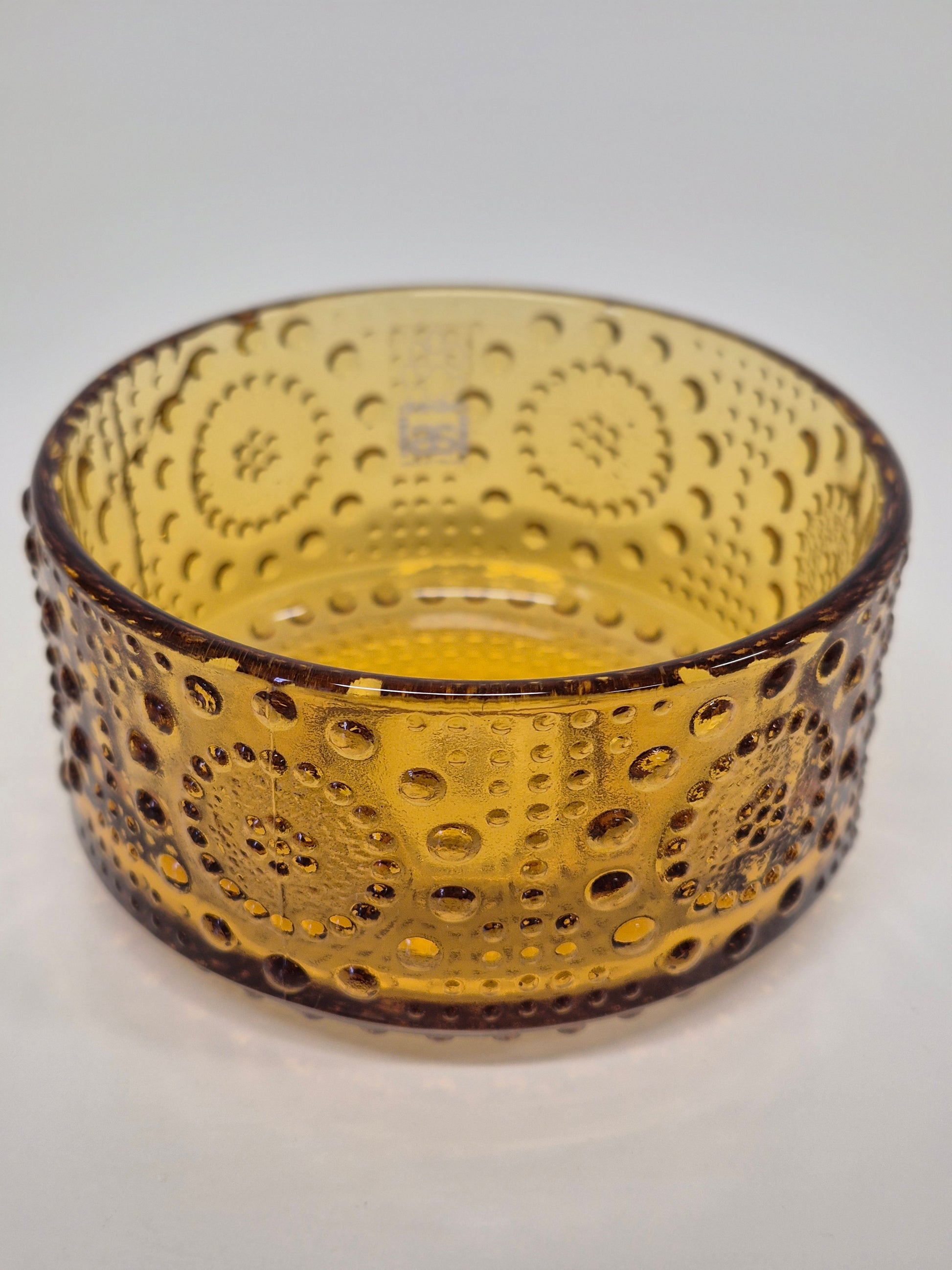 Voeg een vintage Finse klassieker toe aan je huis met deze prachtige amberkleurige Grapponia serveerschaal , ontworpen door de iconische Nanny Still voor Riihimäen Lasi. Deze schaal, geproduceerd tussen 1971 en 1975 , is een prachtig voorbeeld van Scandinavisch design uit het midden van de vorige eeuw.
