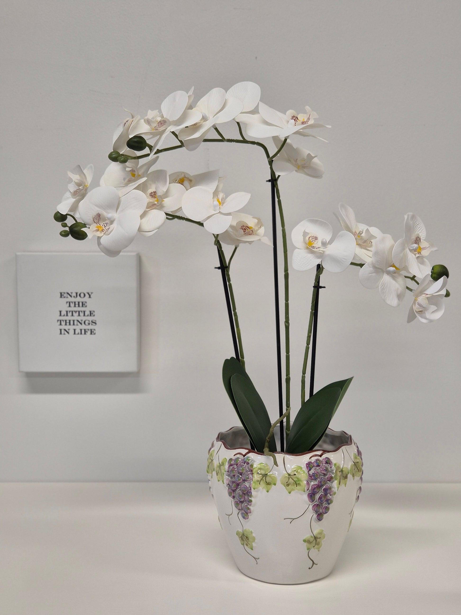 Breng een vleugje mediterrane charme in huis of tuin met deze vintage Alcobaça bloempot , prachtig handbeschilderd met een opvallend druivenmotief. Deze keramische bloempot, vervaardigd in de traditionele Alcobaça aardewerkstijl uit Portugal, combineert levendige kunst met rustieke elegantie.