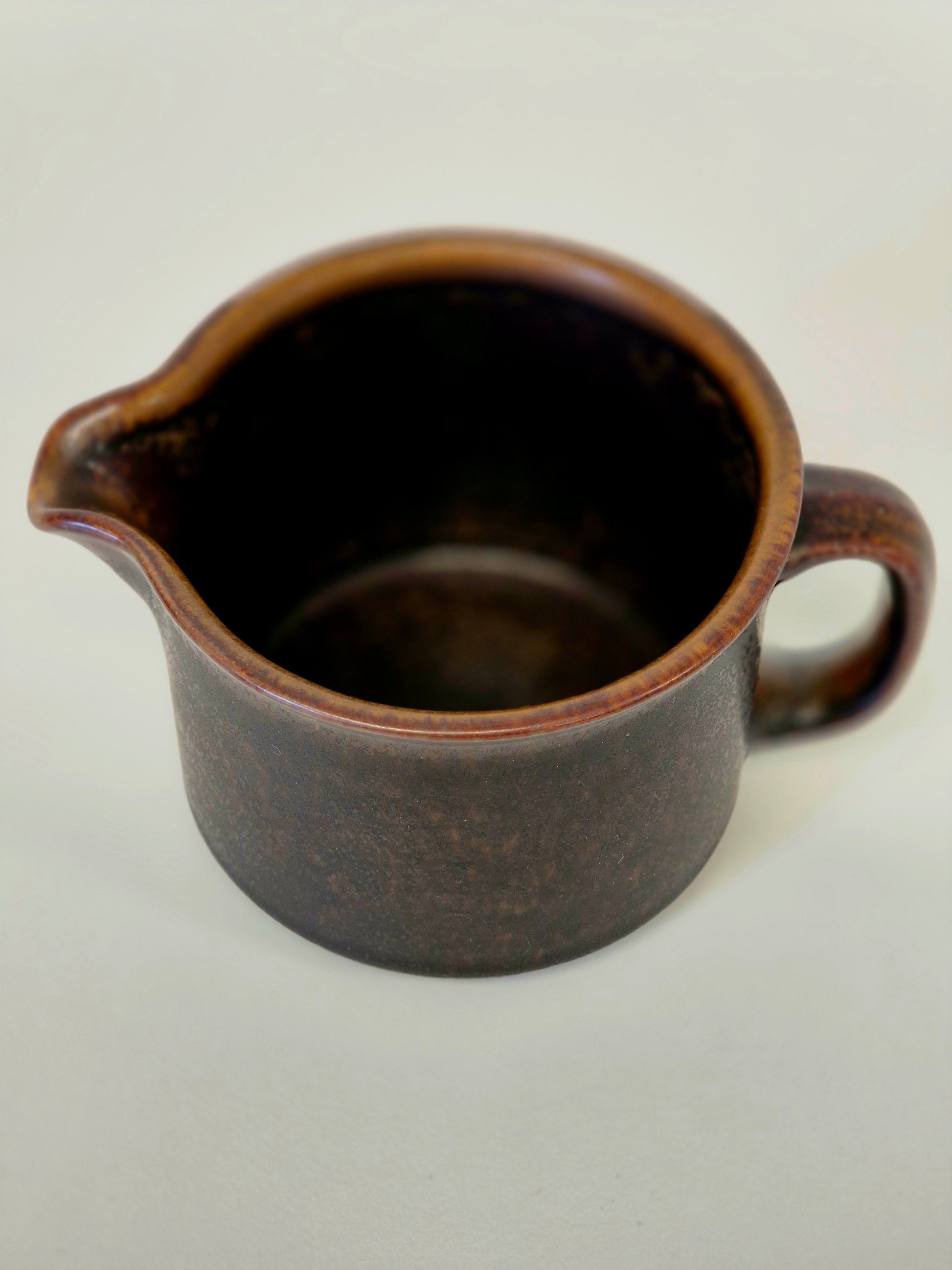 Deze vintage Arabia Ruska-kan , ontworpen door de beroemde Finse ontwerpster Ulla Procopé , is een tijdloos stukje Scandinavische keramische kunst. De kan, geproduceerd tussen 1960 en 1999, is voorzien van Arabia's iconische Ruska- glazuur: een aardse, getextureerde bruine kleur die subtiel varieert per stuk, wat hem een unieke, handgemaakte uitstraling geeft.