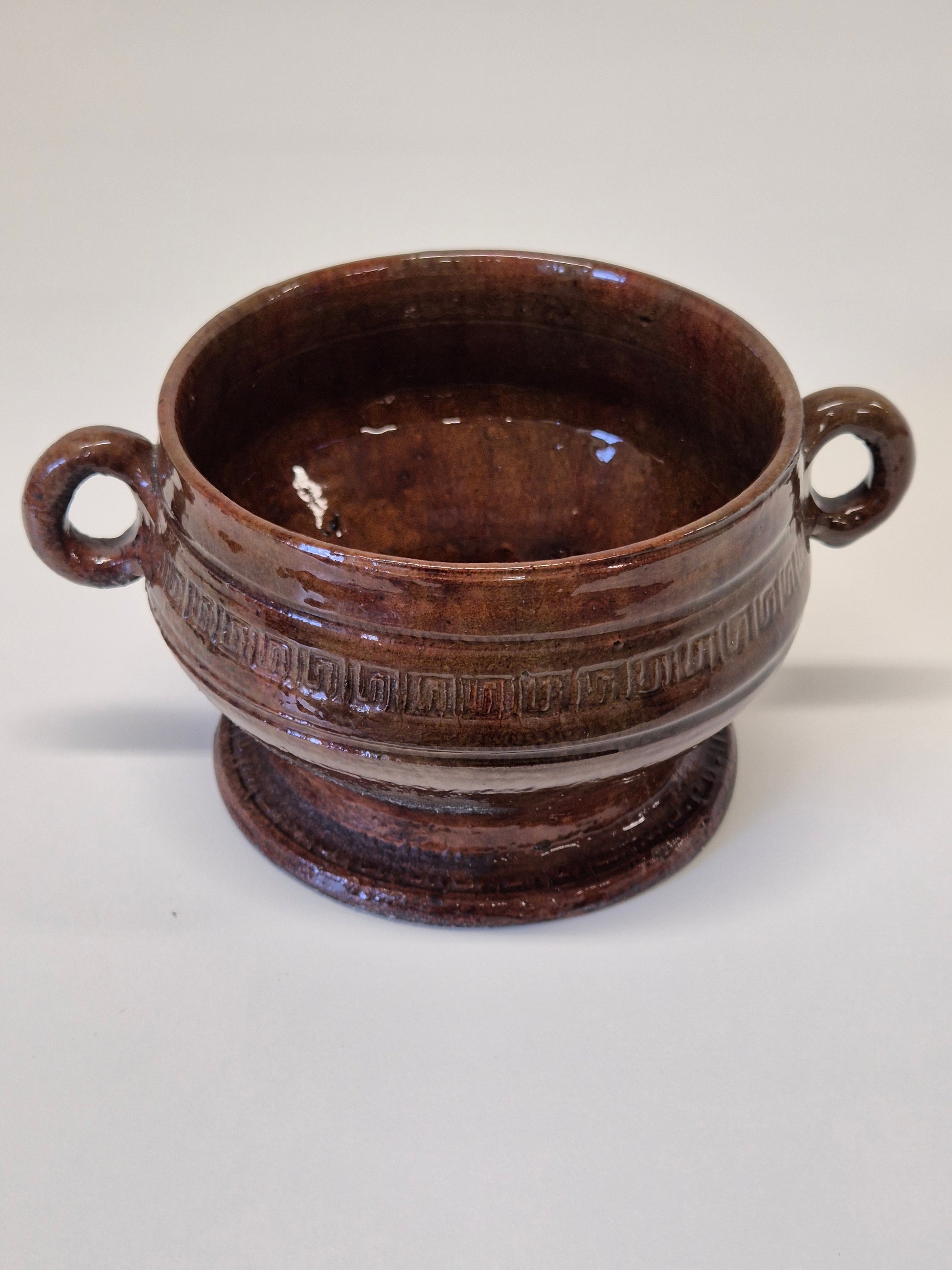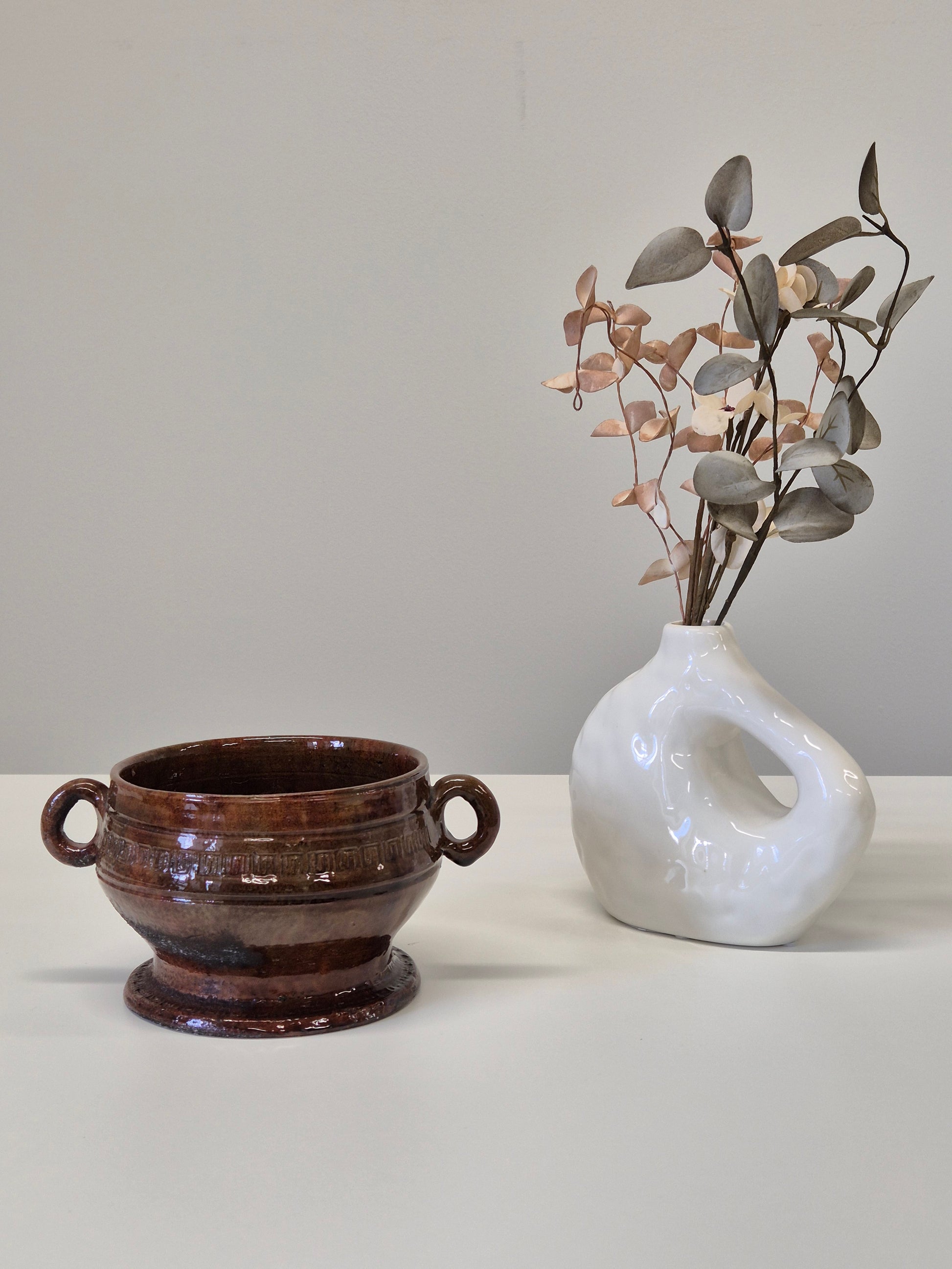 Voeg organische textuur en tijdloze charme toe aan uw ruimte met deze Vintage Clay Pot met handgrepen , een prachtig verouderd aardewerken vat dat ziel toevoegt aan elke omgeving.