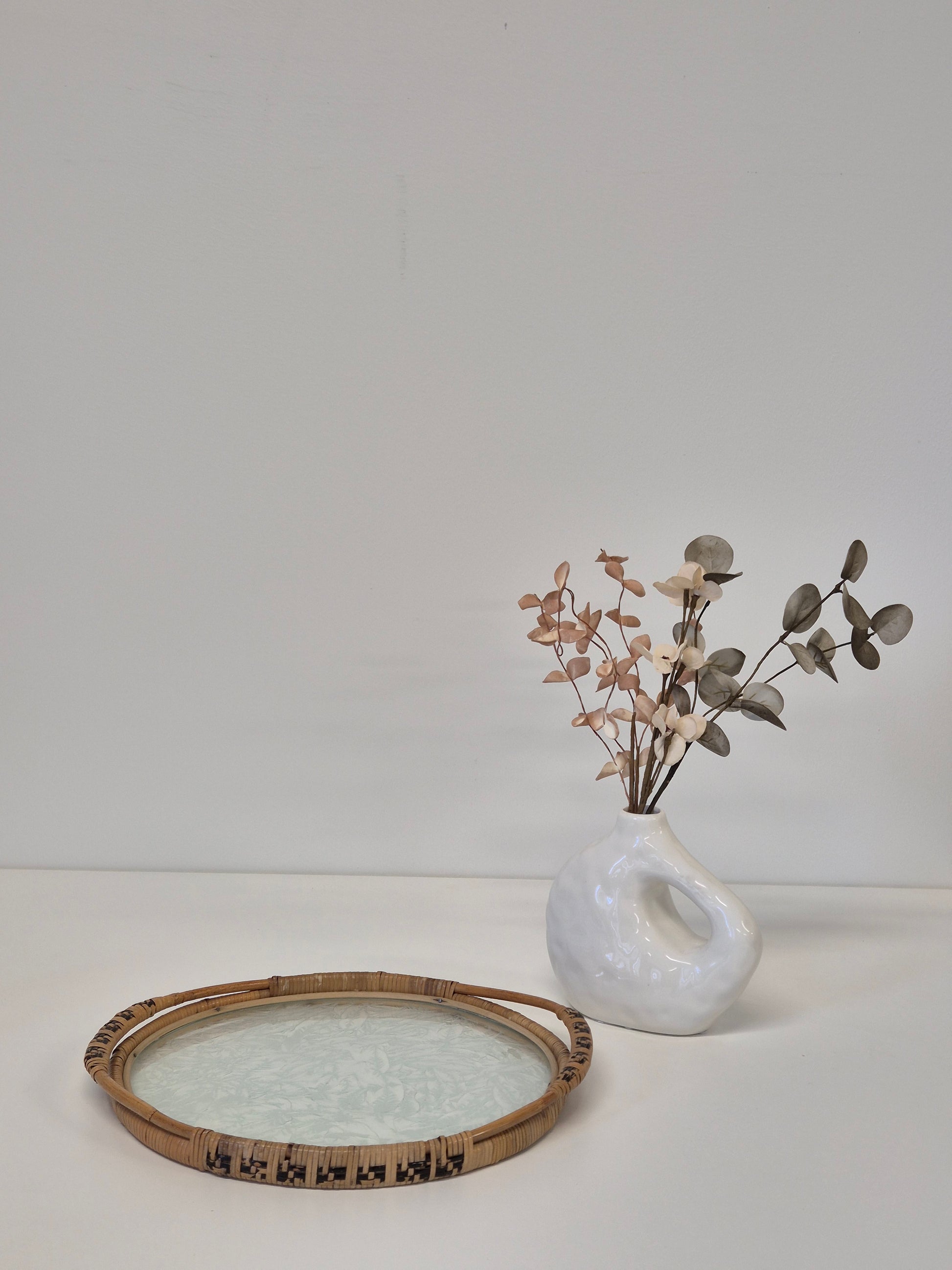 Voeg een vleugje vintage warmte en natuurlijke schoonheid toe aan uw huis met deze Vintage Rattan Glass Tray , een prachtig vervaardigd serveerstuk dat textuurrijk gevlochten rotan combineert met een gladde glazen bodem .
