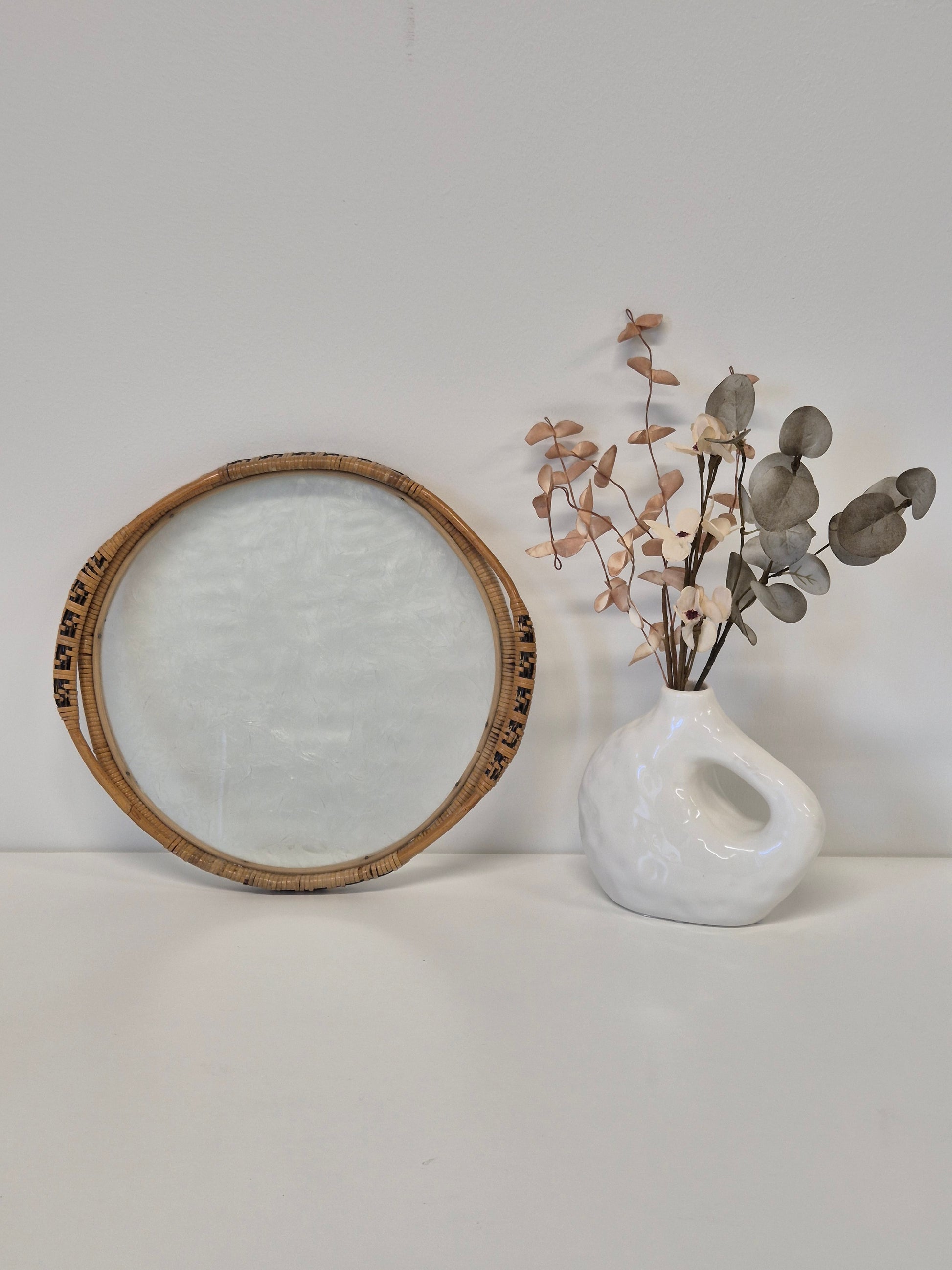 Met een royale afmeting van 30,5 x 28,5 cm is dit dienblad perfect voor het serveren van drankjes, het presenteren van fruit of gebak, of als decoratieve basis voor kaarsen, vazen of verzamelobjecten. De glazen inzet biedt een functioneel en gemakkelijk schoon te maken oppervlak, terwijl het handgemaakte rotan frame elke ruimte een aardse elegantie geeft.