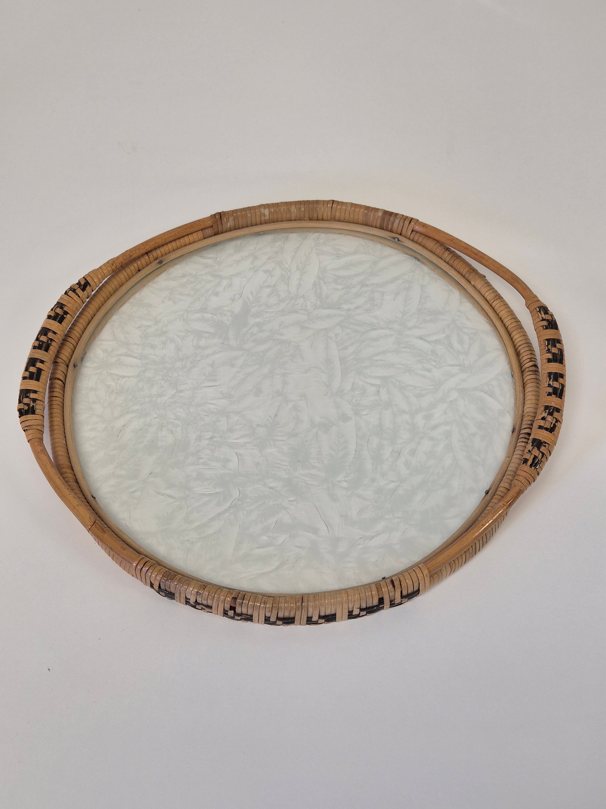 Vintage rotan glazen dienblad - grote geweven serveerschaal