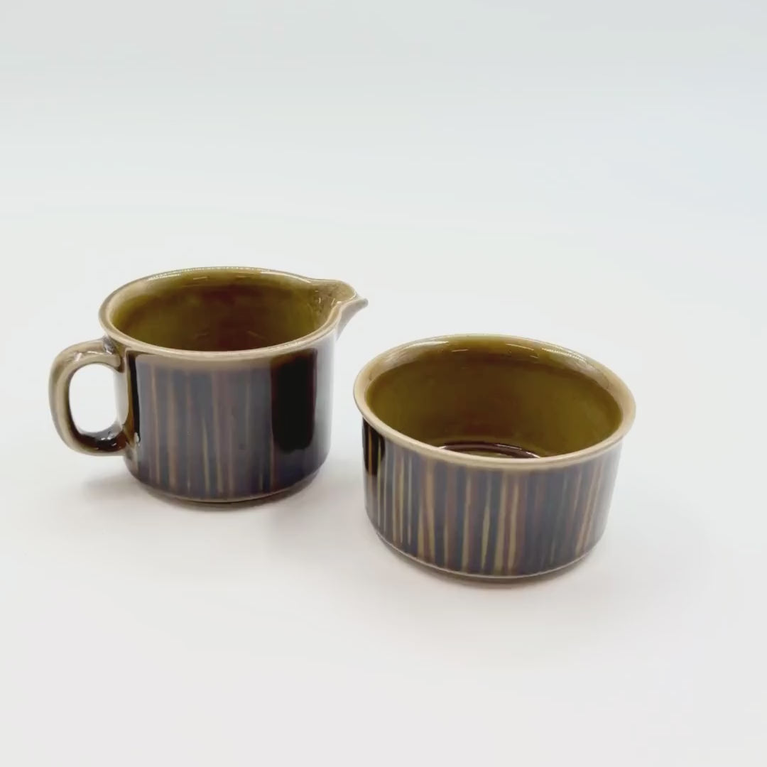 Complete your vintage tableware collection with this Arabia Kosmos Sugar Bowl and Creamer, designed by Gunvor Olin-Grönqvist and produced by Arabia Finland between 1963 and 1976. Part of the beloved Kosmos series, these pieces feature the signature hand-painted vertical stripe motif in rich, earthy browns and olive tones. Made from high-quality stoneware, they’re as functional as they are decorative—perfect for everyday use or vintage display. This timeless pair reflects the refined simplicity and craftsmanship of mid-century Scandinavian design.