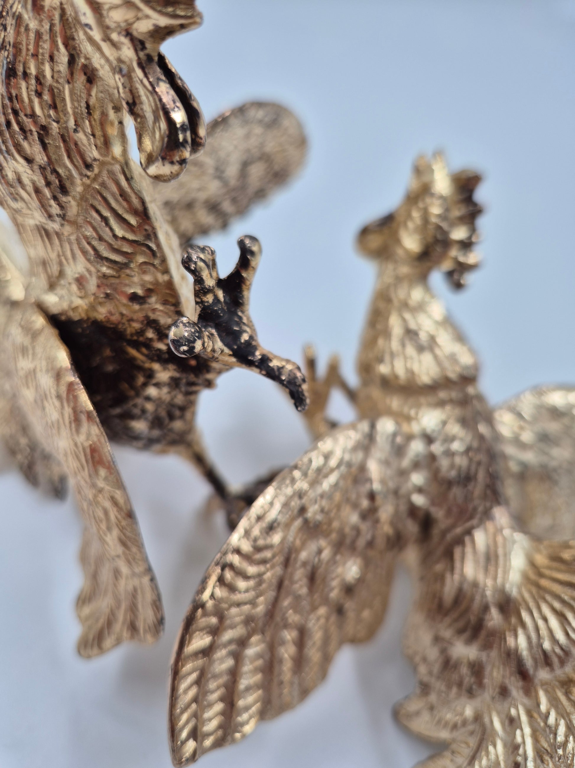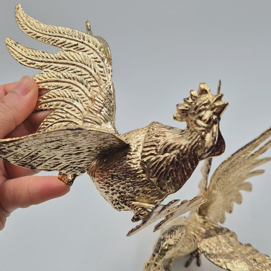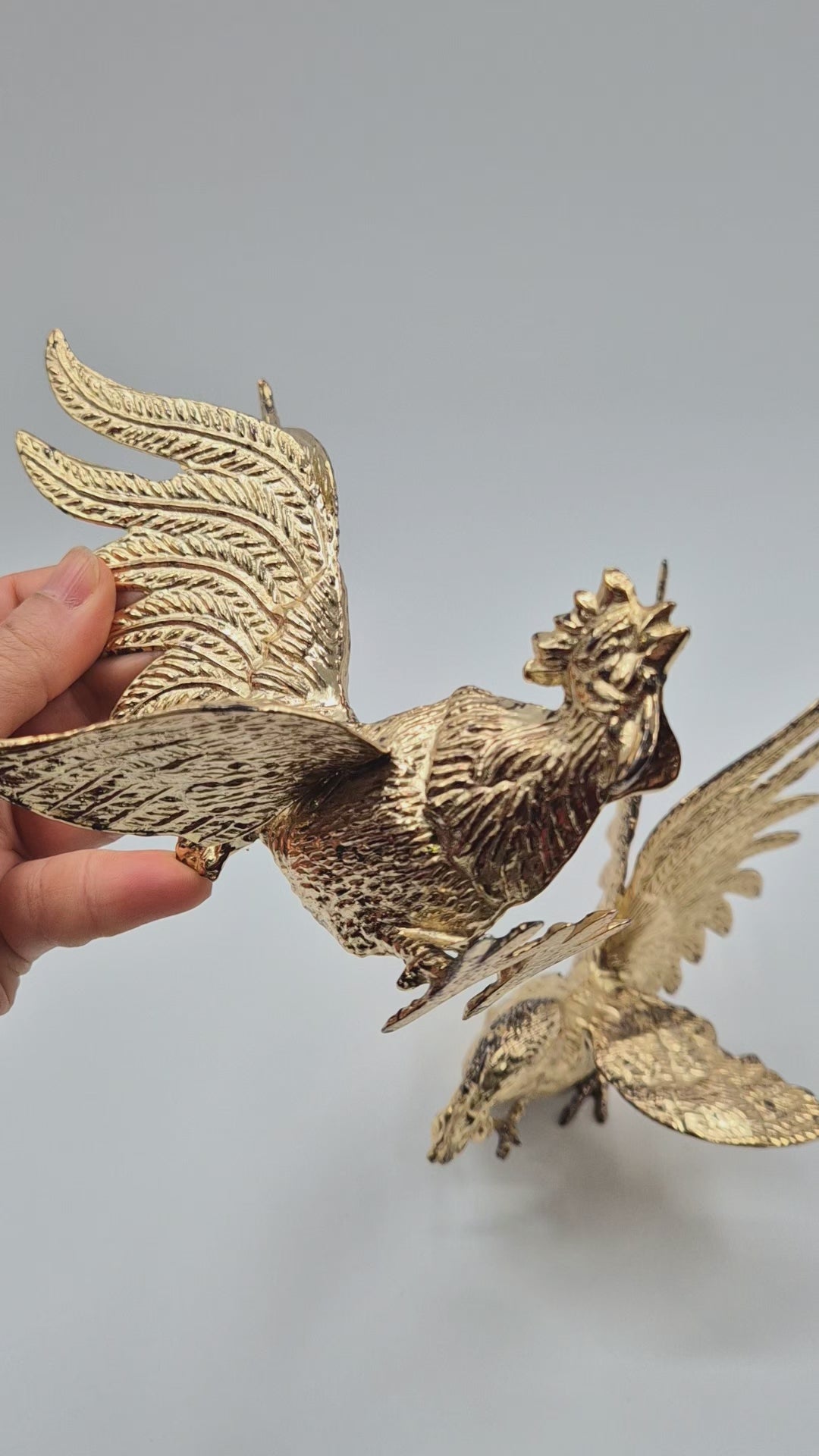Bring a bold, retro statement to your home with this Vintage Brass Fighting Rooster Sculpture. Crafted in the 1960s, this mid-century piece captures the dynamic energy and proud stance of a fighting rooster, making it a striking addition to any décor.