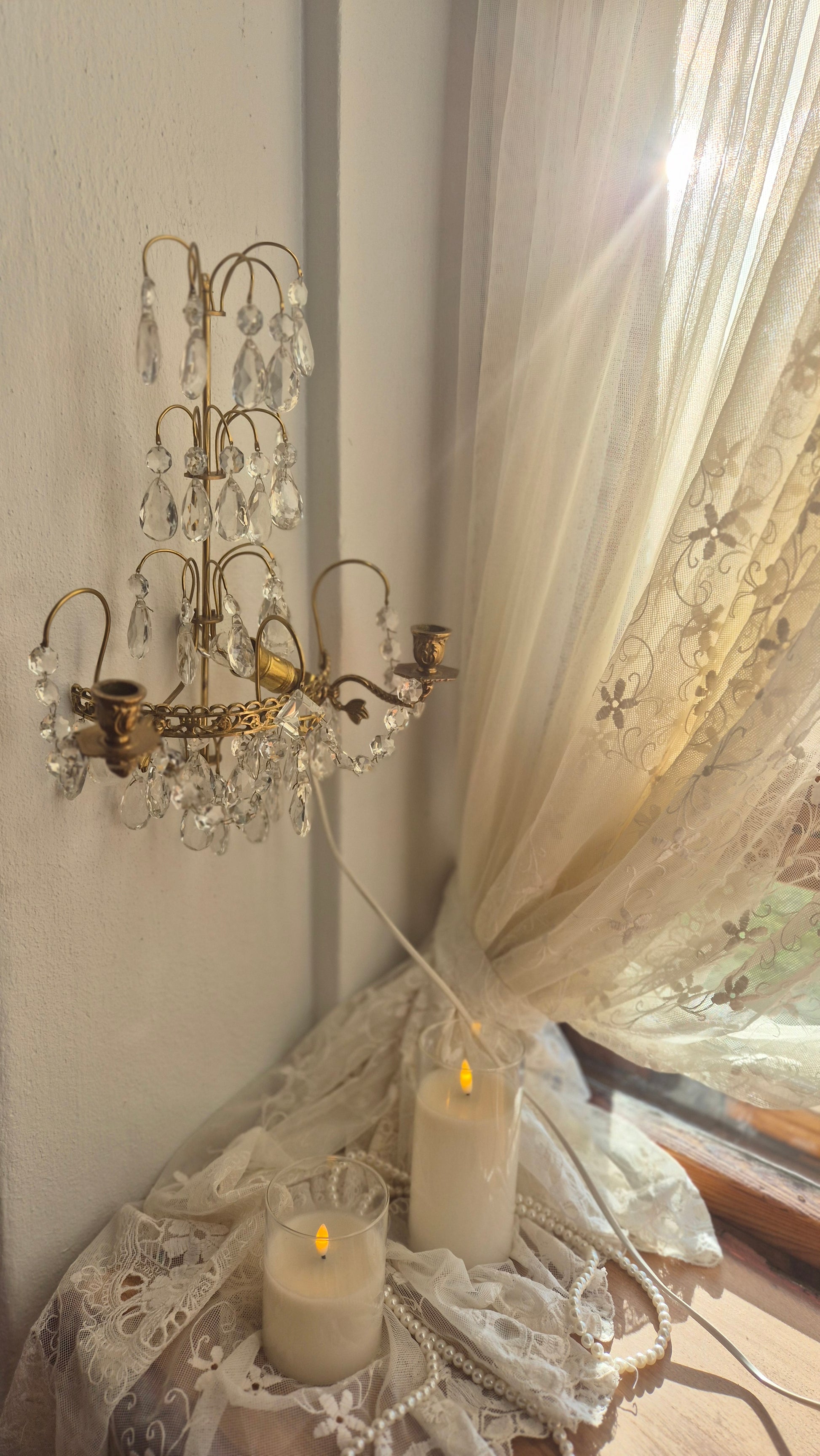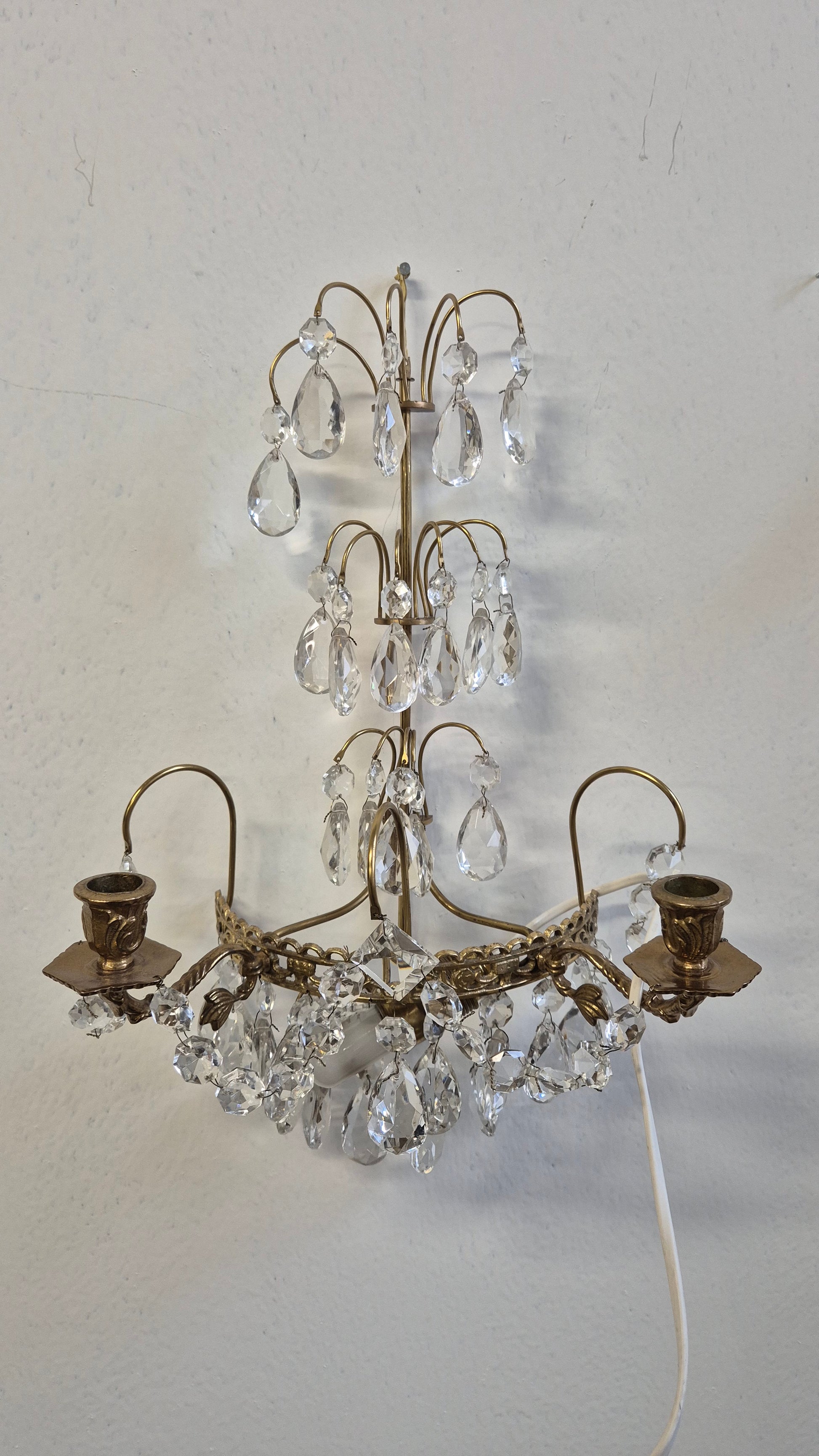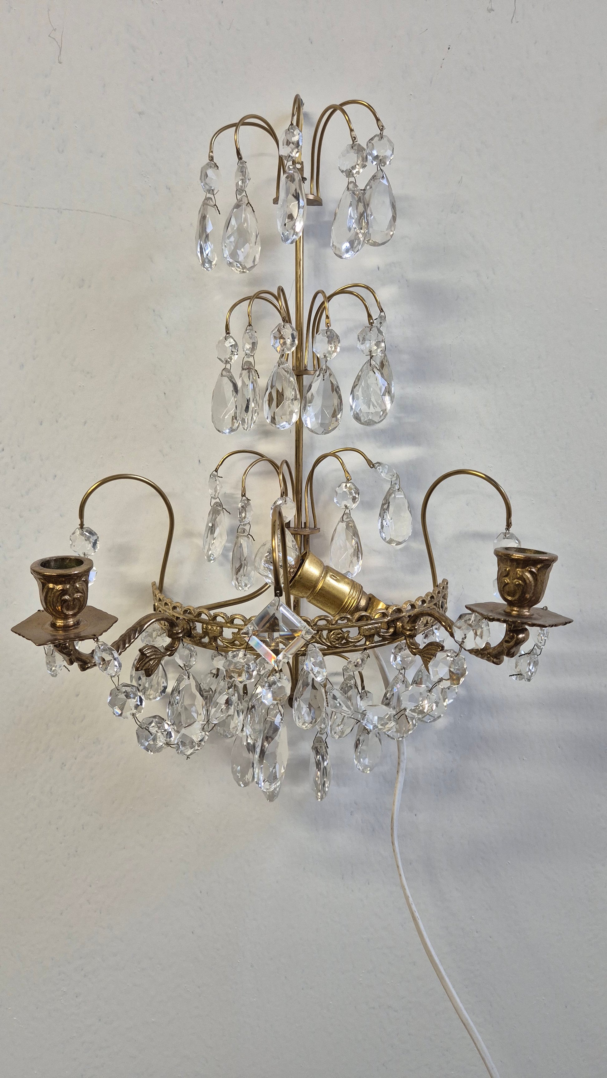 Enhance your living space with this exquisite vintage wall sconce, featuring a harmonious blend of crystal and brass elements. Its dual candle holders add a warm, inviting glow, making it both elegant and cozy. Perfect for creating a sophisticated ambiance in any room.