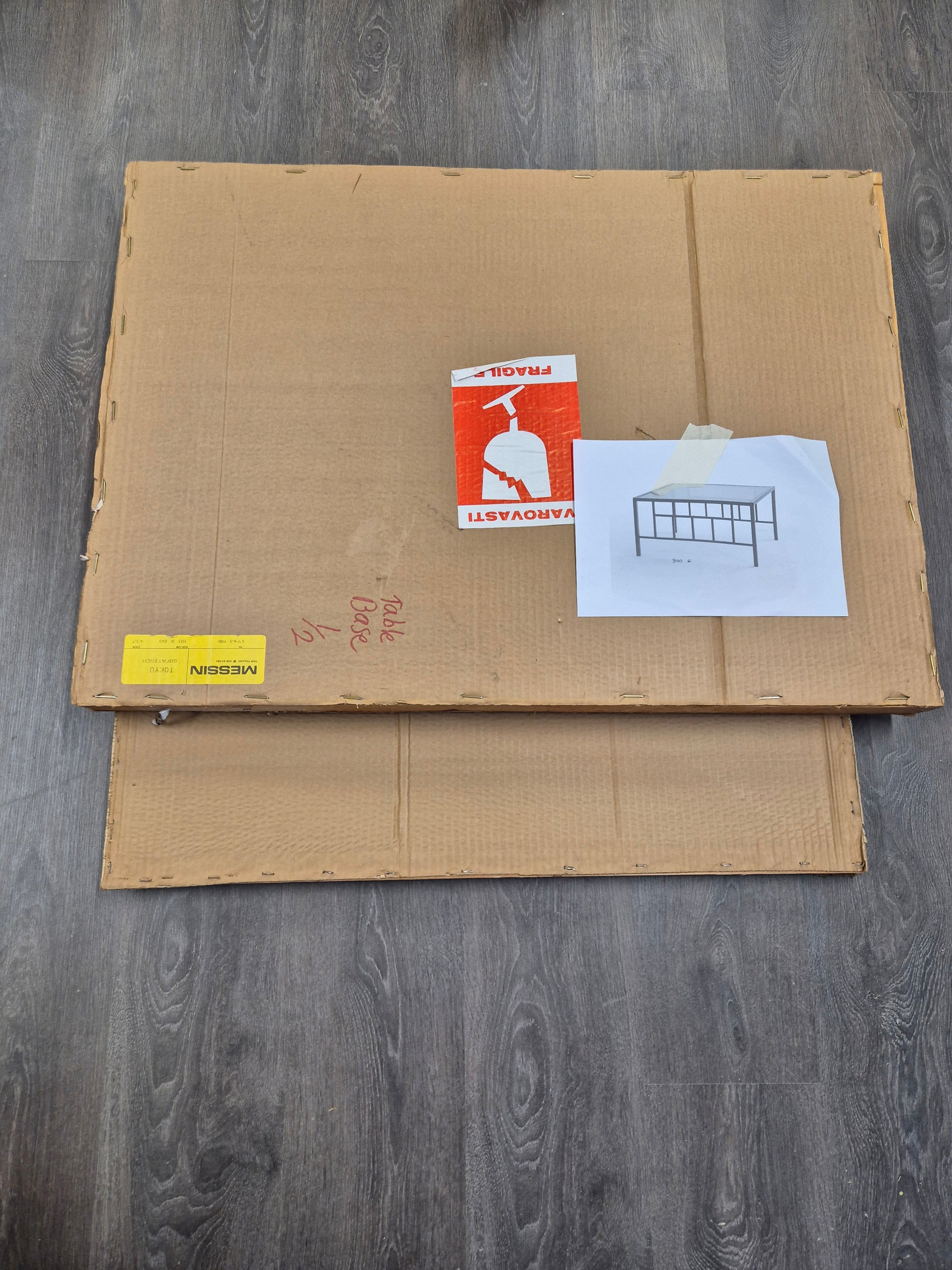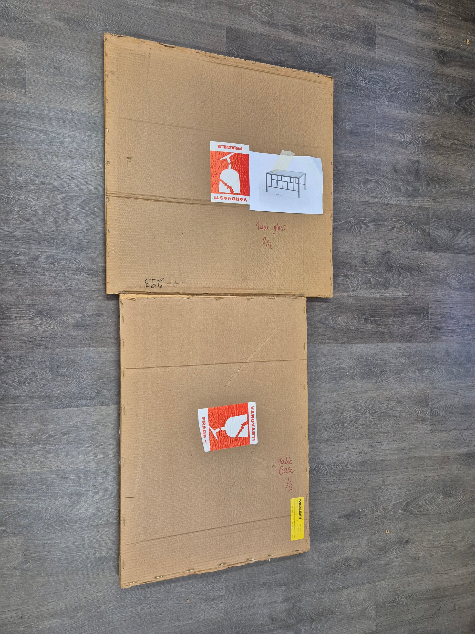 The frame and glass top were originally packed separately for safety. To make delivery easier, they will be carefully secured together and shipped as one package. Assembly is simple.