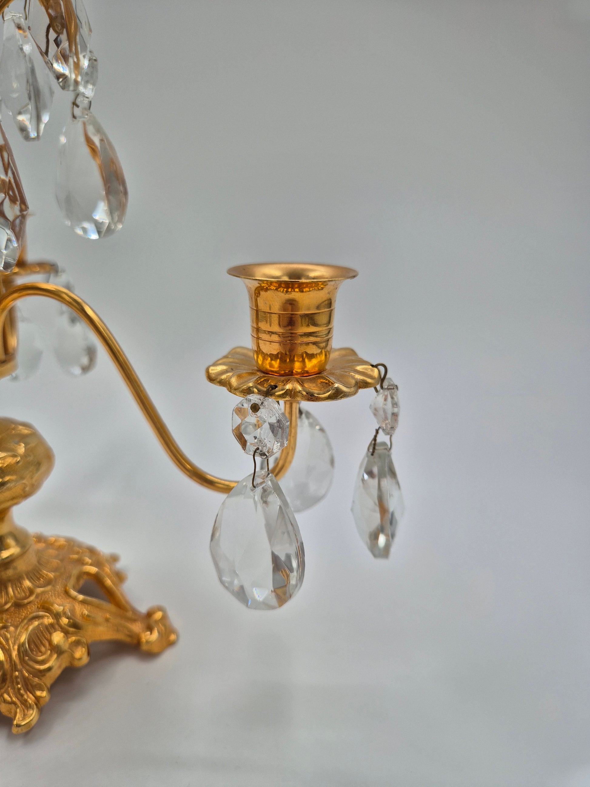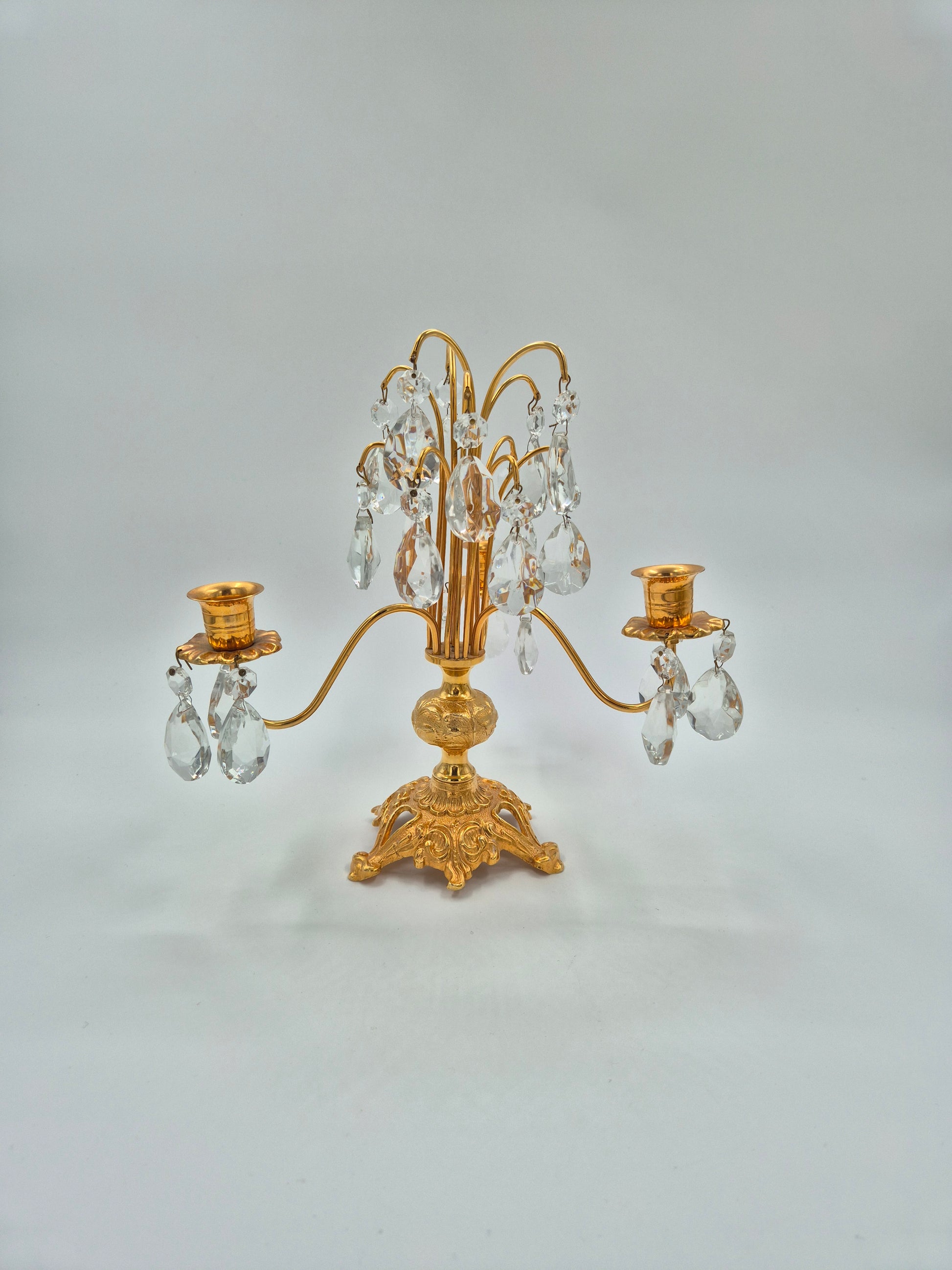 Elegant 3-arm candelabra by Turun Kristalli, crafted with a brass structure and adorned with clear faceted crystal drops. The design reflects classic European elegance with a strong decorative presence ornate base, gently curved arms, and hanging crystals that catch and reflect light beautifully.
