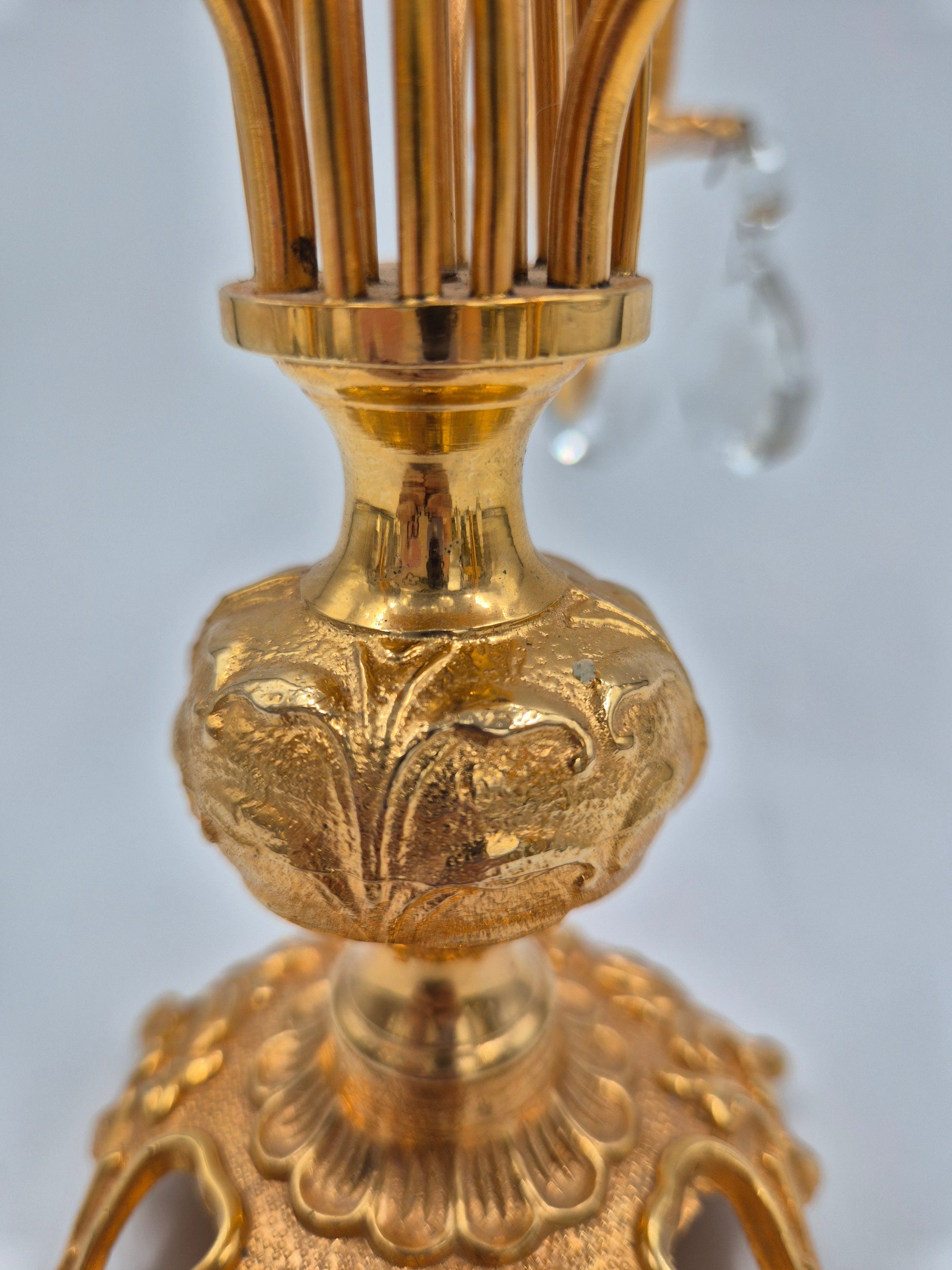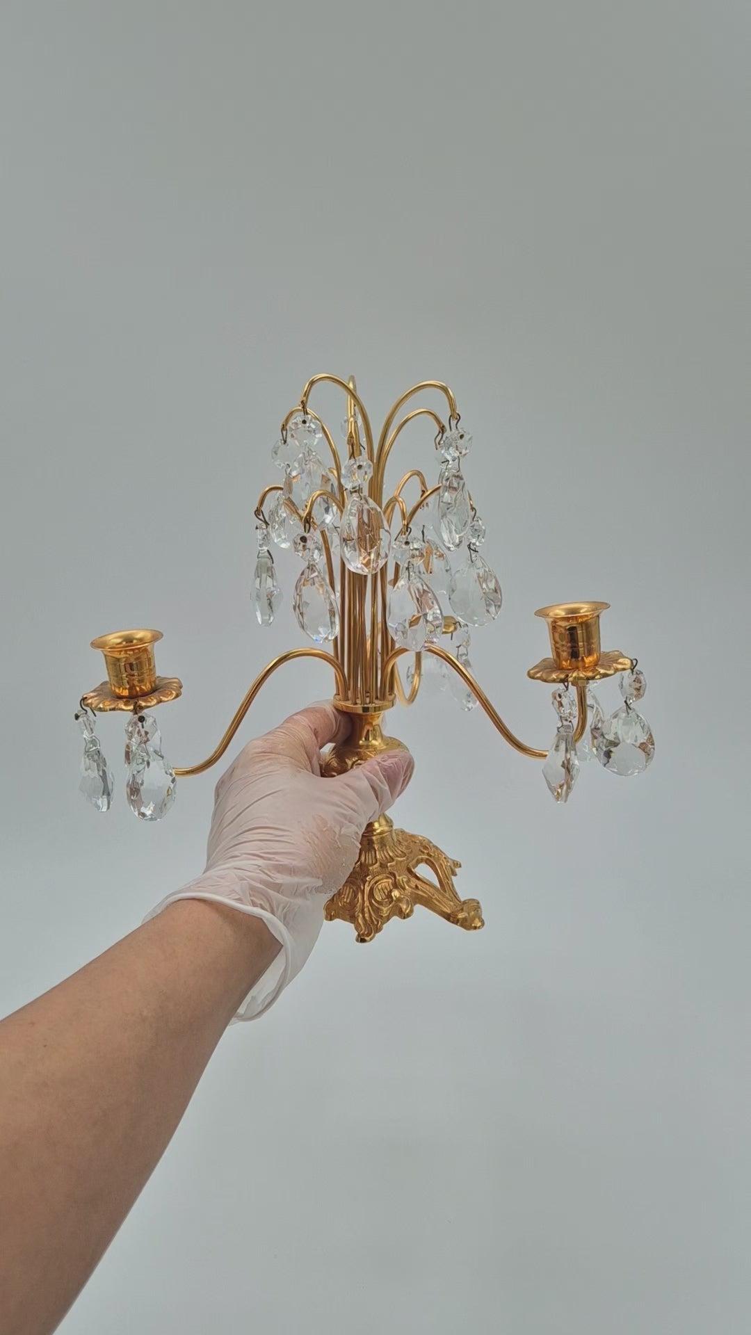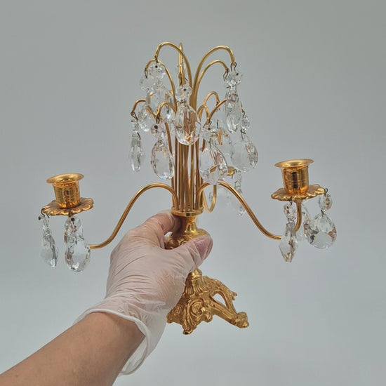 This piece works perfectly as a table centerpiece, mantel decoration, or atmospheric lighting accent. The brass shows a warm tone, and the crystal elements add refined brilliance without overpowering the design.