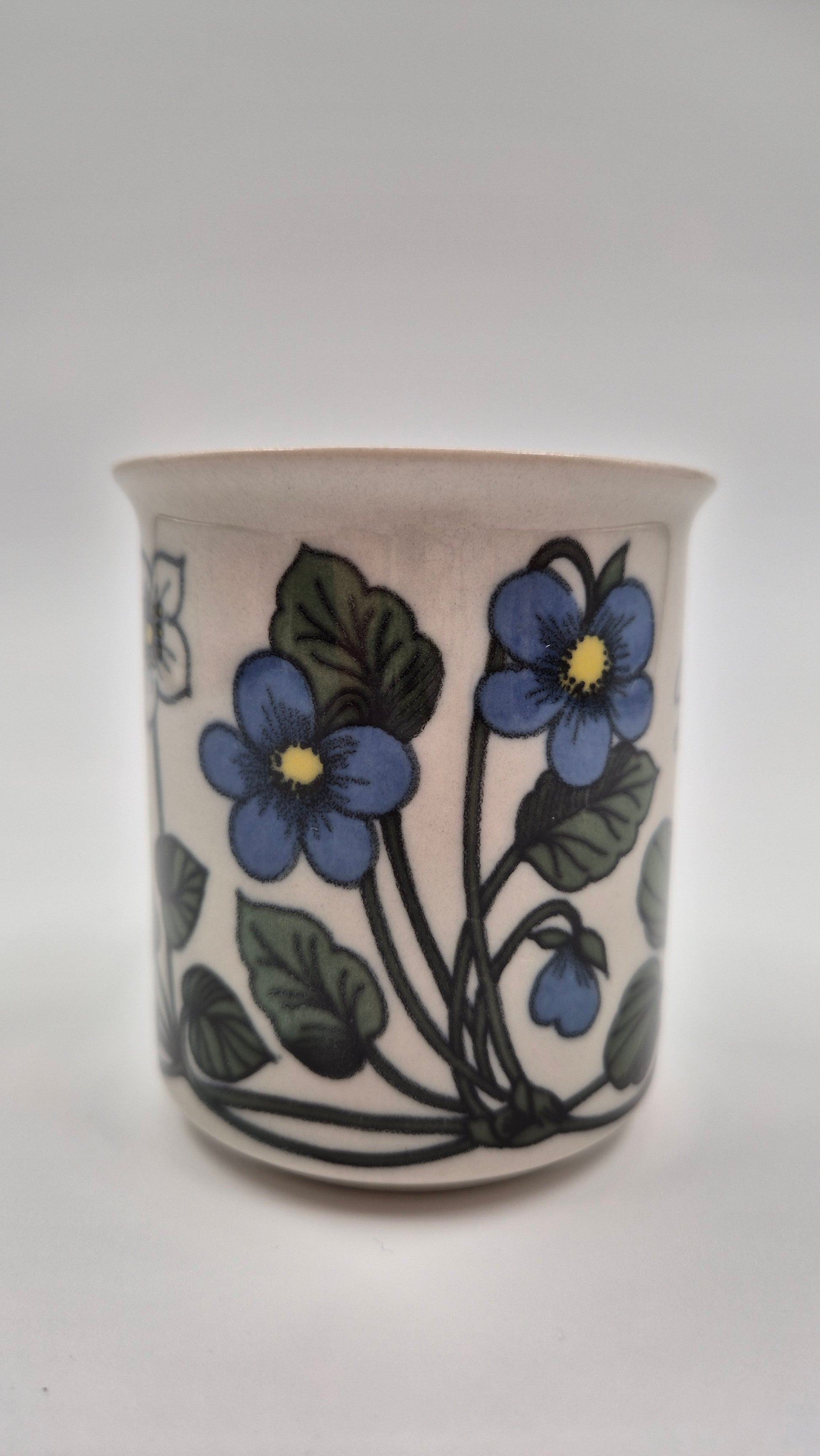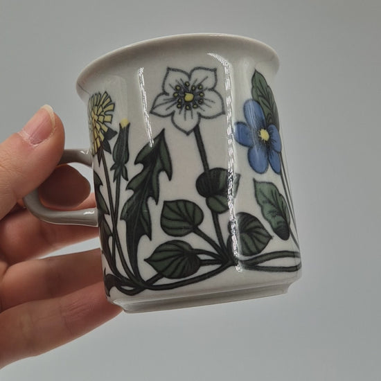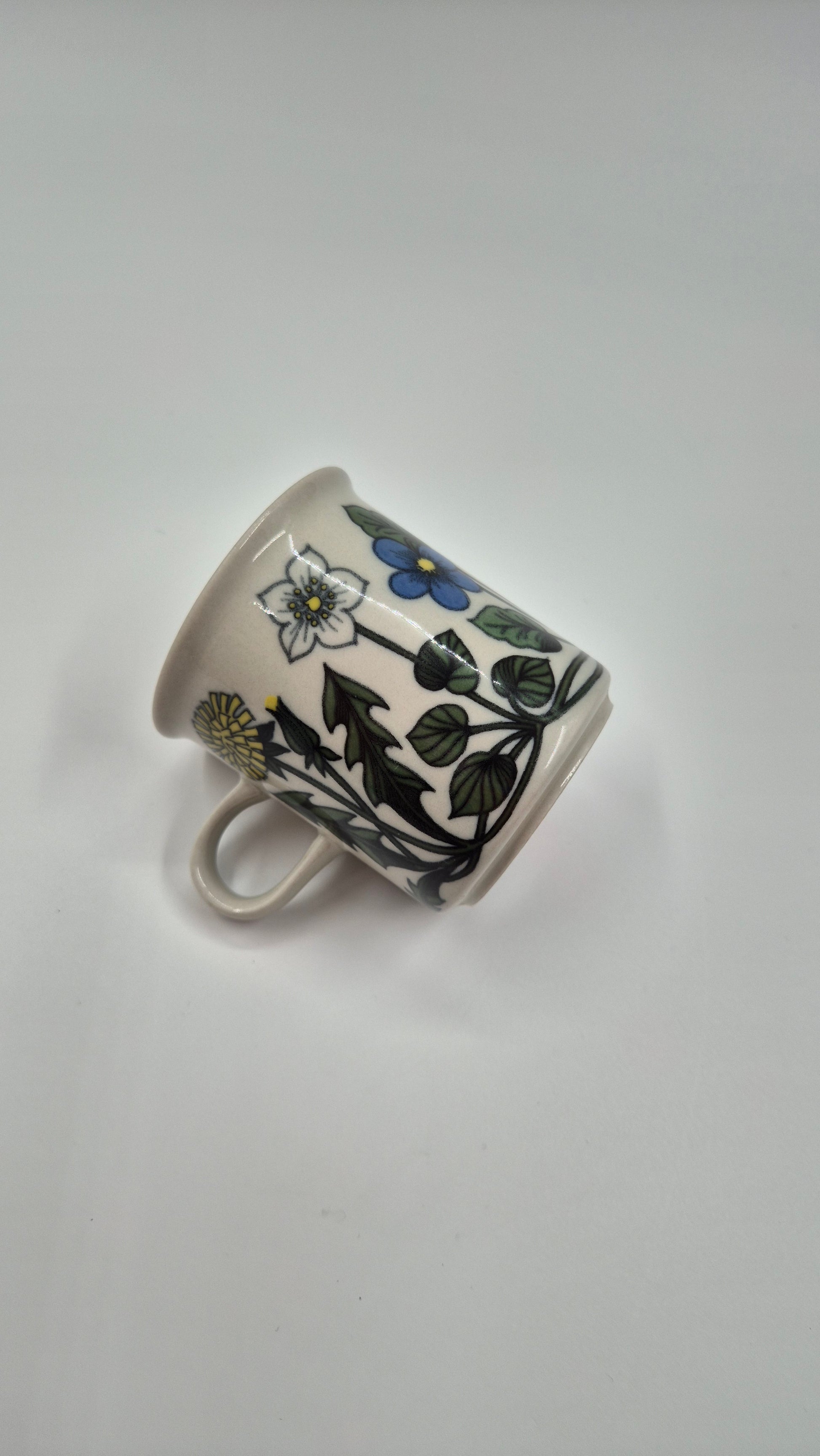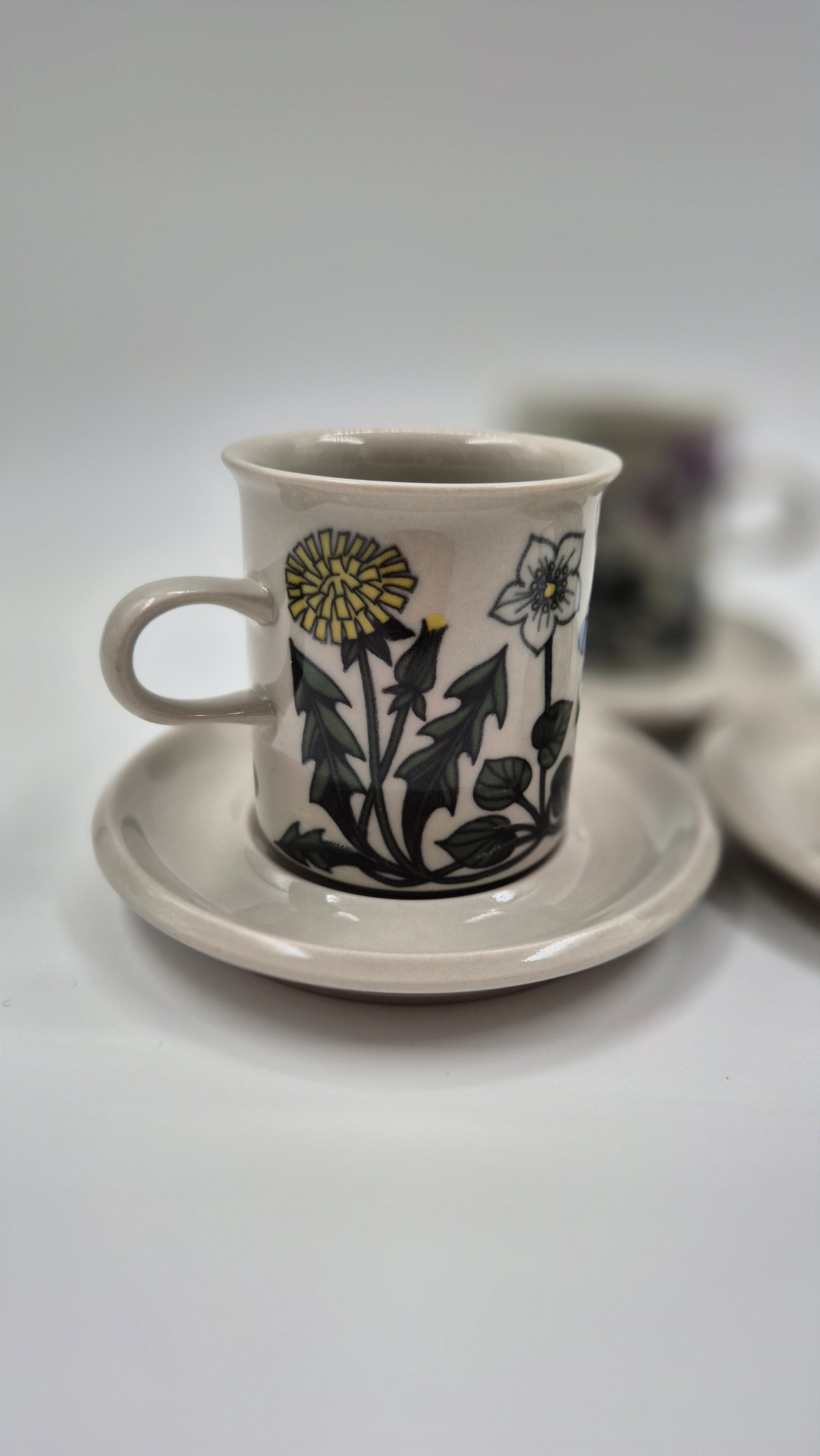 This is a vintage Arabia Finland Flora coffee cup and matching saucer, produced in Finland around 1979–1981. The floral decoration was designed by Esteri Tomula, one of Arabia’s most celebrated artists, known for her detailed botanical patterns inspired by Nordic nature.