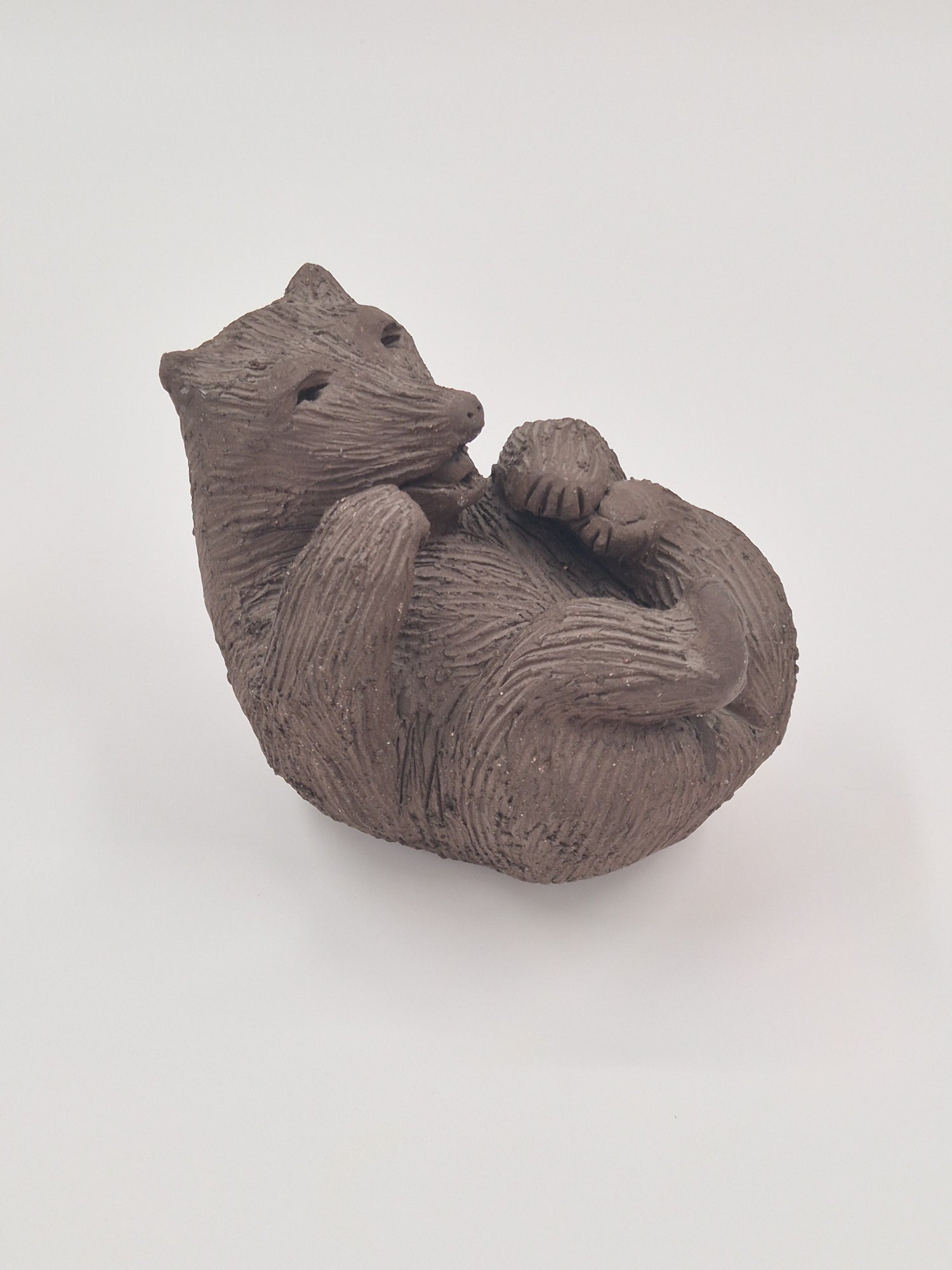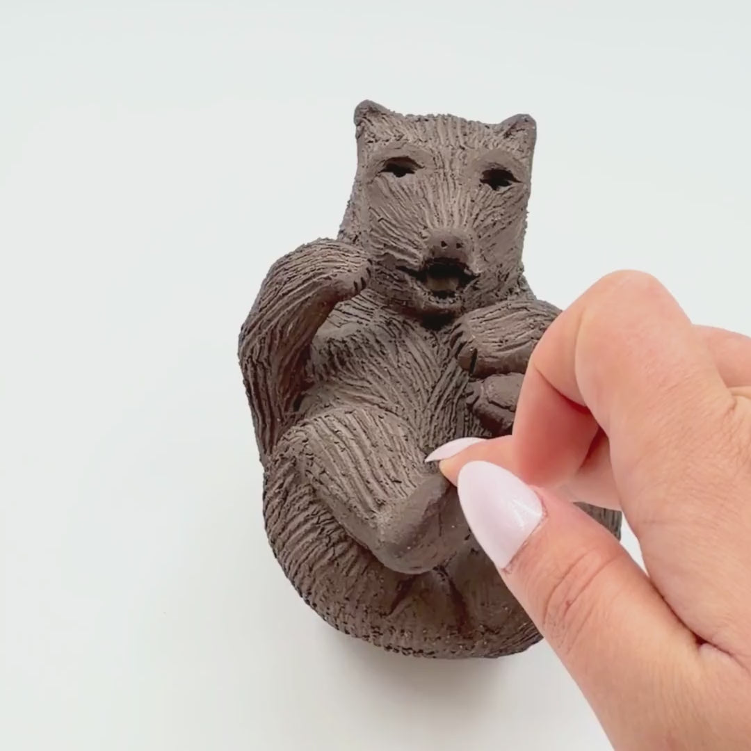 Charming vintage bear sculpture hand-carved from clay, signed “SM” in 1982. This piece showcases natural textures and craftsmanship, making it a unique decorative accent or collectible. The sculpture shows natural signs of age, giving it authentic vintage character. Ideal for collectors, nature-inspired décor, or lovers of Nordic handicrafts.