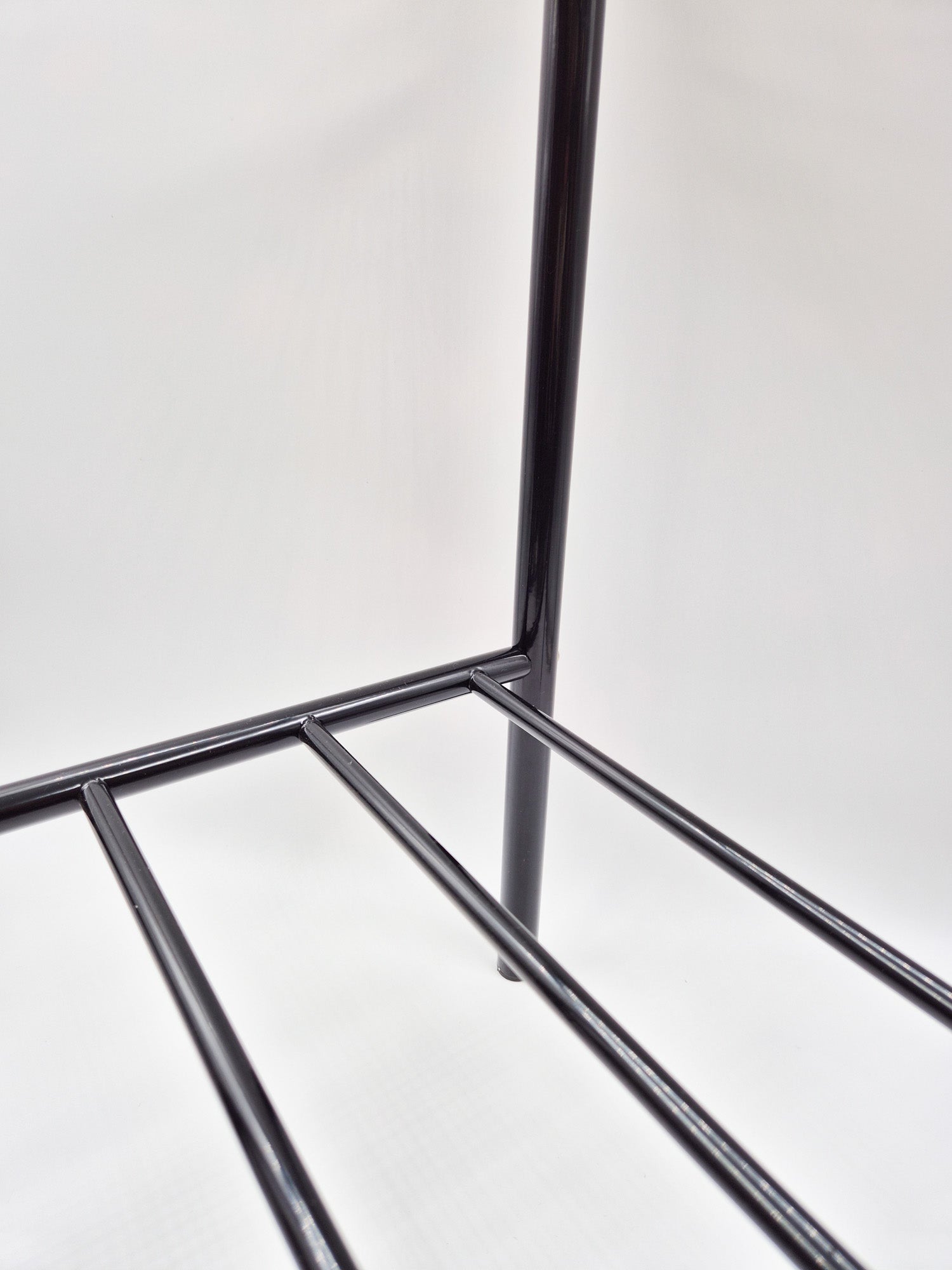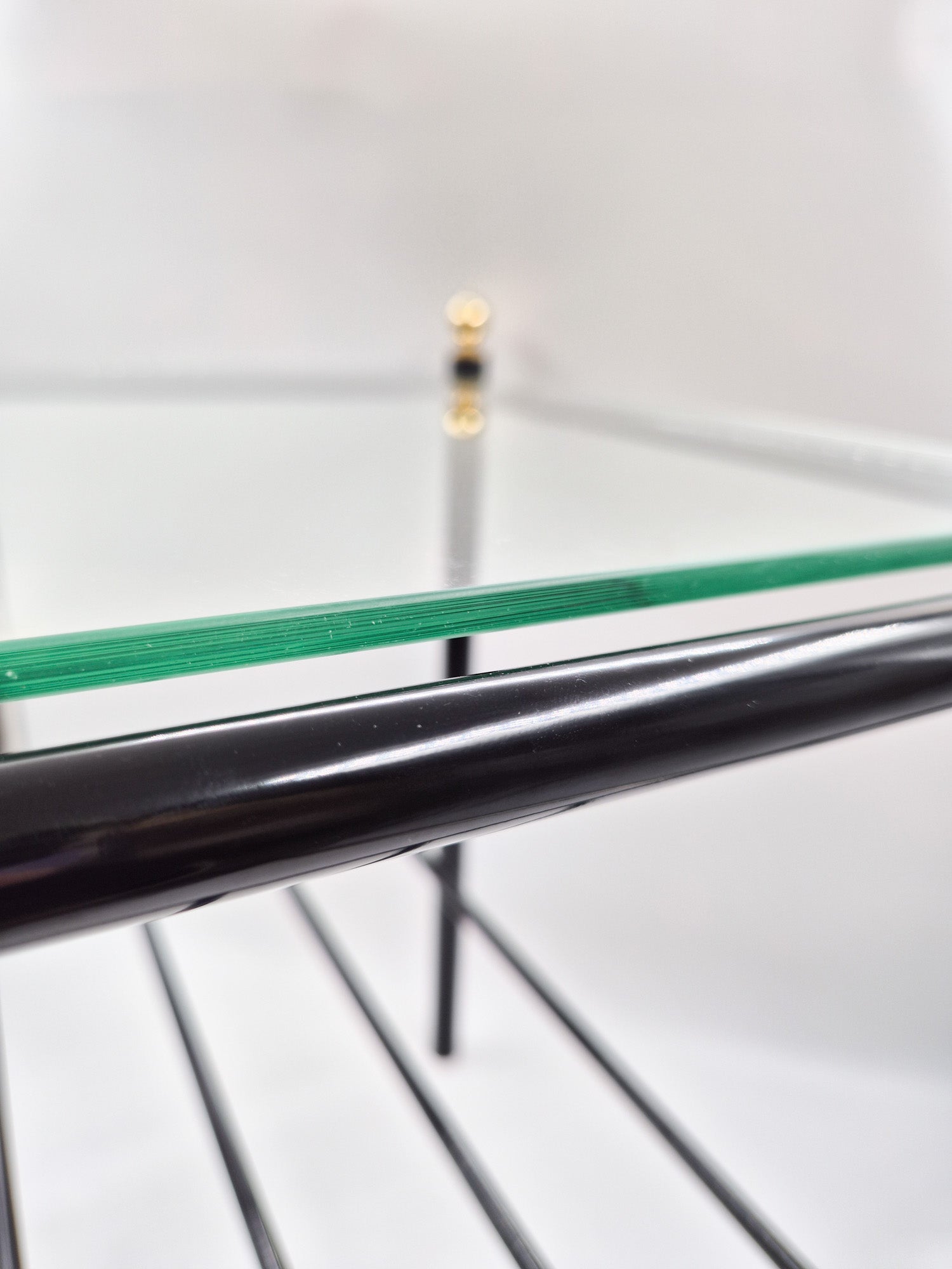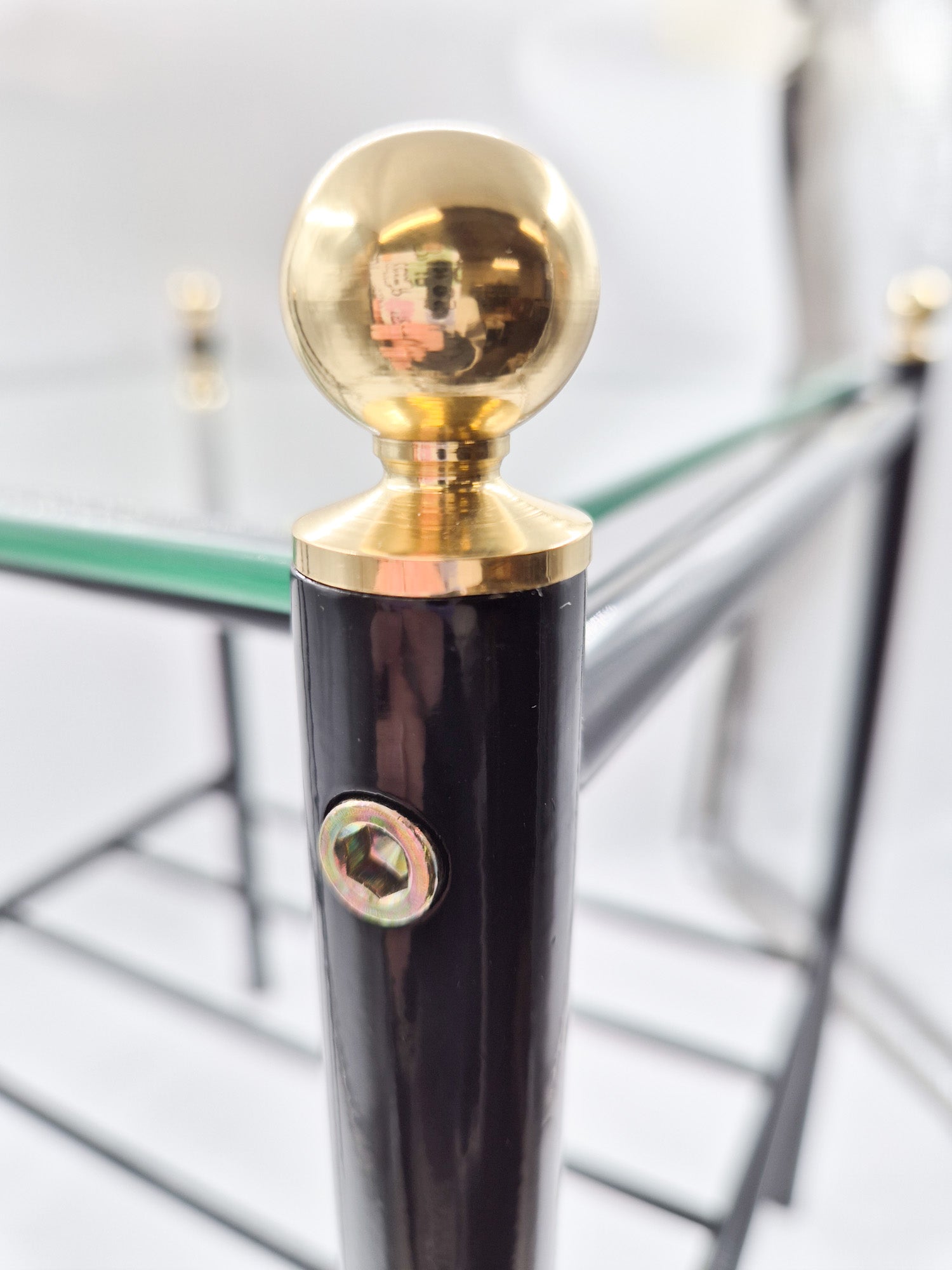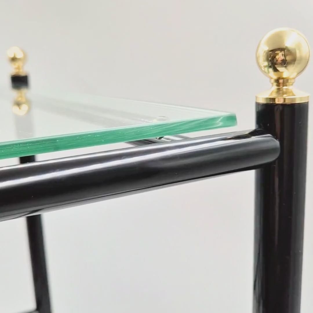 The tables are unused and preserved in excellent vintage condition, having been stored for decades in their original factory packaging. The table features a black metal frame, a glass tabletop, and refined golden brass details that bring warmth and contrast to the minimalist structure. The combination of materials is both functional and elegant robust metal, light-reflecting glass, and timeless brass accents.