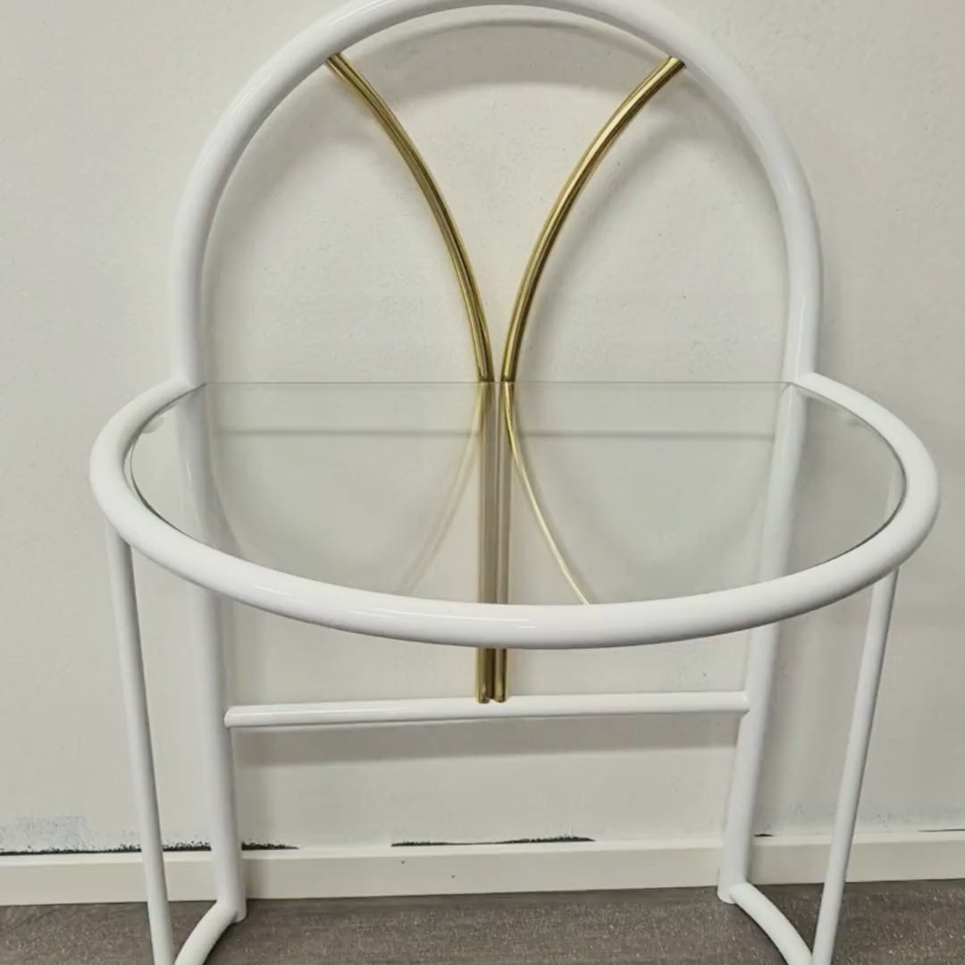 The design features white metal frames, glass tabletops, and elegant brass details that form a gentle, architectural structure above the surface. The curved lines and brass elements introduce a lighter, more decorative character while remaining grounded in functional Finnish design principles.