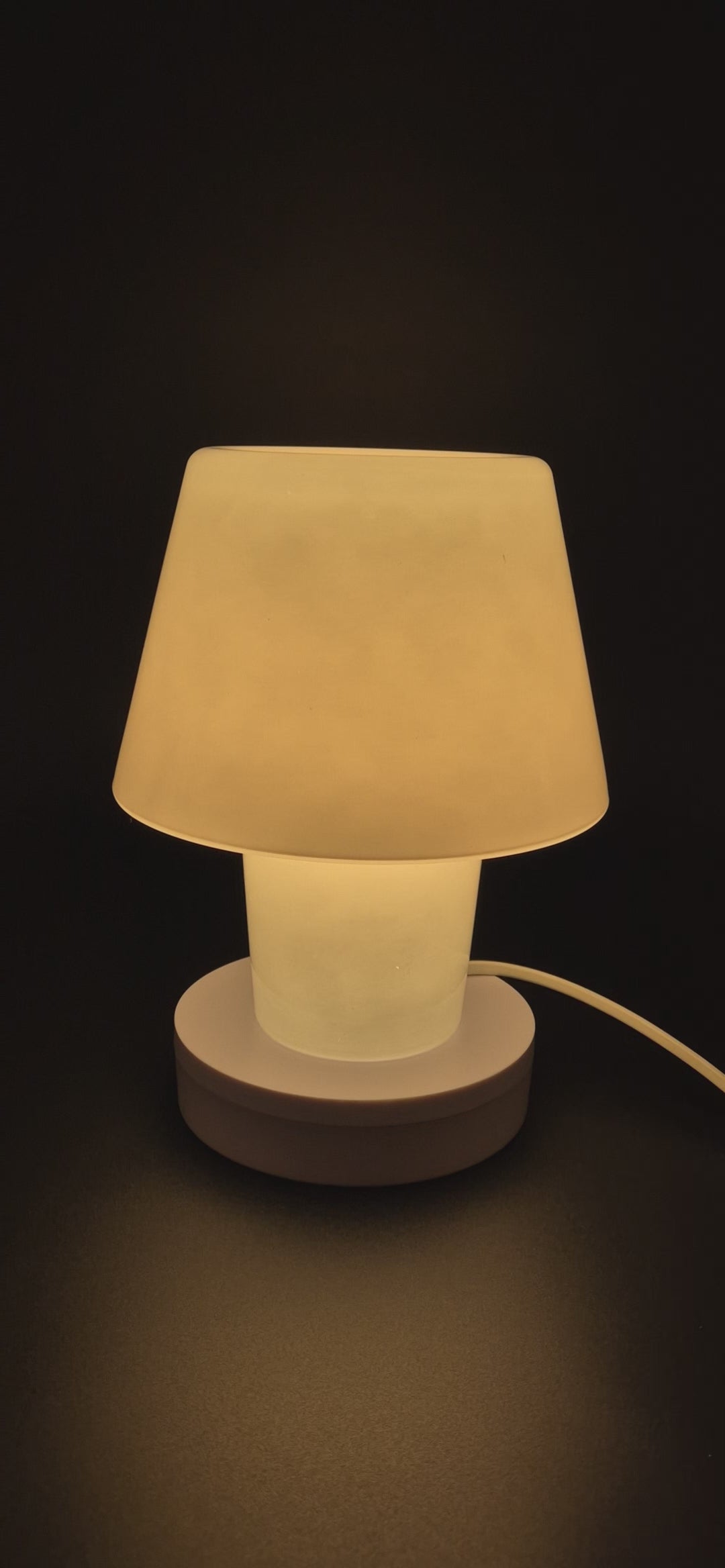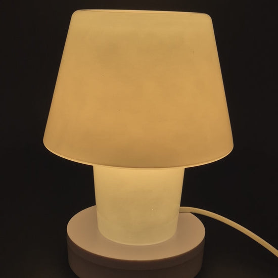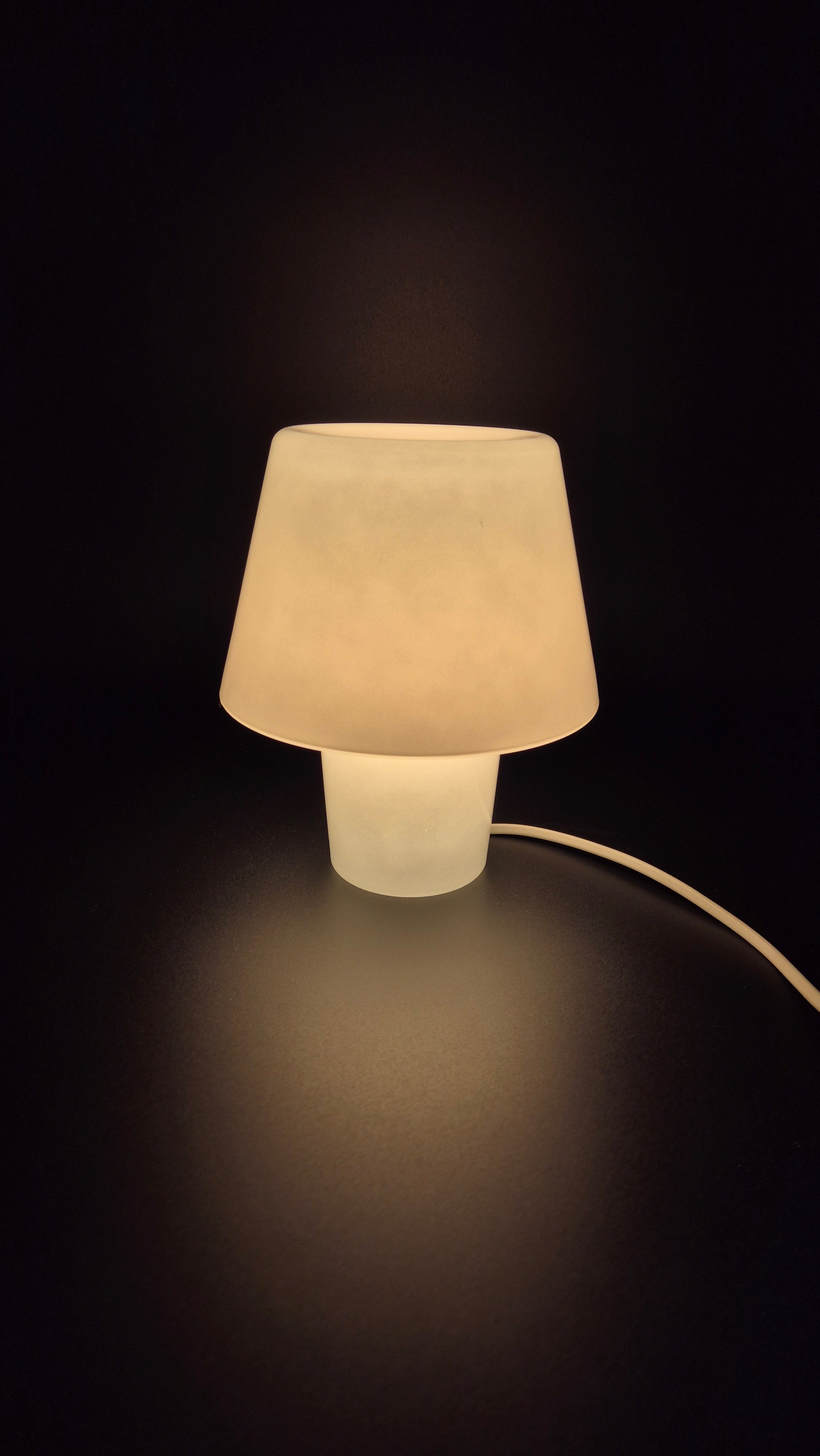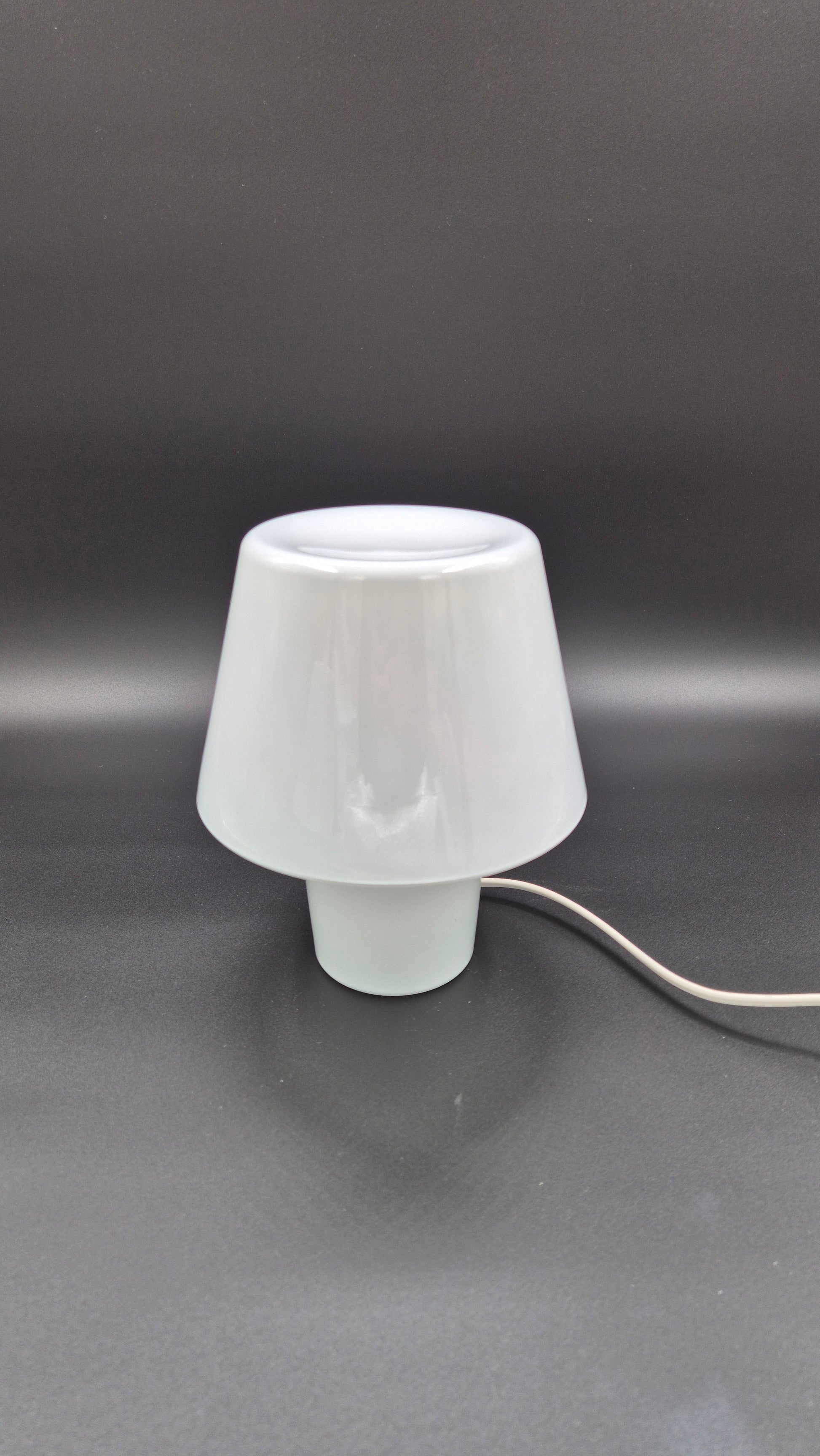 Designed by Helena Svensson in the 1990s. Crafted from opal or colored glass, the lamp features a classy mushroom shape, combining both the base and shade in a seamless, fluid design. When lit, the overlapping glass shade and foot refract light beautifully, creating soft, warm shadows and a cozy ambiance.