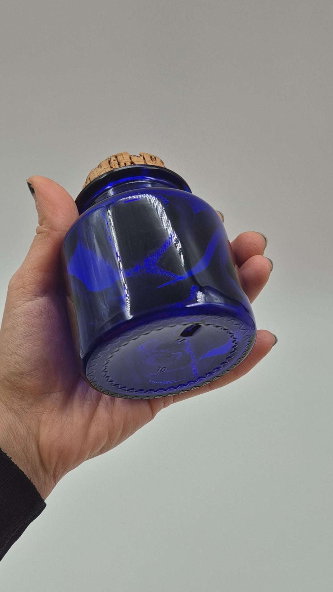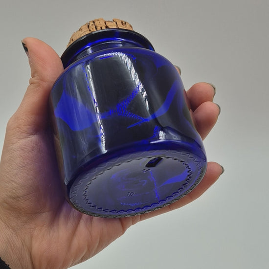 Standing at 9 cm tall with a 7 cm diameter, this compact jar is crafted in a rich deep blue pressed glass and topped with its original natural cork lid. The minimalist design and saturated color make it a perfect accent for open shelves, bathrooms, kitchens, or even a curated vintage glass collection.