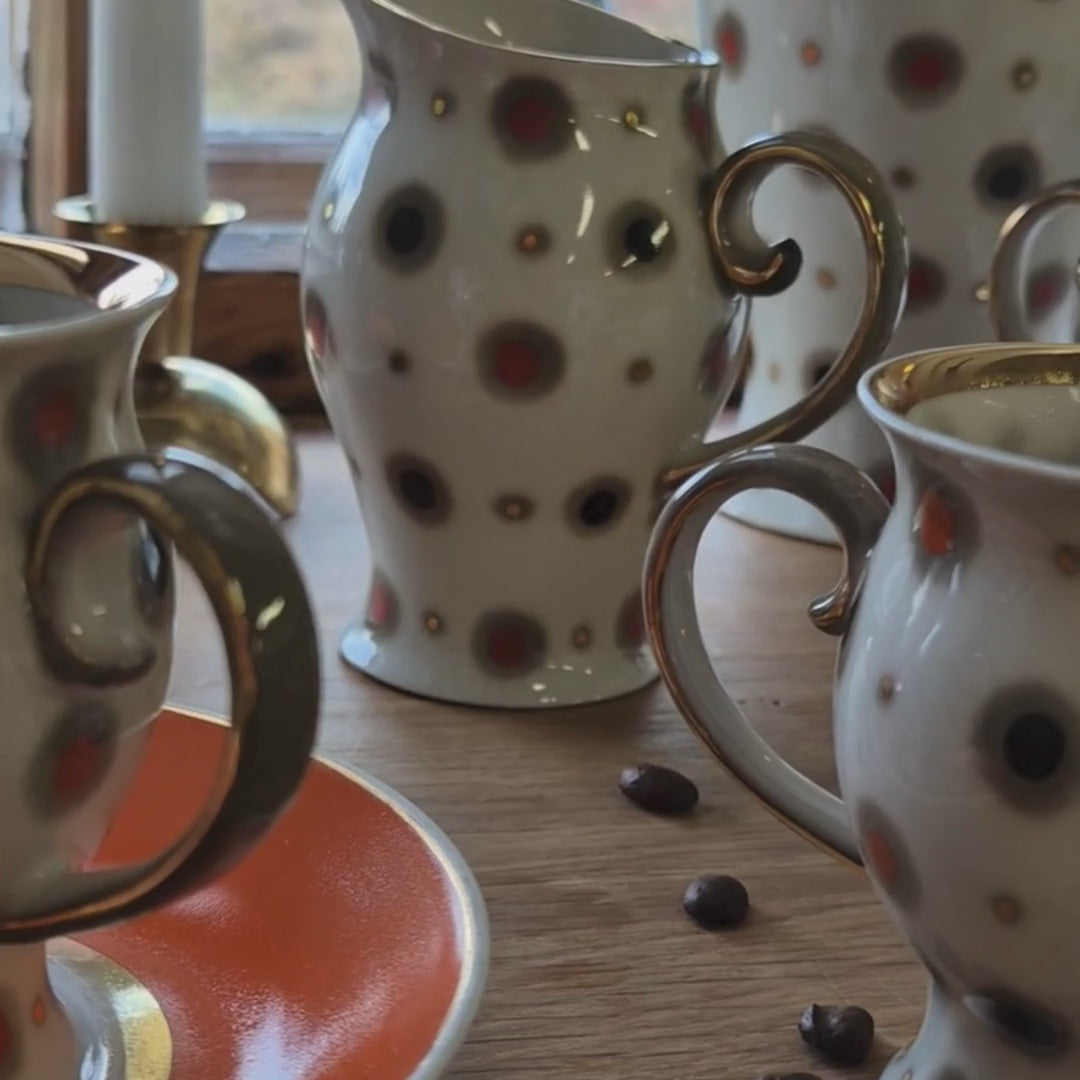 This exquisite vintage set includes 5 coffee cups with matching saucers, crafted in Novgorod, Russia during the Soviet era. Each piece showcases classic porcelain craftsmanship with elegant designs, perfect for collectors, enthusiasts of Soviet-era tableware, or anyone looking to add a touch of vintage charm to their coffee rituals.